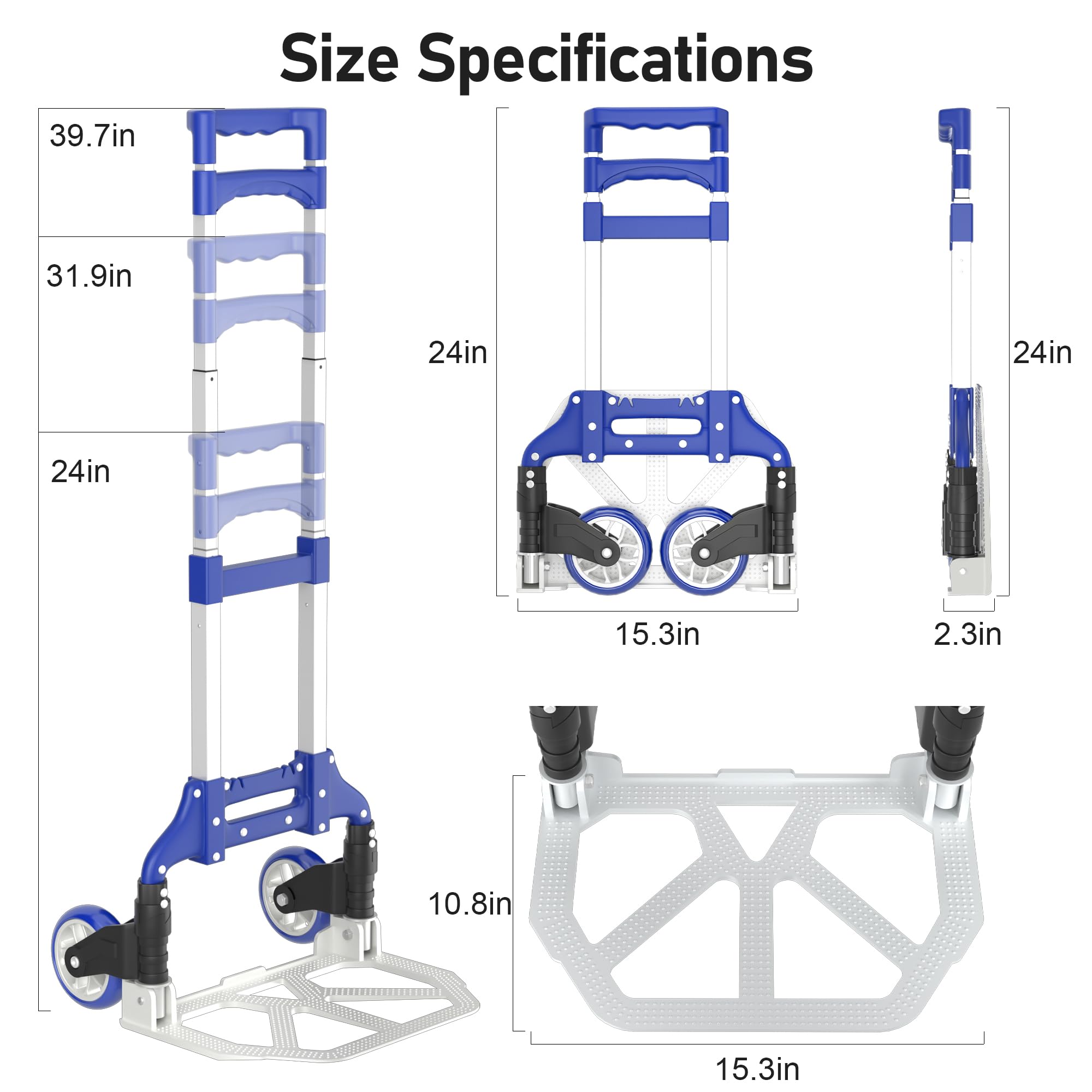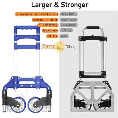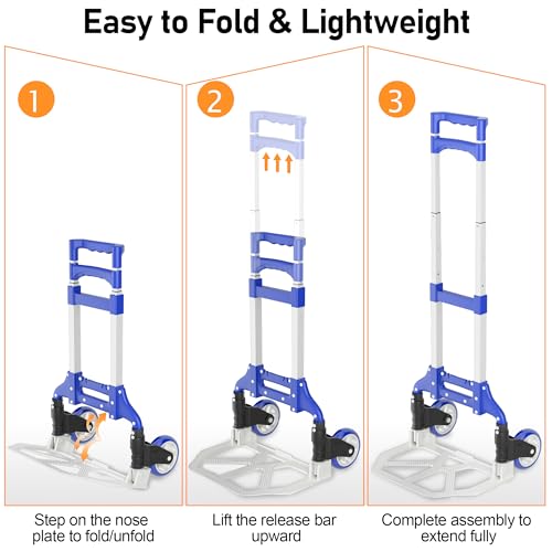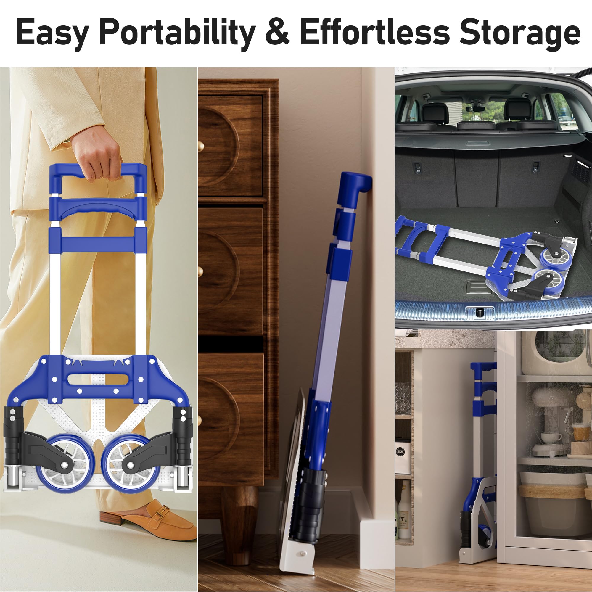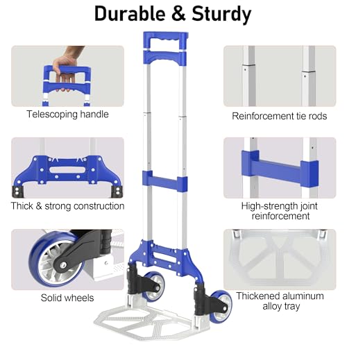 Folding Hand Truck - Aluminum Portable Dolly Cart with Telescopic Handle, Bungee Cord - Compact Lightweight Foldable Luggage Cart for Moving, Home, Auto, 180lbs, Blue