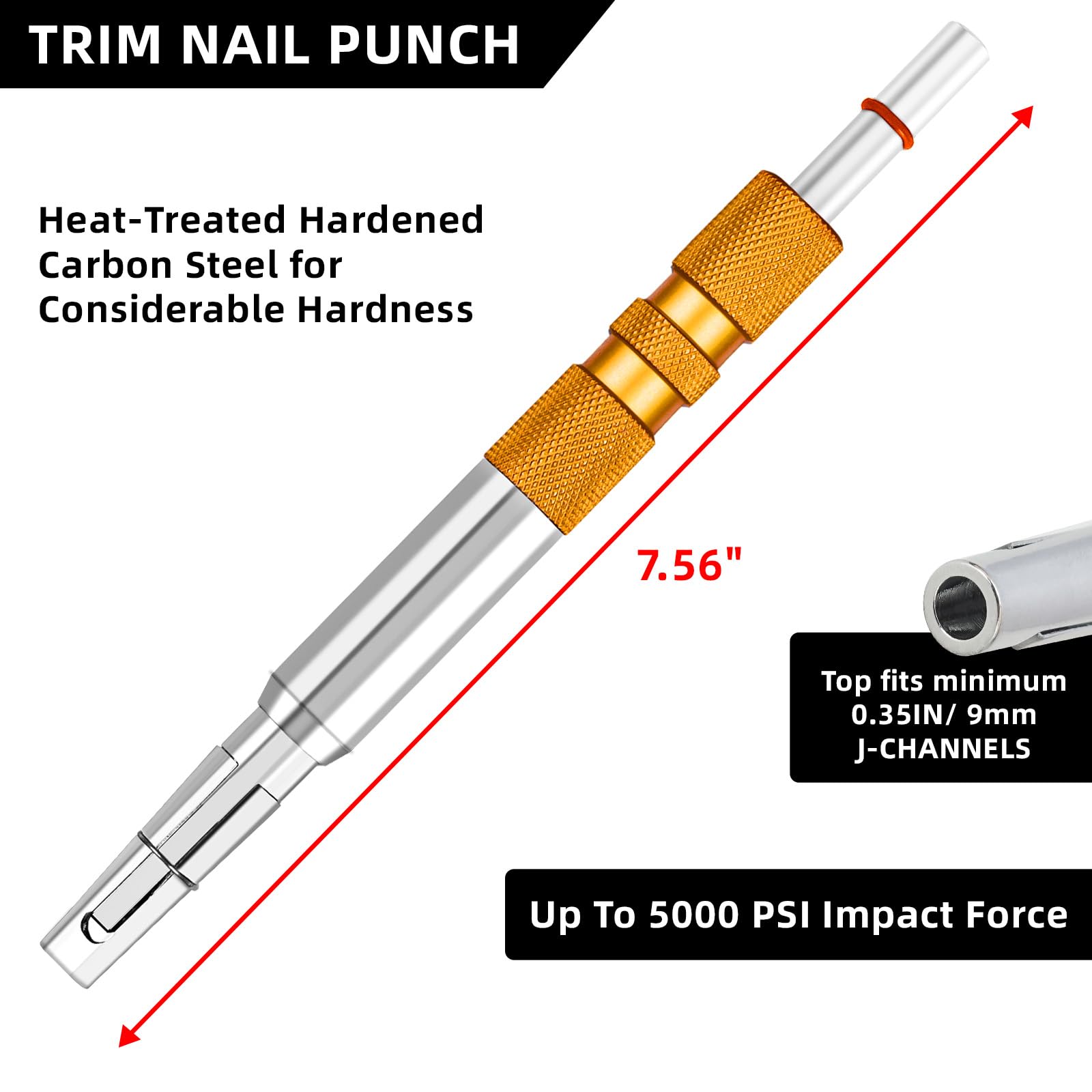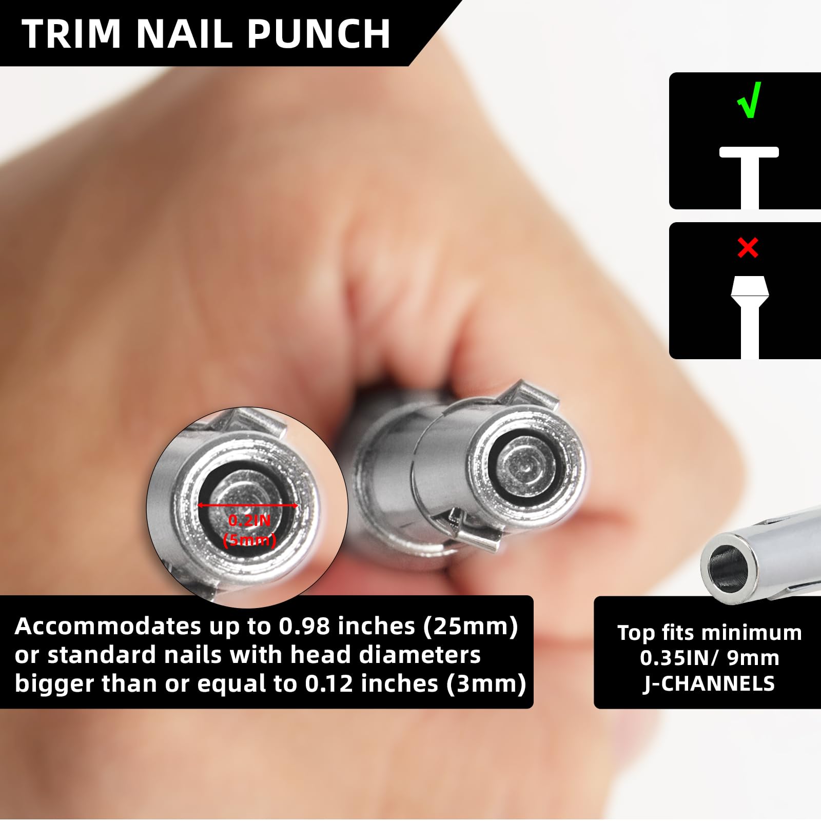 2. Design : The rubber ring collar of the punch set is designed to stop the force when the trim nail is already fully in. The retaining clip on the punch tool is designed to hold the trim nail firmly in place while positioning the punch, minimizing scratches and dents caused by sliding nails. Mesh design increases friction and makes the trim nail tool easy to grip, making it less likely to slip and avoiding potential injuries.