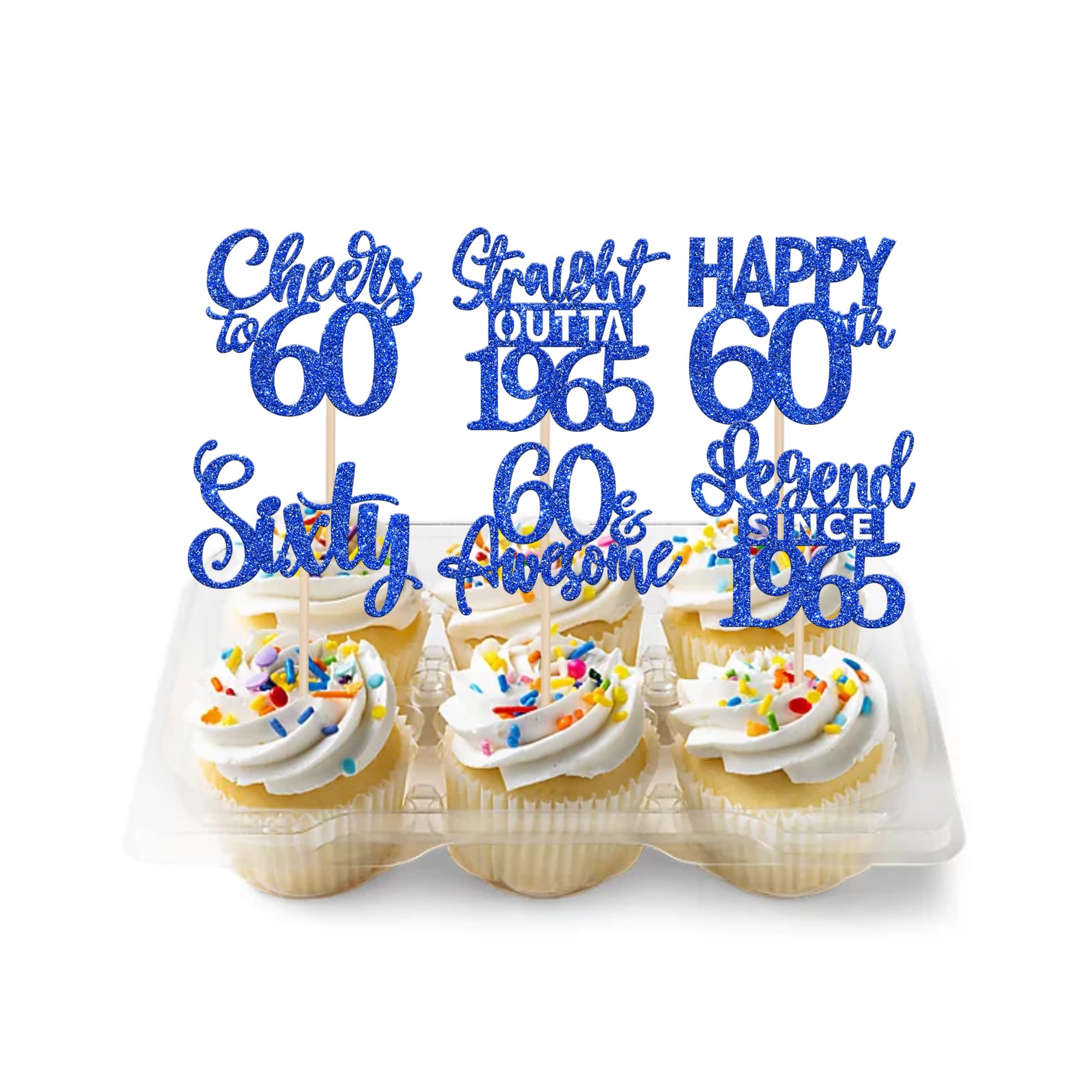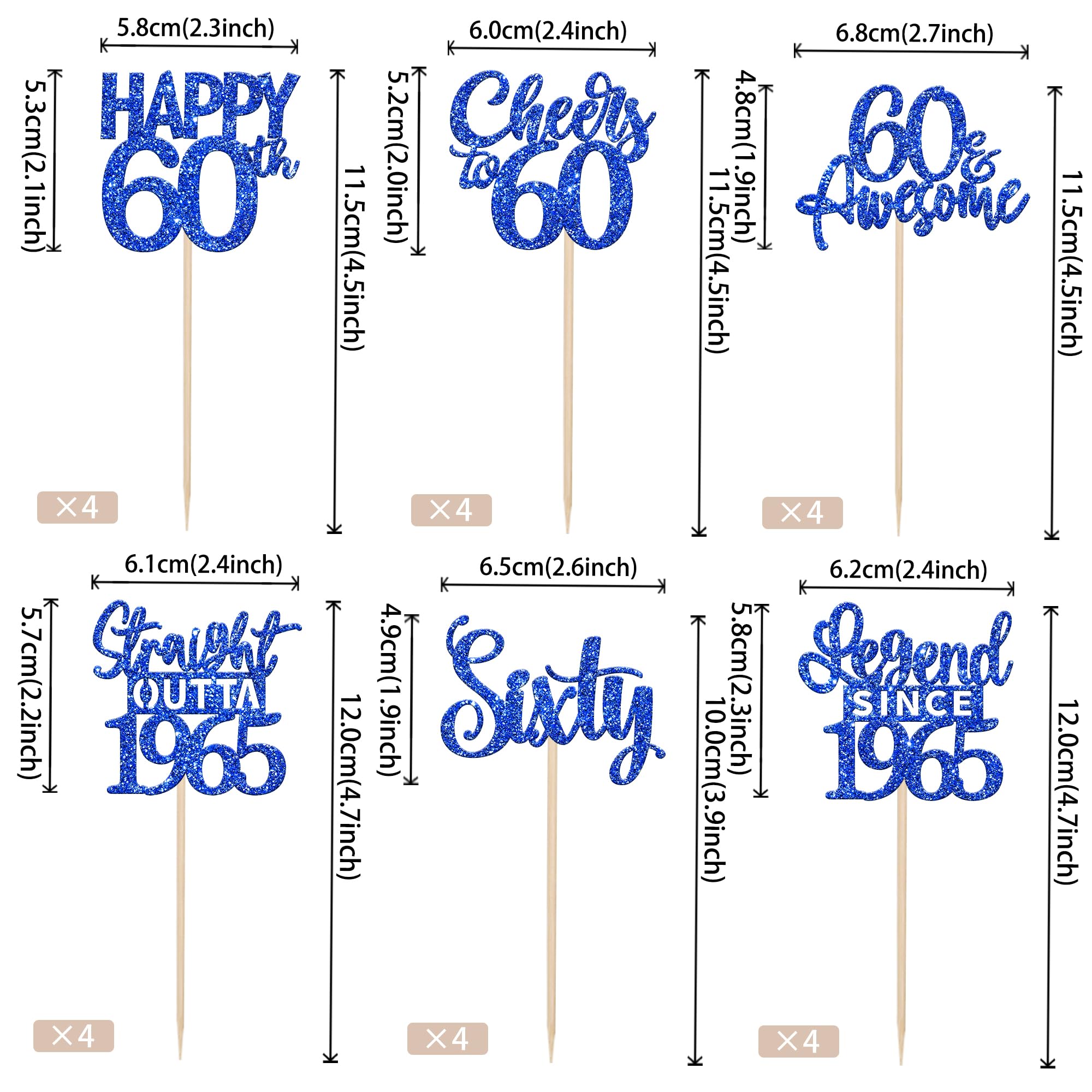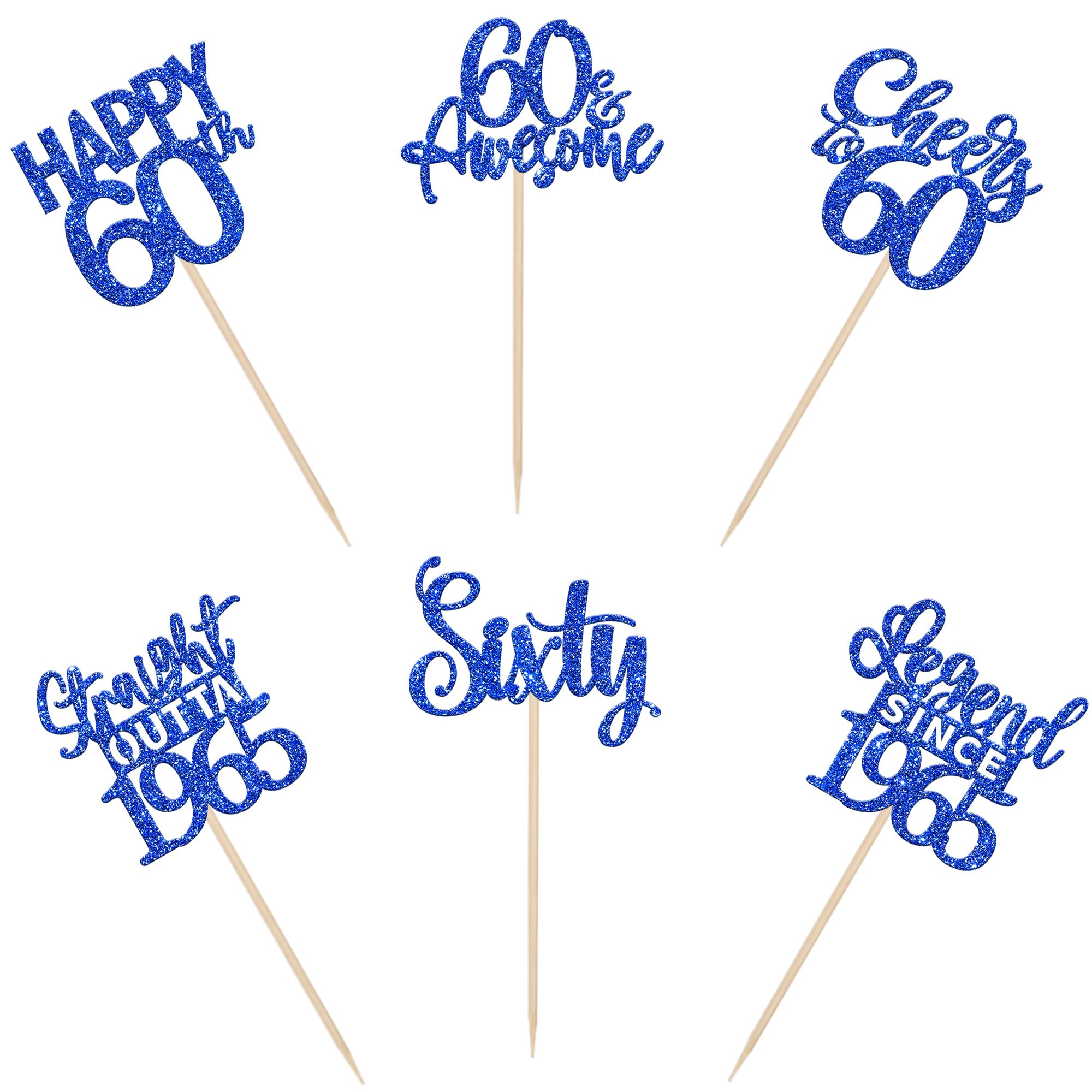 24PCS Happy 60th Birthday Cupcake Toppers Sixty Straight Outta 1965 Cupcake Picks Cheers to 60 Birthday Decorations Lengend Since 1965 Cupcake Decorations for 60th Birthday Anniversary Party Cake Decorations Supplies Perfect for legend since 1965 theme party, 60th anniversary theme party,cheers to 60 years theme party, 60 awesome theme party cupcake decorations supplies. Pack of 24 pcs,4 pcs of each design. The size is 2.9*4.5/ 2.4*4.5/ 2.7*4.5/ 2.4*4.7/ 2.3*3.9/ 2.4*4.7 inch ( with stick ) Made of high quality paper card stock,thick and sturdy. These straight outta 1965 cupcake toppers are one side glitter, another side is white, and they are intended for decoration only, please do not put them in oven or microwave. If the item you received has any defects, please contact us immediately.we will deal with it within 24 hours.