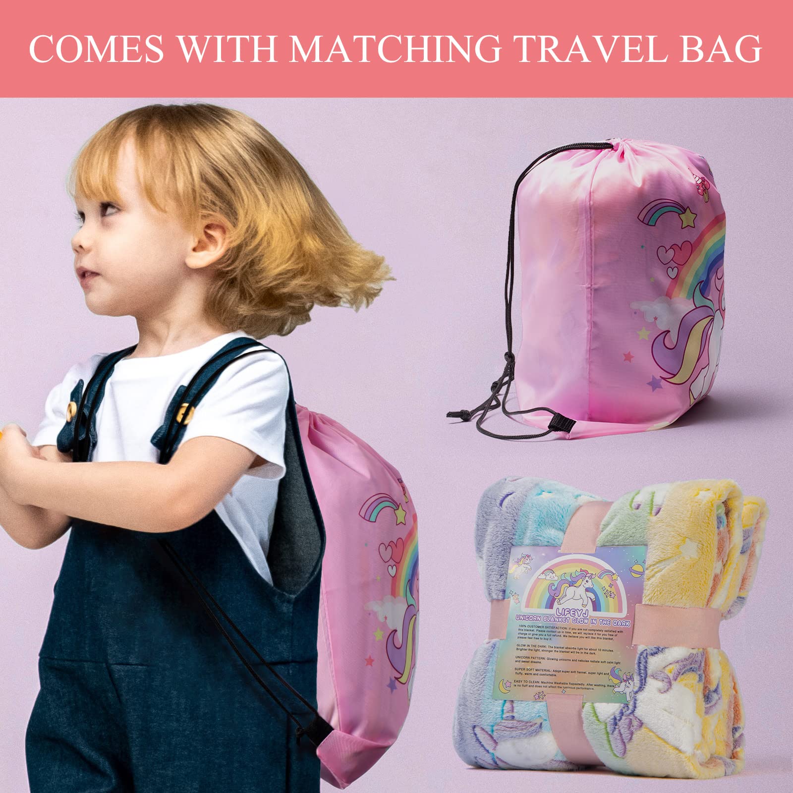 Unicorns Gifts for Girls: As a unique gifts for girls kids, the glow in the dark cute stuff rainbow blanket can light up the stars at night for teen girls kids, whether it's birthday, Christmas, Halloween, Easter, Thanksgiving, or any other unicorn party supplies come surprise. It's also girls toys 8-10 years old. Soft unicorn blanket with pink unicorn travel bag is undoubtedly the best cool things partner for camping, gathering, and picnics