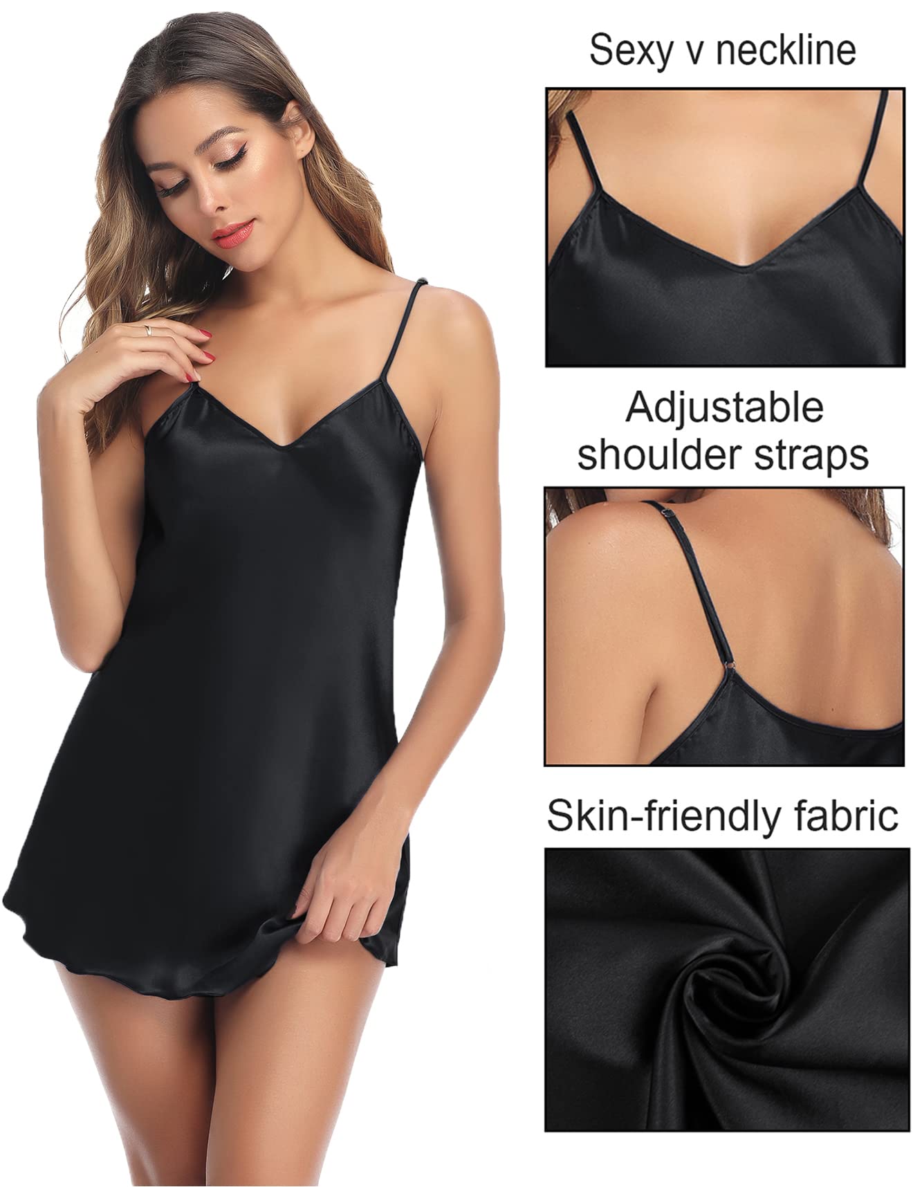 Features: Full slip chemise nightgown sleepwear with adjustable spaghetti strap to create a casual and sexy look, deep v neck, ruffle hem,a-line style, simple and stylish designs make this satin mini dress looks more elegant and charming