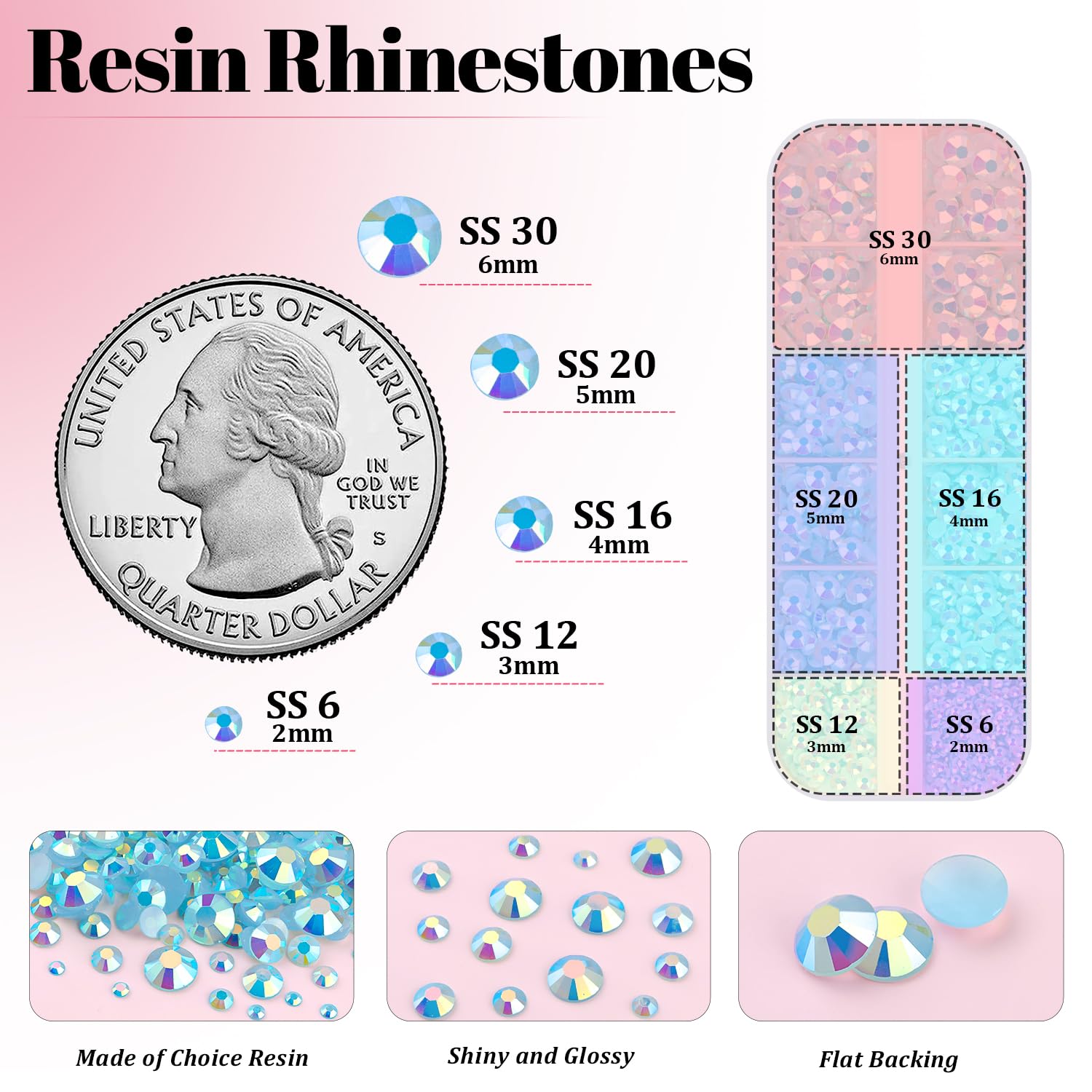 WHAT YOU WILL GET -- The package includes 1 box of flatback rhinestones with 12 grids in different sizes. 1 tweezers for large-size gems, 1 pickup pen for small-size gems. 3 B7000 adhesive jewels glue for jewelry making. This rhinestone kit makes it easy for you to make any craft you like, and will bedazzle your artworks! CHARMING GEMS FOR CRAFT -- These high-quality flatback bling diamonds are made of choice resin, so they are very lightweight, durable, and cost-effective. Their perfect cutting facets, delicate and exquisite shine, will make your handicrafts more dazzling and eye-catching. Our store also offers a variety of colors, which will give your crafts more possibilities. STRONG B7000 GLUE FOR GEMS -- These Non-Hotfix rhinestones are not self-adhesive and need to be used with glue. The equipped B7000 glue has strong adhesion and dries clear. It has a precision needle for easy application. For first use, you can leave the glue head up for a few minutes before opening to avoid overflow. After using, the needle needs to be cleaned with an alcohol wipe to avoid a mess. TIPS FOR USE -- Our flatback rhinestones are non-hotfix and need to be used with glue. To apply the resin rhinestones, first, clean the surface of your crafts or your nail you wish to embellish. Then, apply the rhinestones with the appropriate glue and wait for them to dry. Once the glue is completely dry, it will stick firmly to your crafts or nails, making your artwork more sparkling! WIDE APPLICATION -- These sparkling iridescent resin crystals are perfect for creating dazzling looks. Use them for bedazzling DIY crafts like shoes, tumblers, mugs, bottles, phone cases, popsockets, scrapbooks, photo frames, diamond paintings, greeting cards, bags, glasses, guitars, keychains, hats, masks, hair clips, bracelets, wristbands, clothing, wedding dresses, and more.