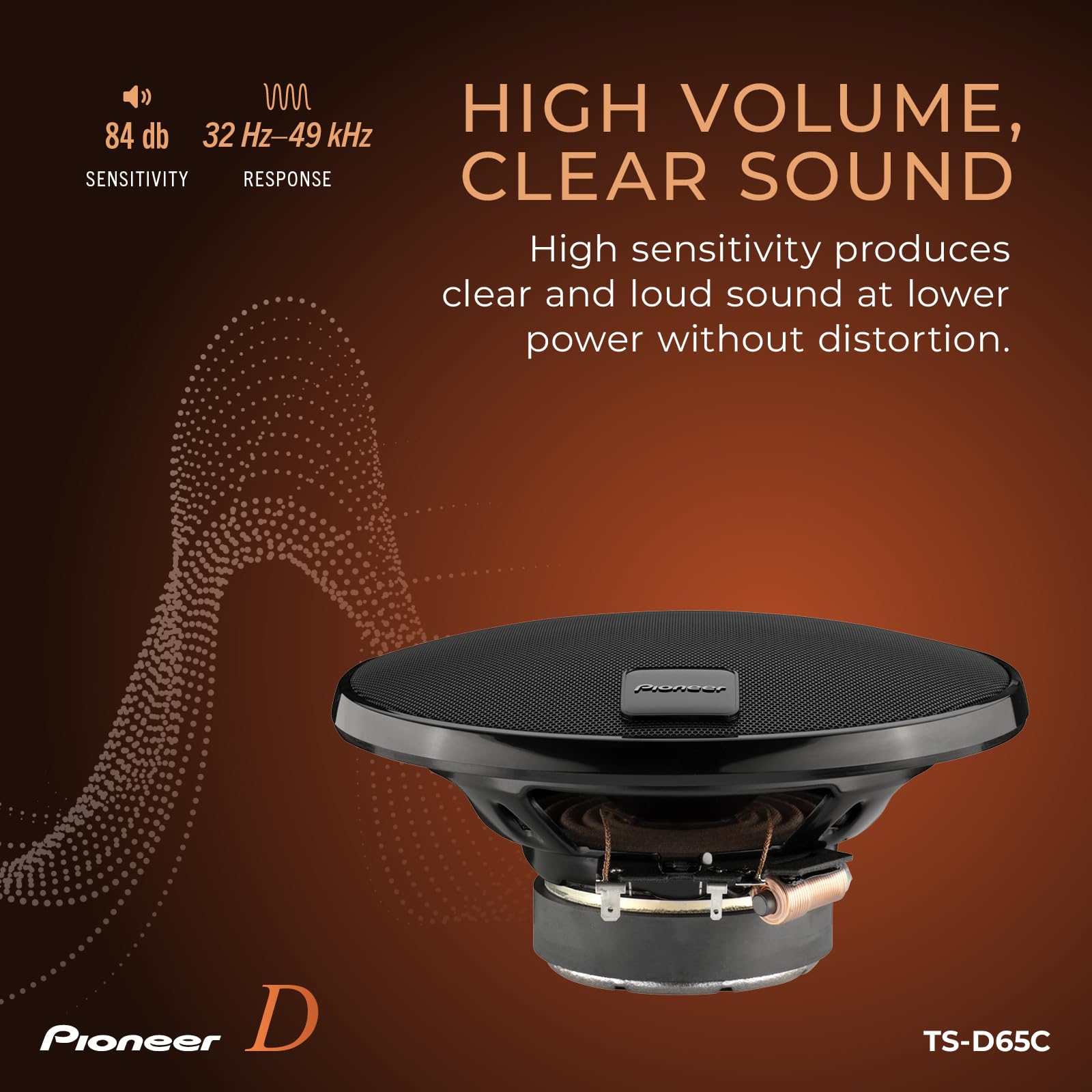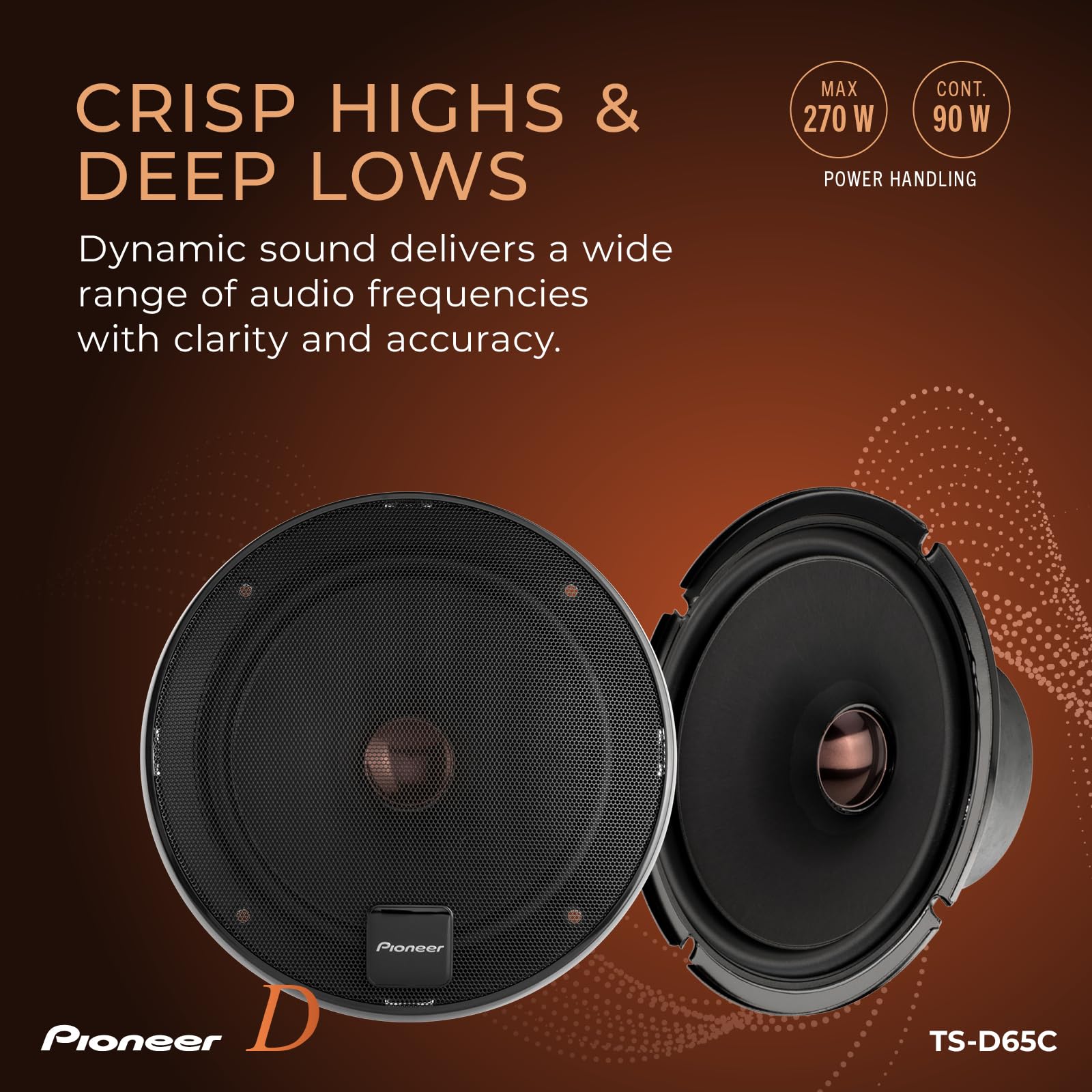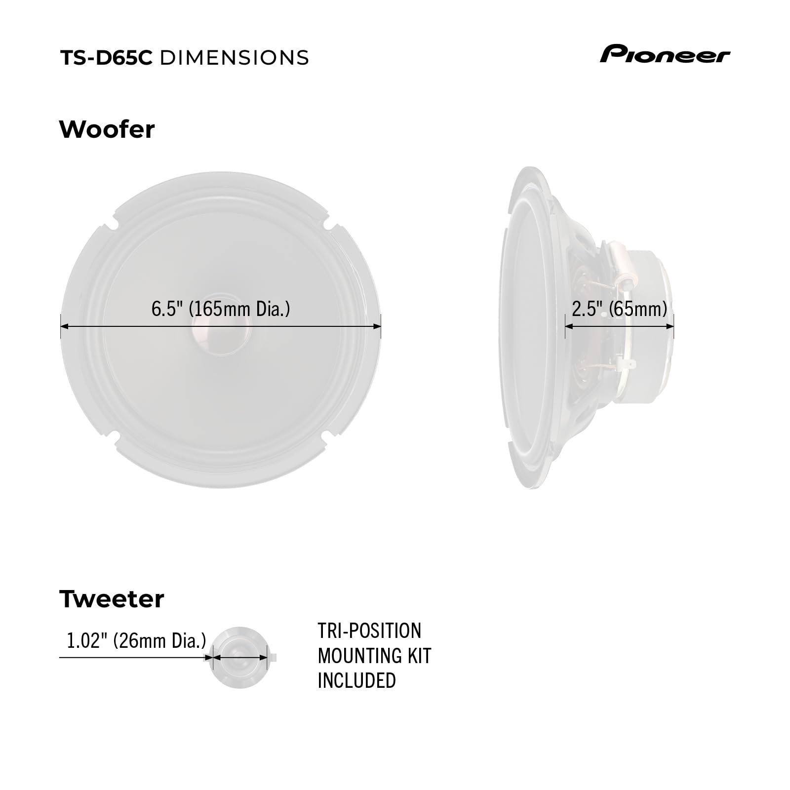 Upgrade your car's audio system with the Pioneer TS-D65C 6.5” 2-Way Car Speakers. These speakers are designed to deliver enhanced sound quality and performance, allowing you to enjoy your favorite music like never before. These speakers are a popular choice for many car models. To ensure installation flexibility, the D component system tweeters are extremely compact and feature a unique swivel mount that allows precise aiming of high frequencies. Pioneer’s tri-position mounting kit (included) provides the flexibility to mount the tweeter using a variety of methods; flush mount, surface mount or bracket mount, especially important for concealing the tweeter behind an original equipment tweeter grille in the vehicle dash or door. With a maximum power handling of 270 watts and a continuous power handling of 90 watts, the TS-D65C can handle higher power levels, allowing you to enjoy louder and more dynamic audio. The speakers are designed to deliver impressive volume levels without sacrificing clarity or causing distortion. Upgrade your car's audio system with the Pioneer TS-D65C 2-Way Component Speaker System. Experience improved sound quality, enhanced bass, and clear vocals, bringing your music to life on the road. Enjoy the Pioneer quality and elevate your in-car audio experience.