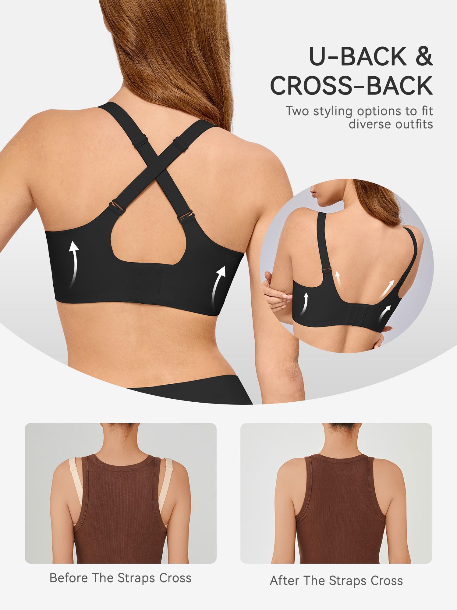 INVISIBLE U-BACK AND CROSSABLE STRAPS: These wireless bras for women comes with adjustable elastic straps that you can cross to achieve a better lift, paired with four rows of three-button hooks that allow you to customize the fit to your body shape. With a U-back design and wide side straps, this seamless bras helps to conceal underarm bulges and back fat for extra support and a smoother silhouette, making it one of the best bras to hide back fat.