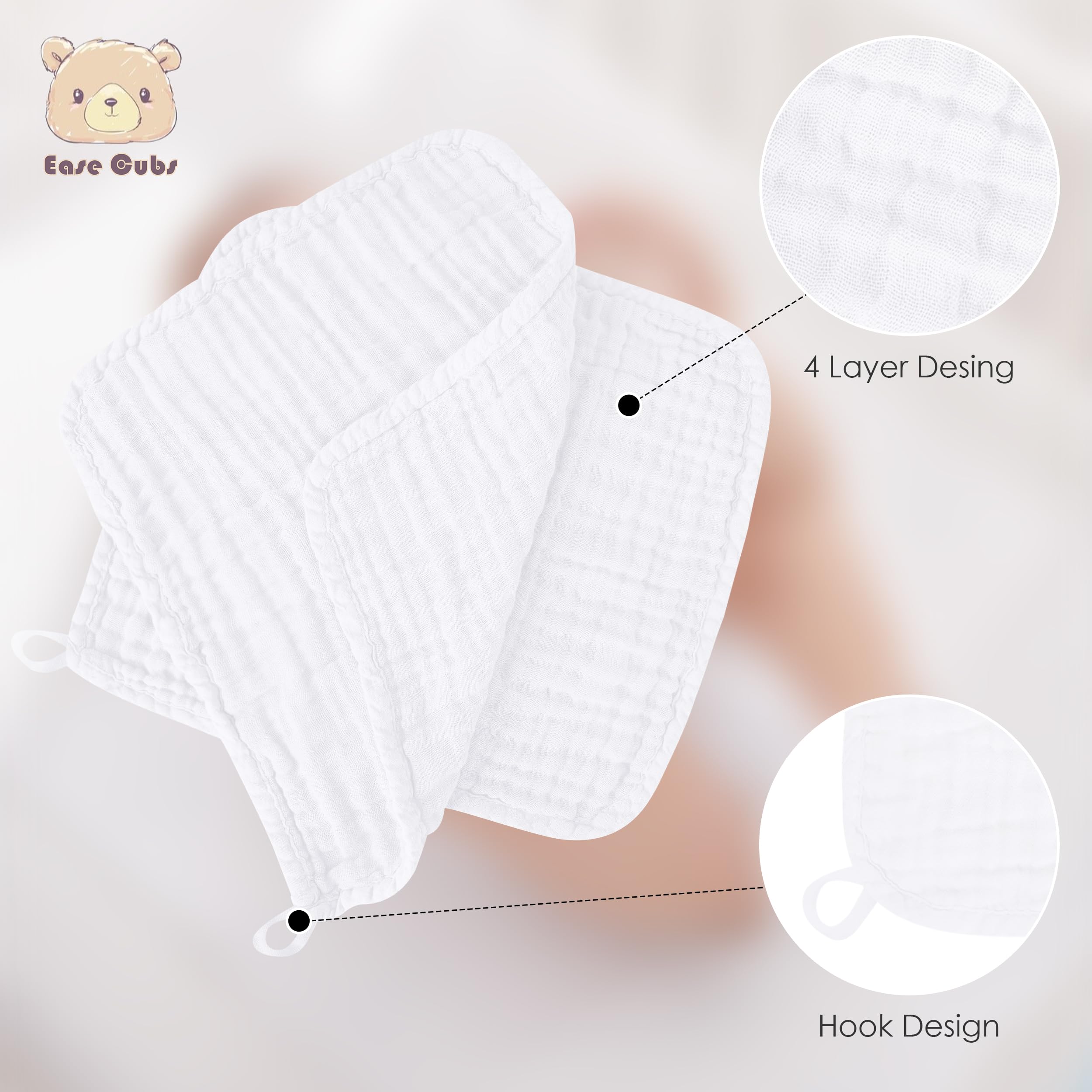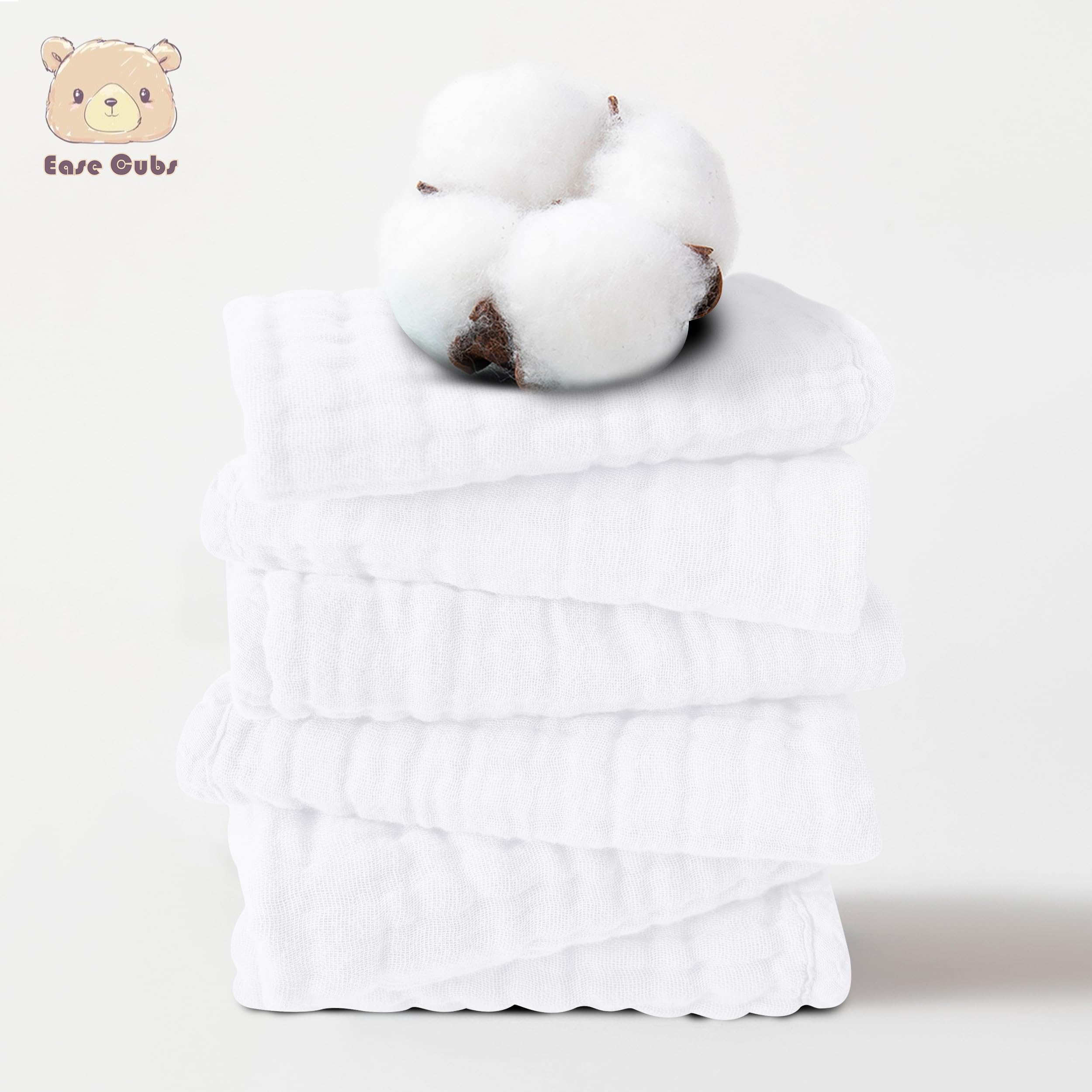 Ease Cubs 12 Pack Muslin Baby Washcloths - 12"x12", White