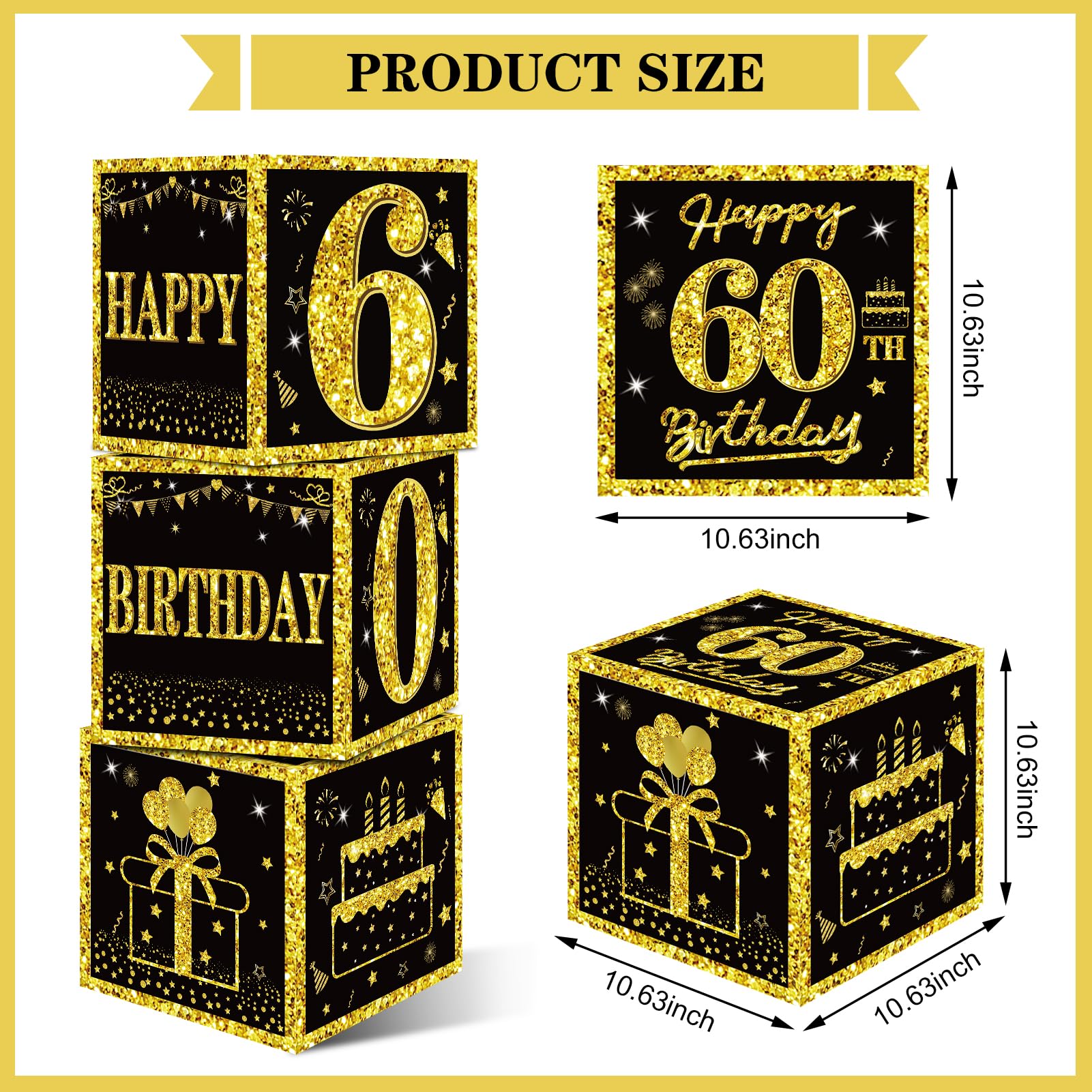 [You Will Receive] -3pcs black gold 60th birthday balloon boxes decorations, the size of each box is 10.62×10.62×10.62inch. This set of great 60th birthday party display decorations. (Note: This set of decorations does not include balloons).