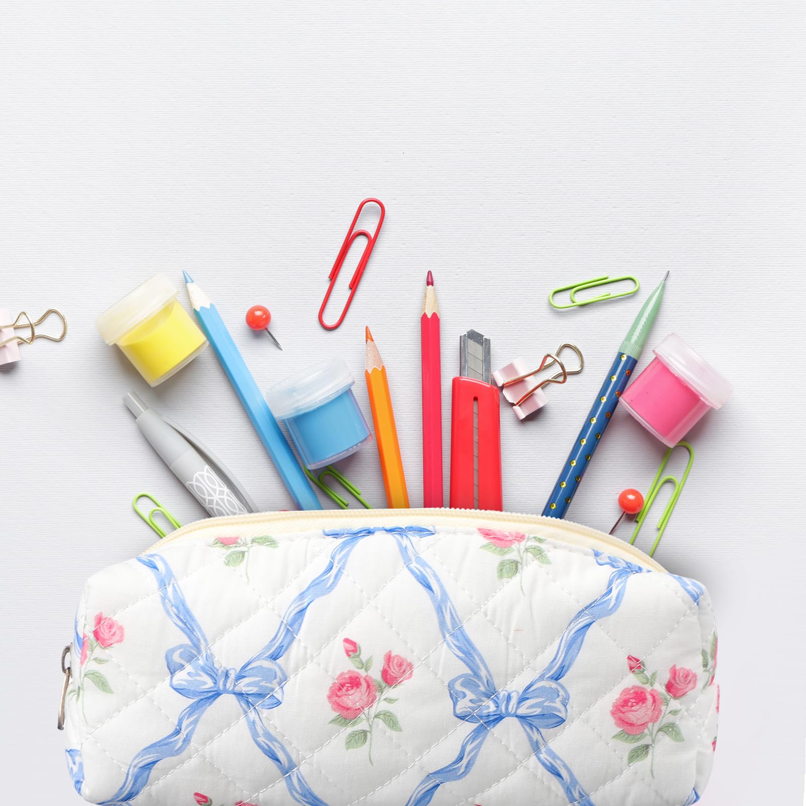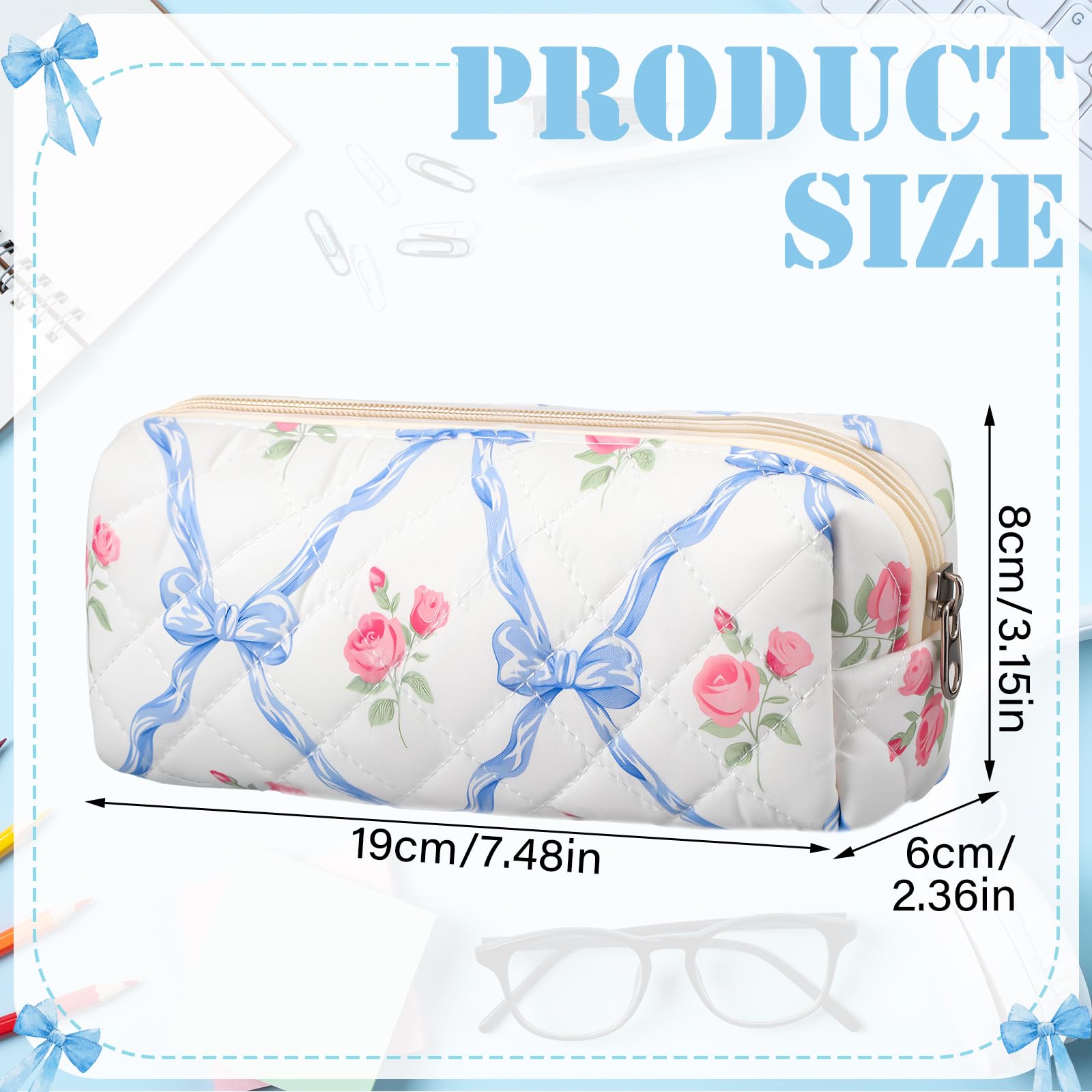 Product Size: the coquette bow pencil pouch boasts a size of 7.48 x 2.36 x 3.15 inches, it can store up to 30 pens or 50 pencils; This blue floral bow pencil case is suitable for safeguarding small goods like erasers, keeping your essentials neatly organized