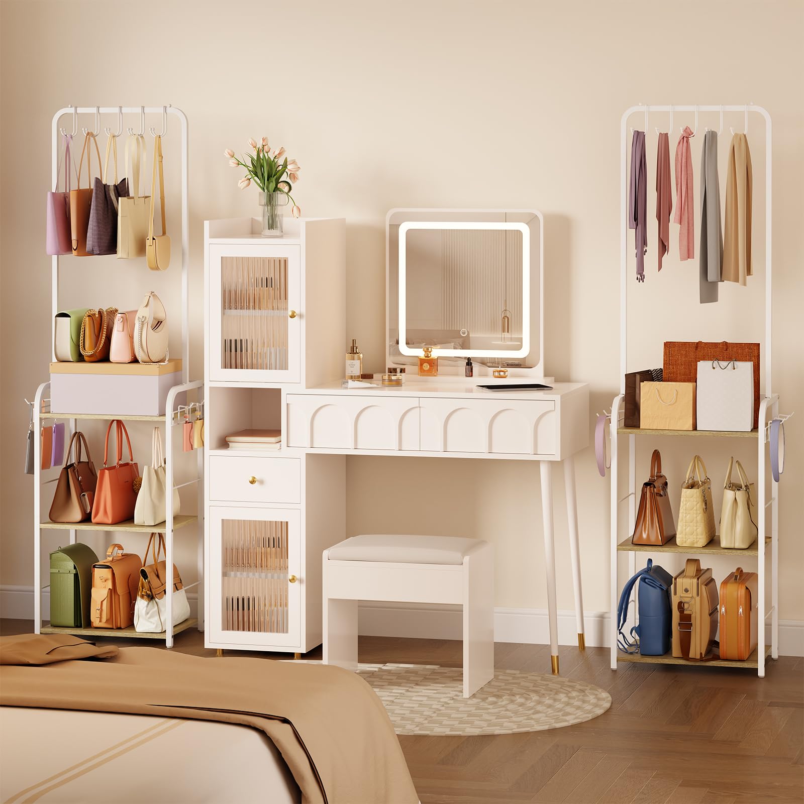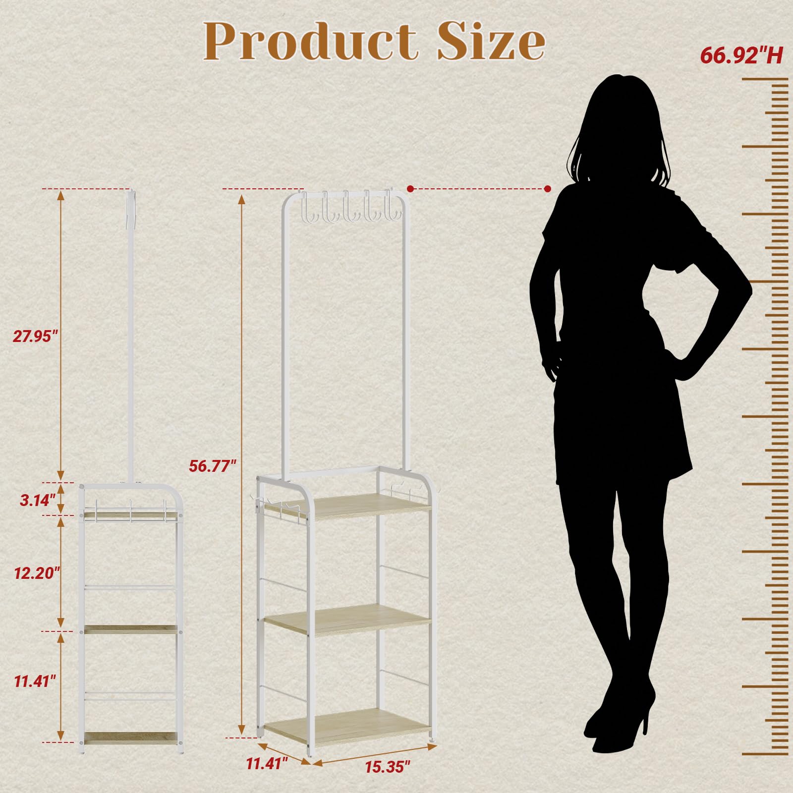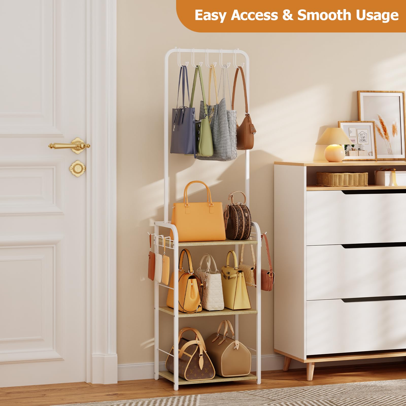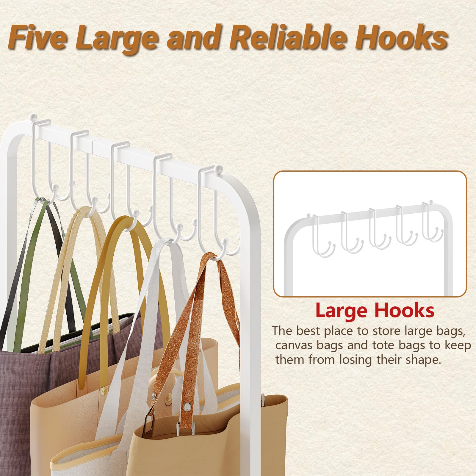 【Multi-Purpose Organizer】The purse organizer for closet can not only organize handbags, but also clothes, scarves, hats, gift bags and shoes, etc. The five purse hangers, six hooks and three tiers of storage shelves provide satisfying storage space for all your essentials. Meanwhile, the assembly of this bag organizer is easy and can be done in no time by following the instructions. Size: 11.41"D x 15.35"W x 56.77 "H.