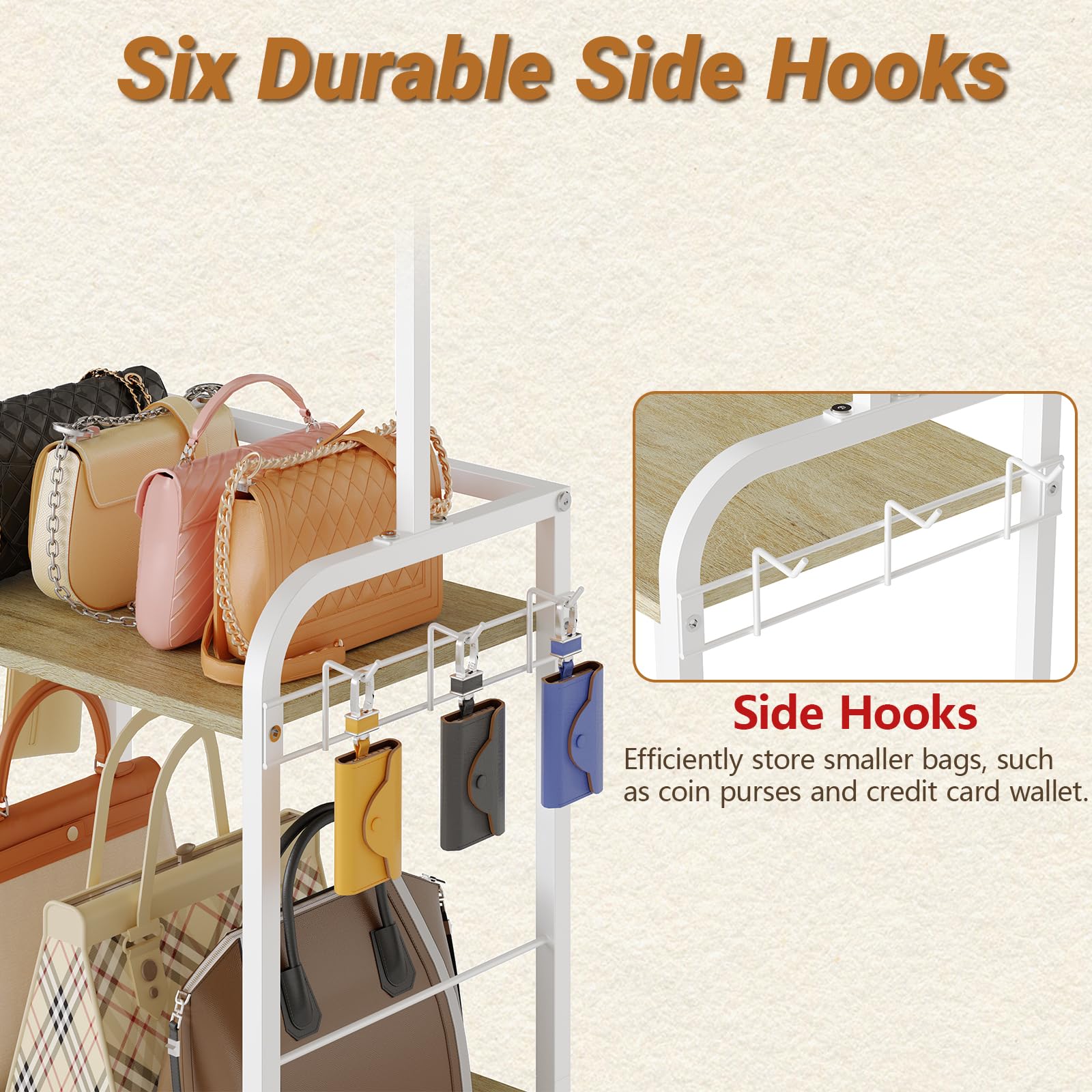 【Holds All your Handbags】The five purse hanger on the top of the purse rack stand can hang longer or larger tote bags, canvas bags, crossbody bags, etc. They keep the shape of the bag and make it easy for you to reach. The three-tier shelves below can hold both large and small handbags, giving you plenty of room to store your entire collection. On the sides, there are six hooks designed specifically for small wallets or cardholders, keeping even your tiniest wallet neatly organized.