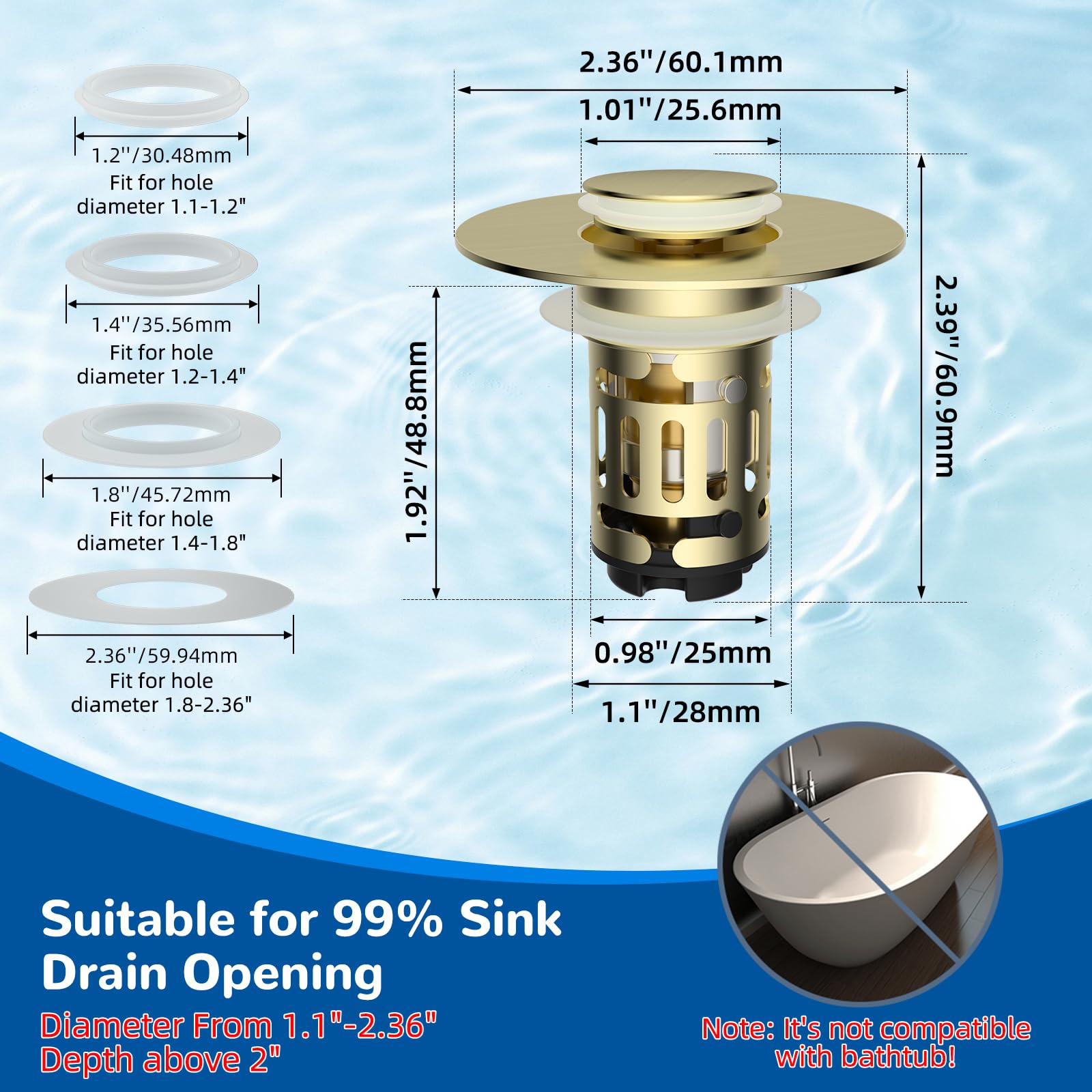 [Versatile Compatibility & Easy Installation] This bathroom sink drain stopper includes four O-rings, which are designed to fit 99% of standard US sink drains, including bathroom sinks and washbasins with drain holes measuring between 1.1" and 2.36". Please measure the sink drain hole diameter before purchasing it for a proper fit. The installation is quick and hassle-free, without the need for expensive tools or plumber fees. Simply remove your old stopper and insert the new one into the drain hole, installation only takes a few seconds