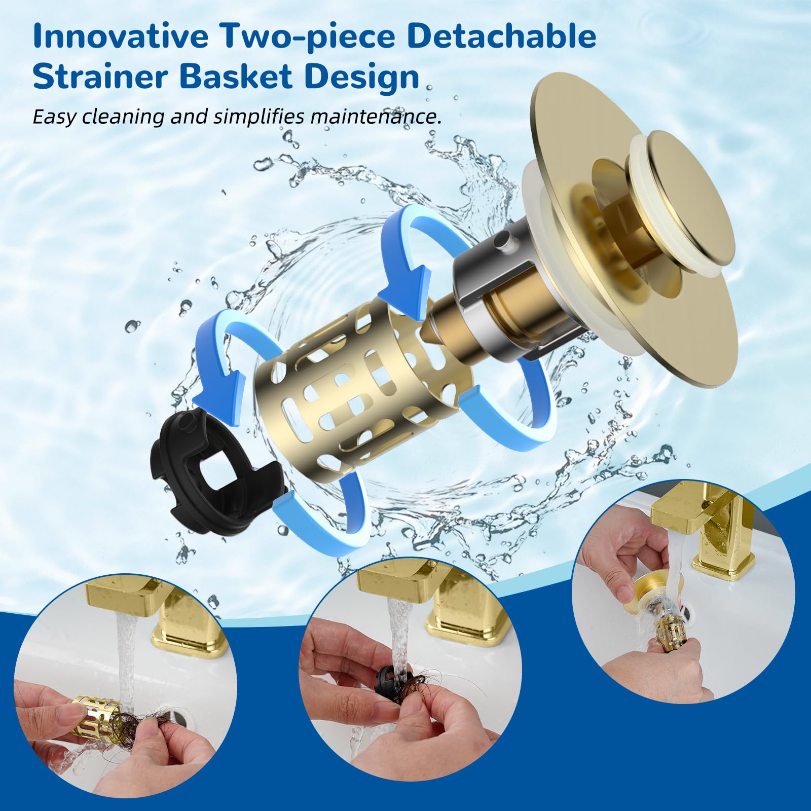 [Easy to Clean] Cleaning is just as easy. The dual-layer removable basket can be easily removed by simply twisting, allowing you to thoroughly clean all components of the drain stopper. Additionally, the basket's detachable bottom design surpasses similar non-removable options, making cleaning more comprehensive and preventing the awkwardness and inconvenience of digging out items by hand