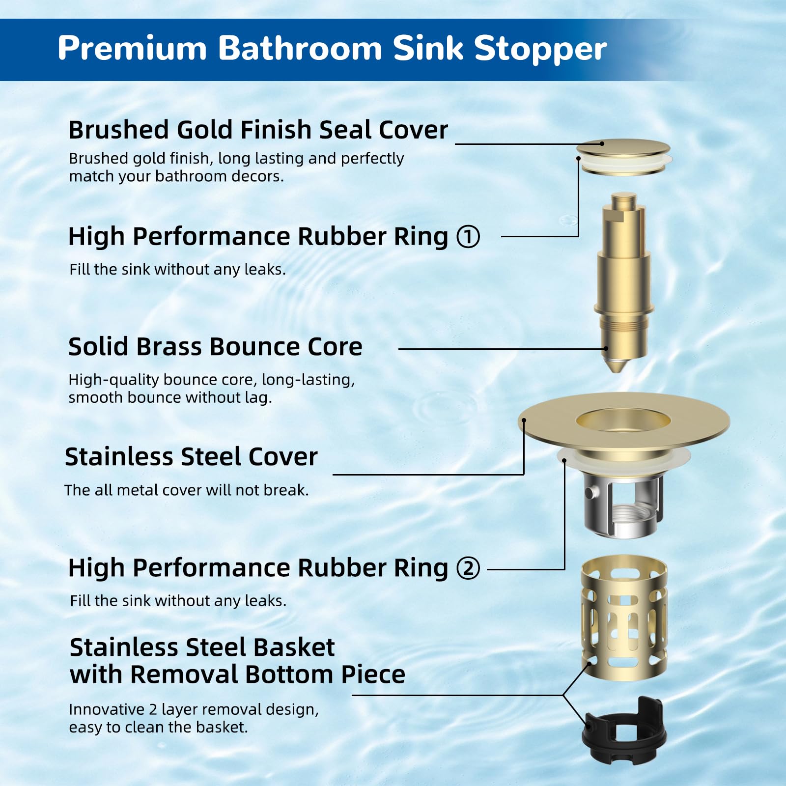 [Pop-up Design] Our pop-up sink drain strainer is made of high-quality stainless steel, plastic, and solid brass, providing exceptional rebound strength, corrosion resistance, and long-lasting durability. It features a long-lasting and sensitive pop-up brass bullet core mechanism, allowing you to easily switch between the water storage and fast drainage modes with just a gentle press