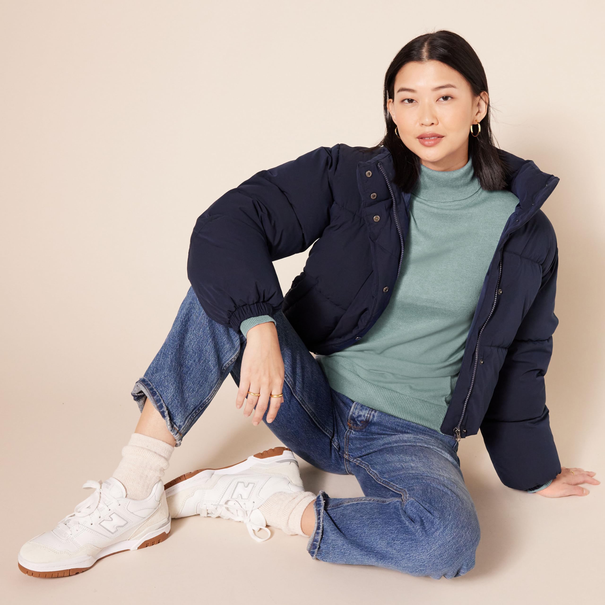 DETAILS: Features a fold-over turtleneck, rib detail at neck, cuffs, and hem.