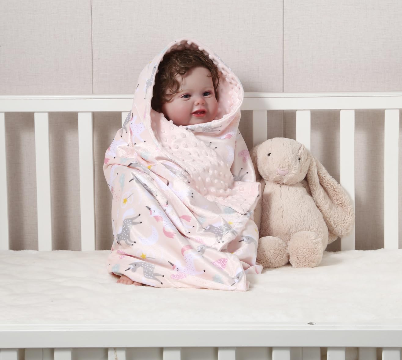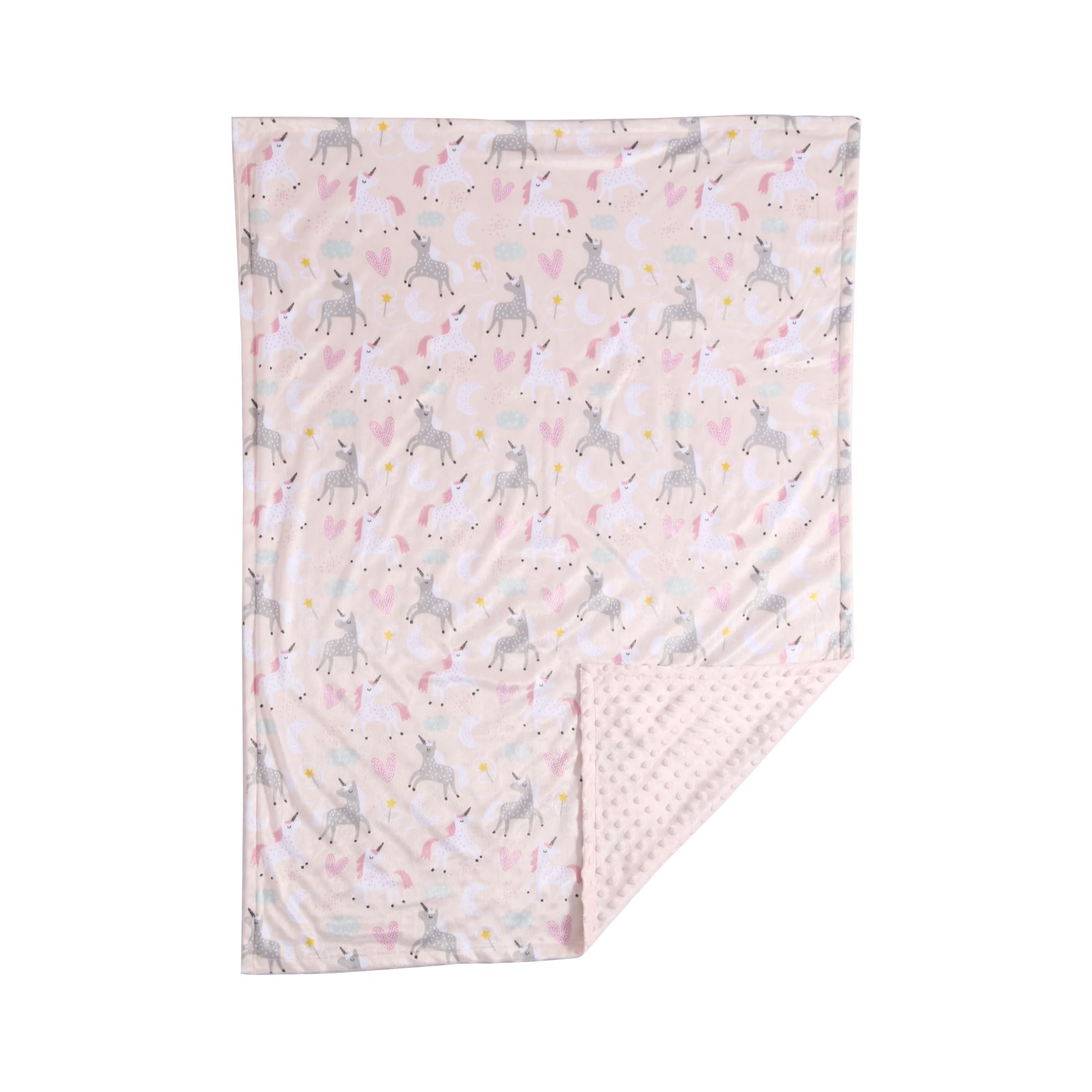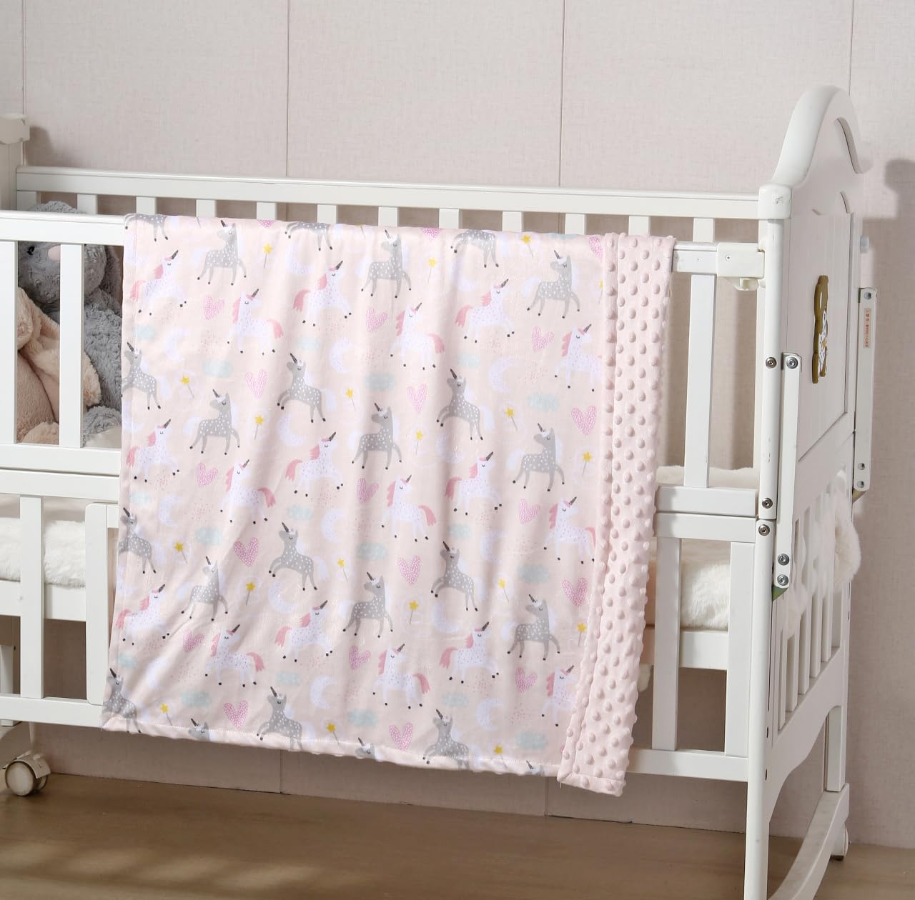 Material: Printed Minky + dot mink. This plush receiving blanket provides a soft and cozy experience for your little ones. Suitable for all season.