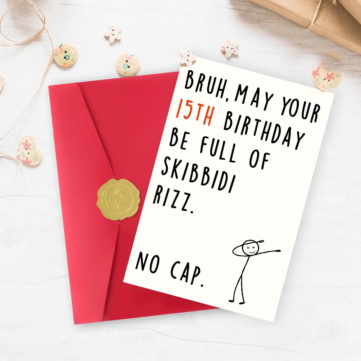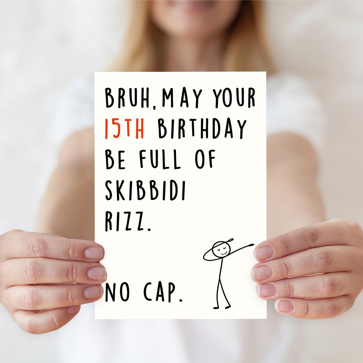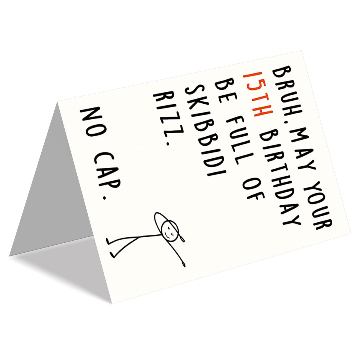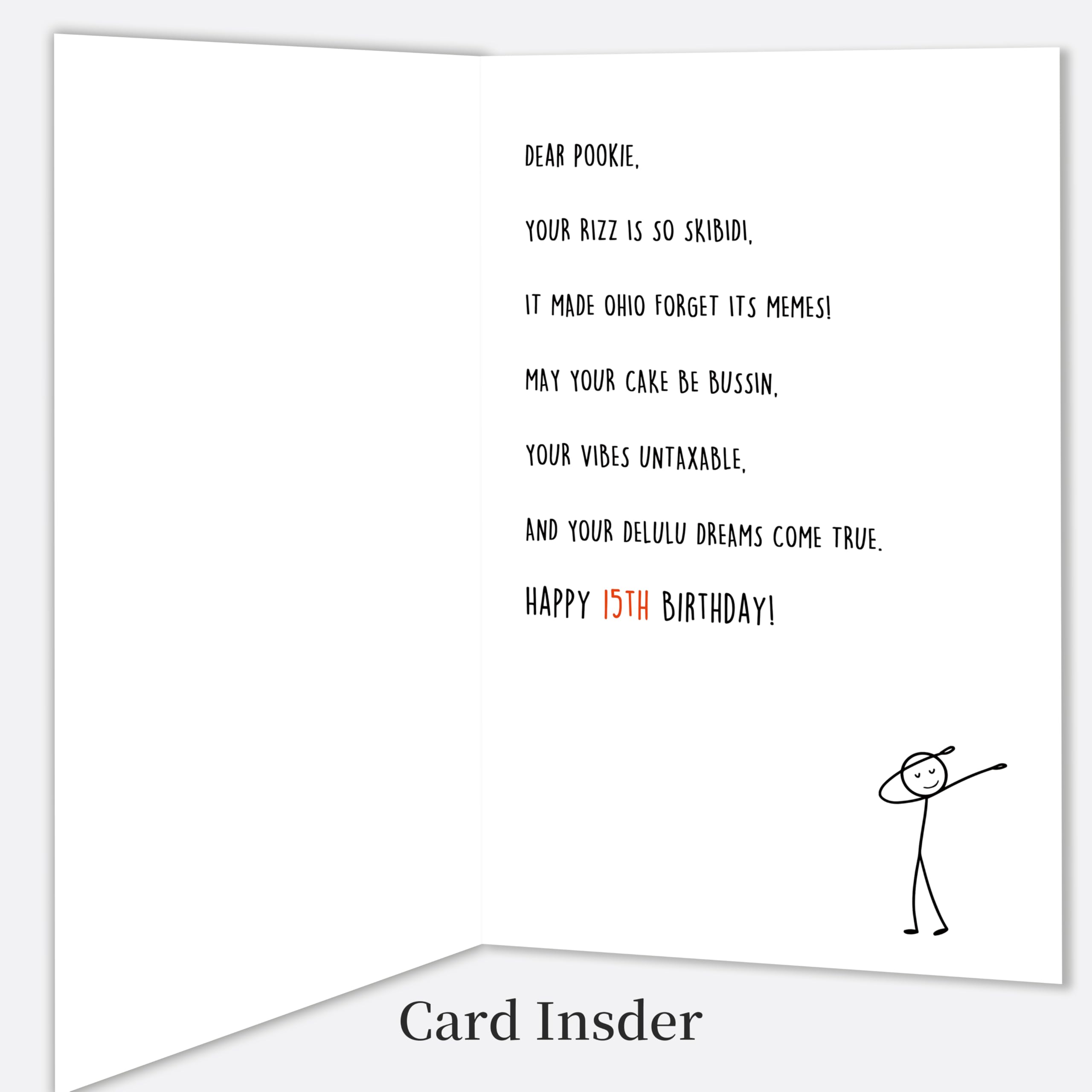 Funny 15th Birthday Card:Celebrate your teen's 15th birthday with this hilarious and trendy card! Perfect for expressing love and humor, it uses popular slang like "Skibidi Rizz" and "No Cap" to make the birthday kid feel seen and laughed with—a great way to show you’re in tune with their world. Perfect for making 15th feel seen and hyped on their big day!