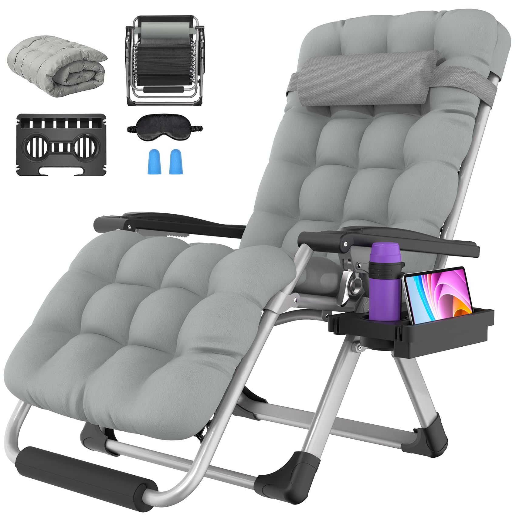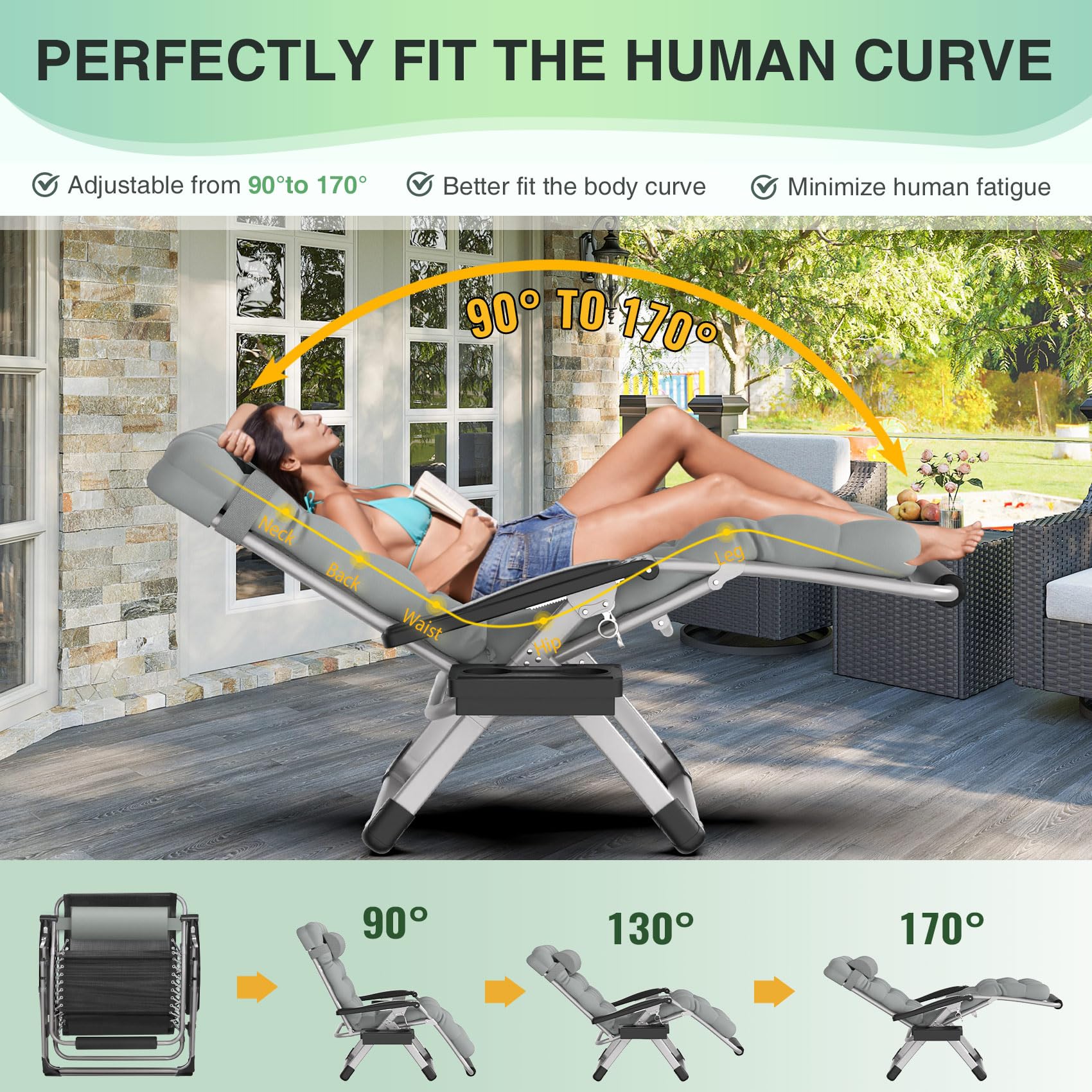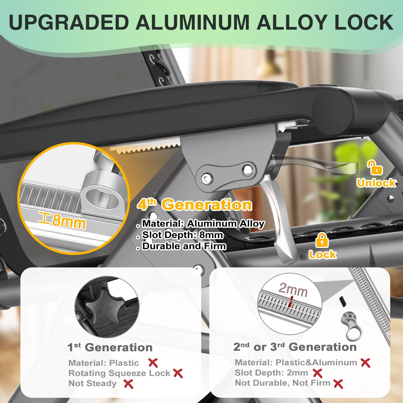 【Easier to Adjust and Lock Chair】Zero gravity recliner with the fourth-generation upgraded aluminum alloy lock makes it easier to adjust the chair from 90º to 170º. The 8mm deep groove locks the recliner more firmly, and is more durable than the previous 3-generation 2mm plastic and aluminum buckles, making the recliner safer to use and will not fall from it. Smoothly adjustment, easy to get a stress-free weightlessness, to achieve the best state of relaxation
