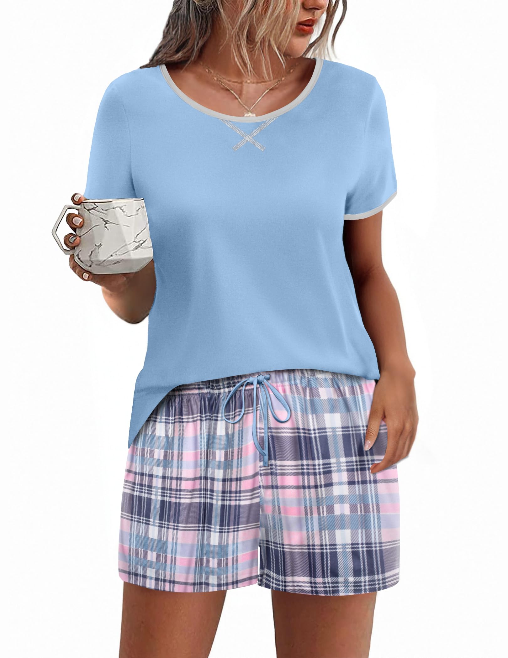 Two Piece Pajama Set: Top- with Round-neck,short sleeve,stylish color block, Pj Short- with Elastic waist,classic plaid & print,which suitable for every age group. Nice design Short Pajama Set for a relaxing day and night