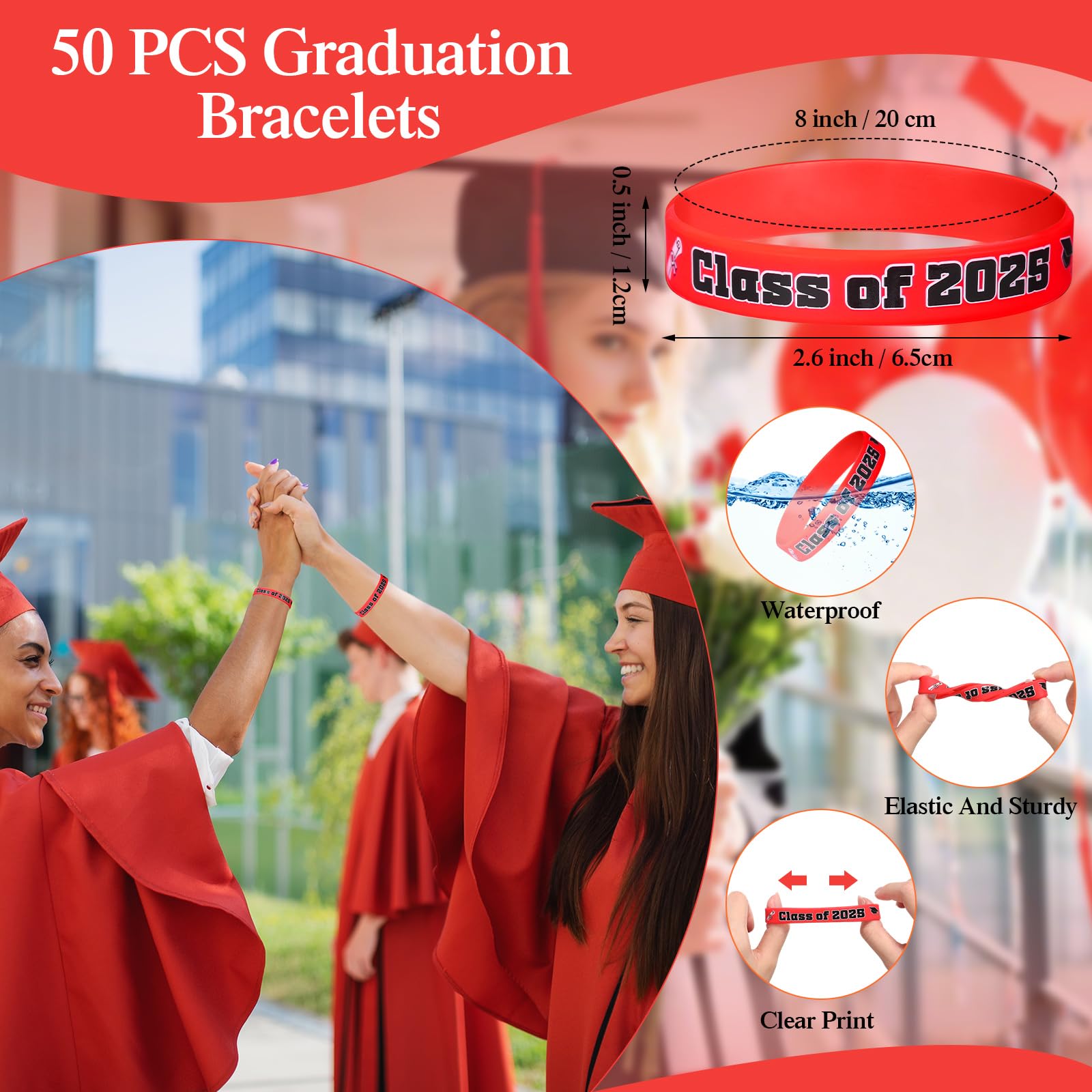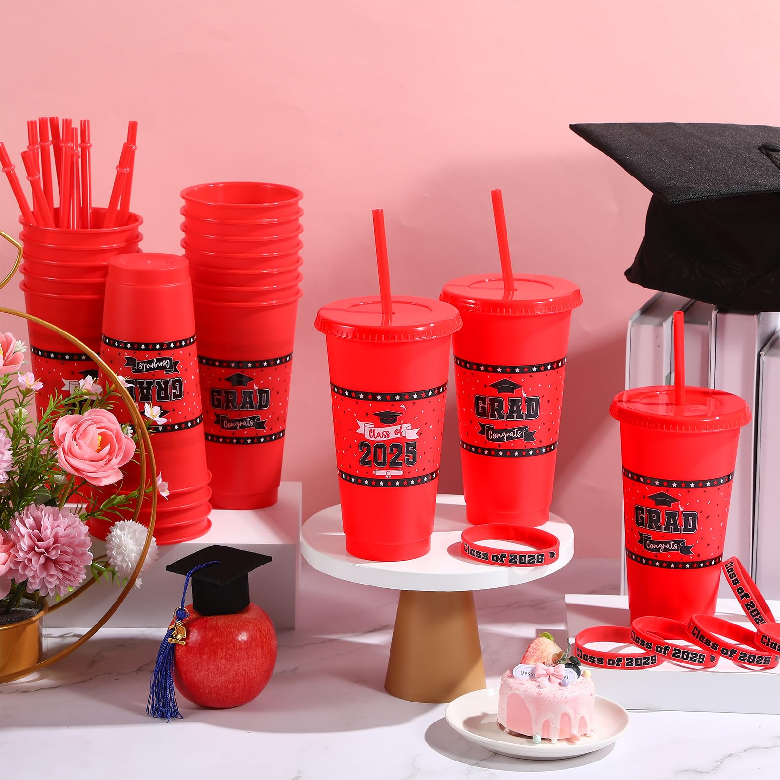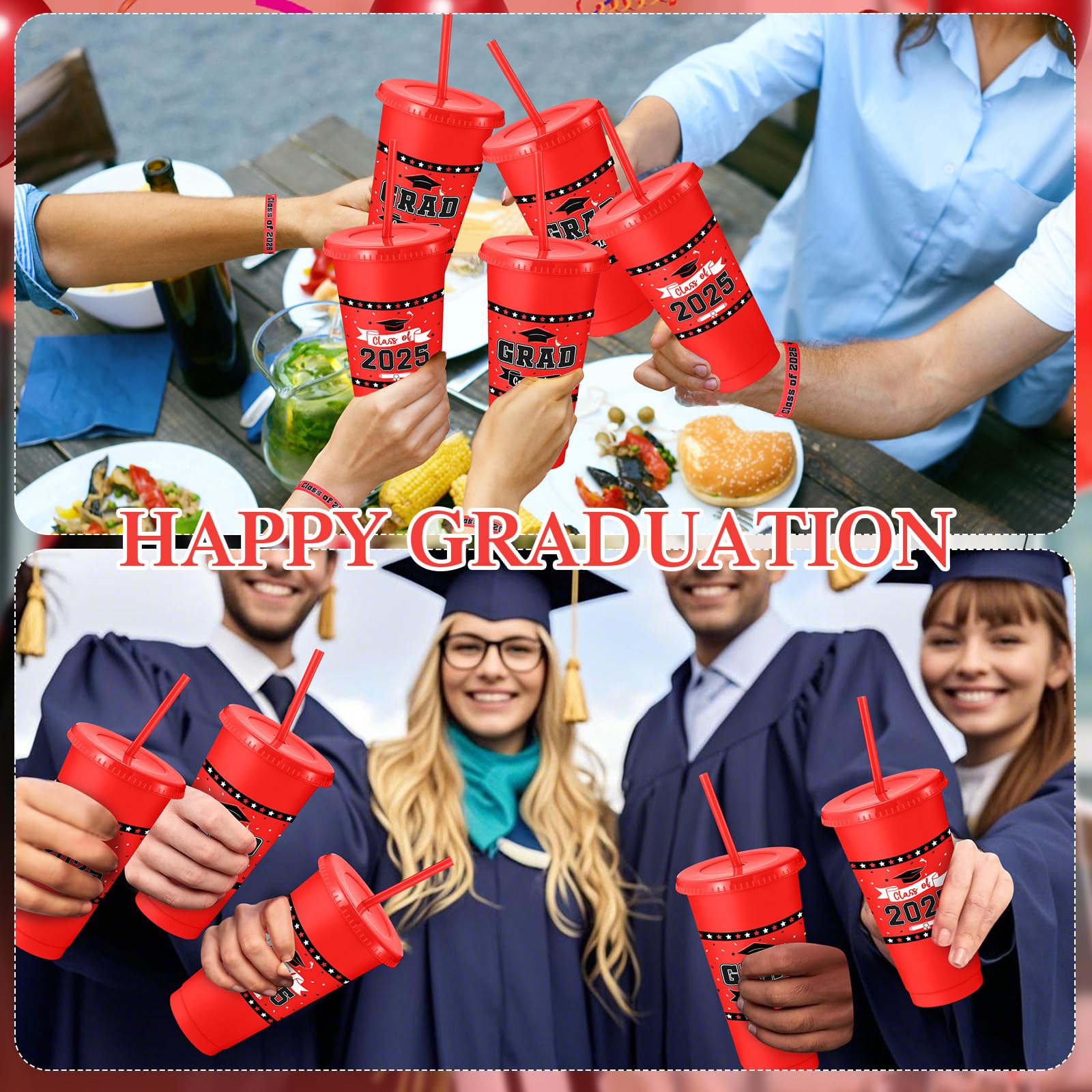 Ideal Graduation Gift Set: you will receive 50 plastic graduation cups with straws and lids, 50 beautiful silicone bracelets; Designed to bring a stylish and joyful touch to the Class of 2025 celebration, these reusable graduation cups are a great choice for graduation party supplies