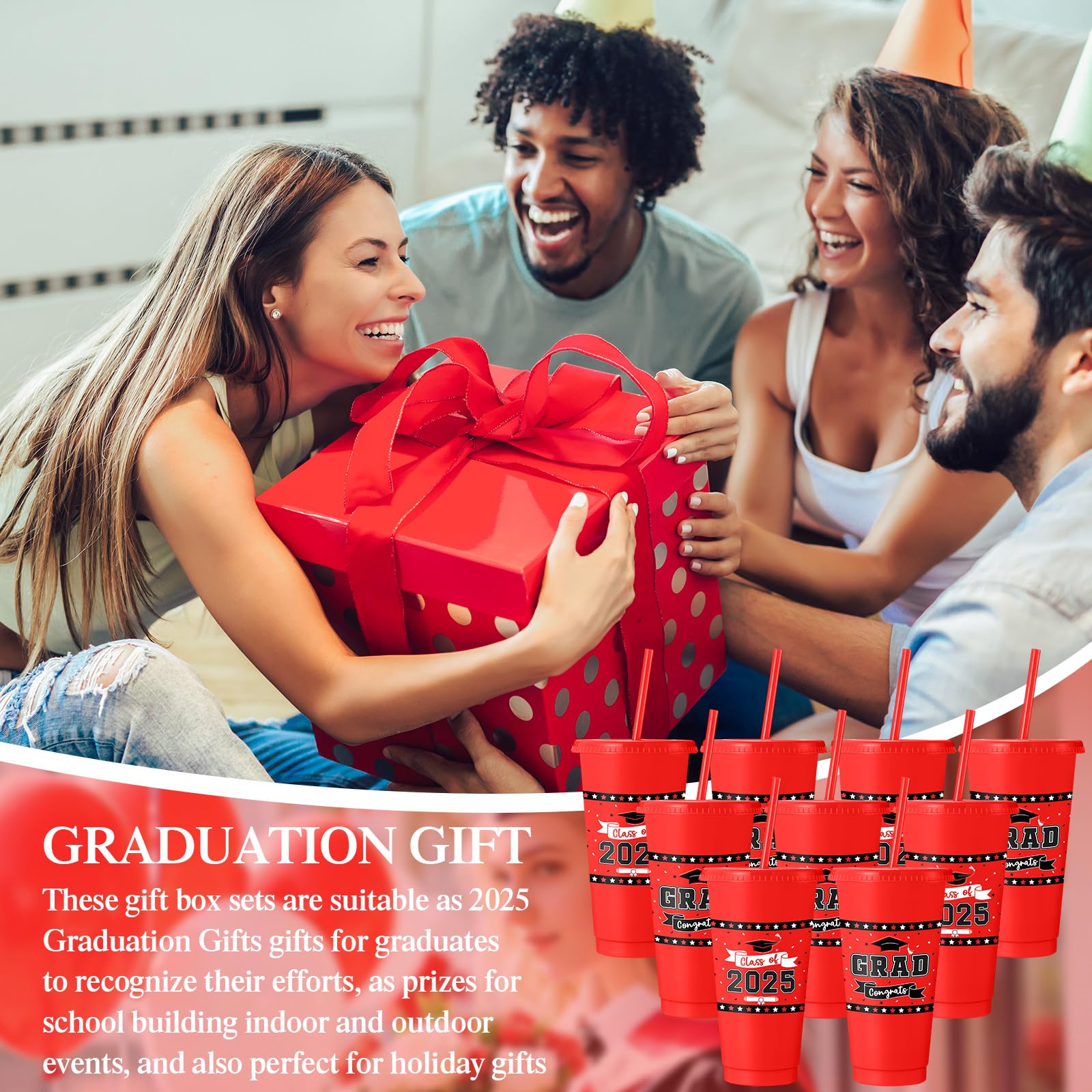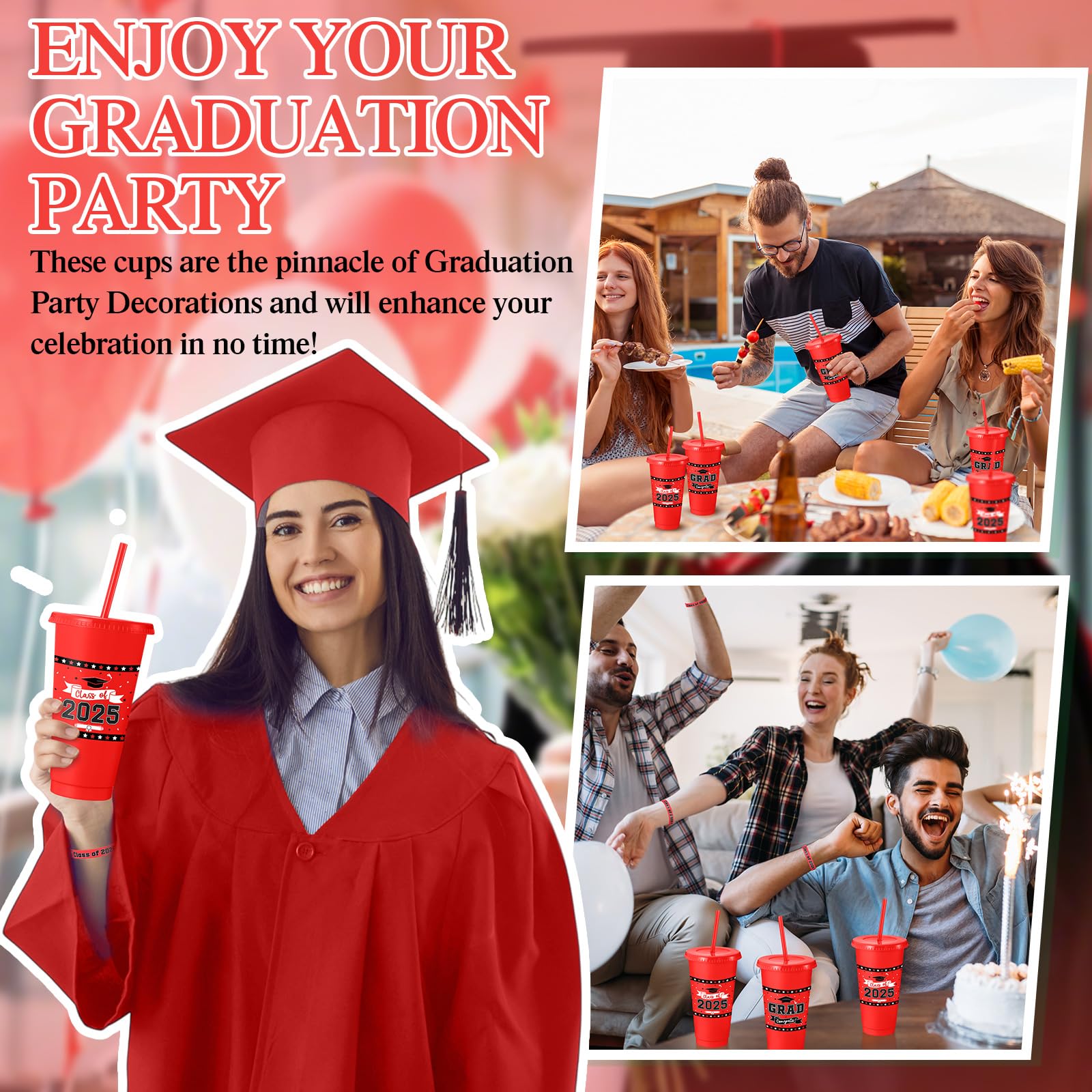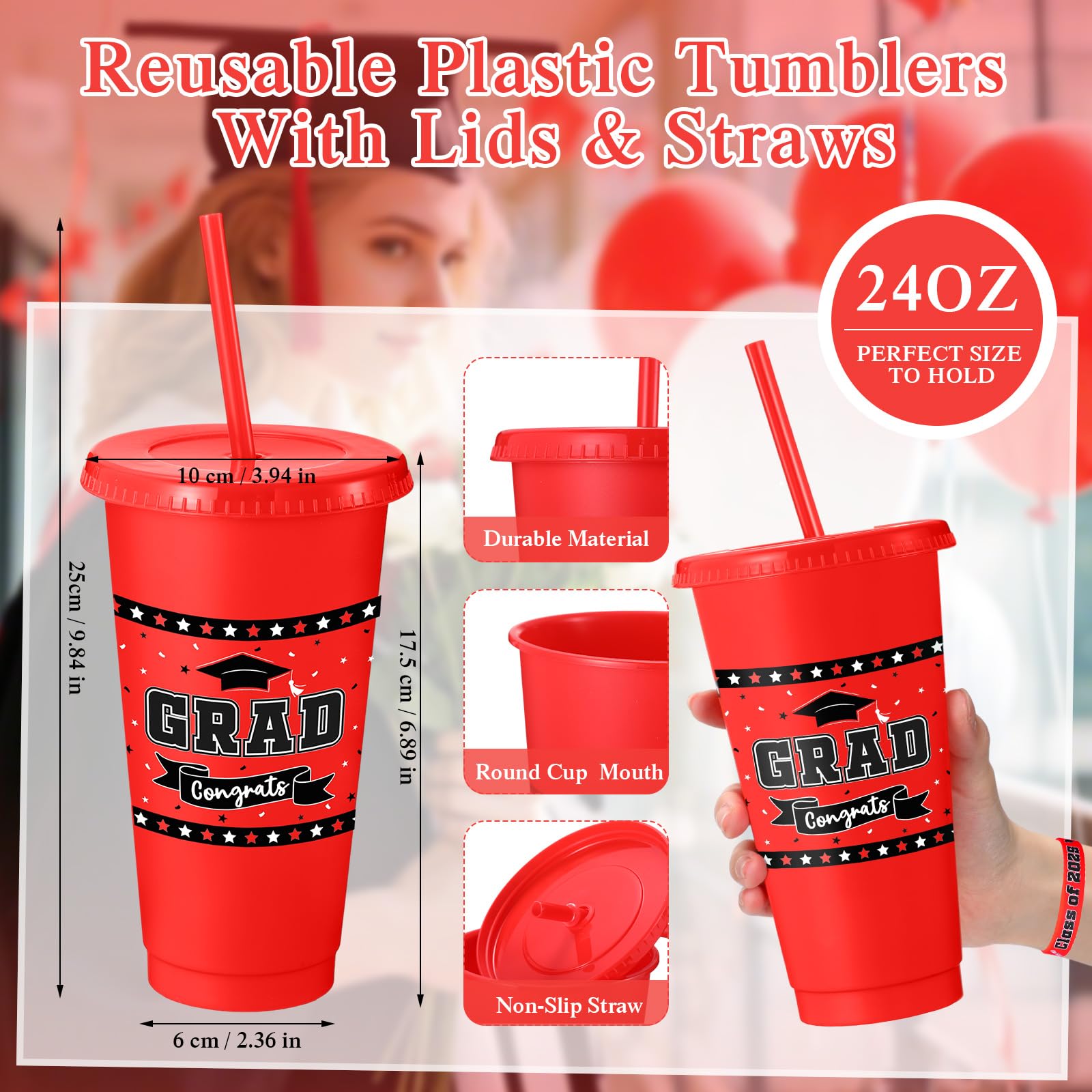 Ideal Graduation Gift Set: you will receive 50 plastic graduation cups with straws and lids, 50 beautiful silicone bracelets; Designed to bring a stylish and joyful touch to the Class of 2025 celebration, these reusable graduation cups are a great choice for graduation party supplies