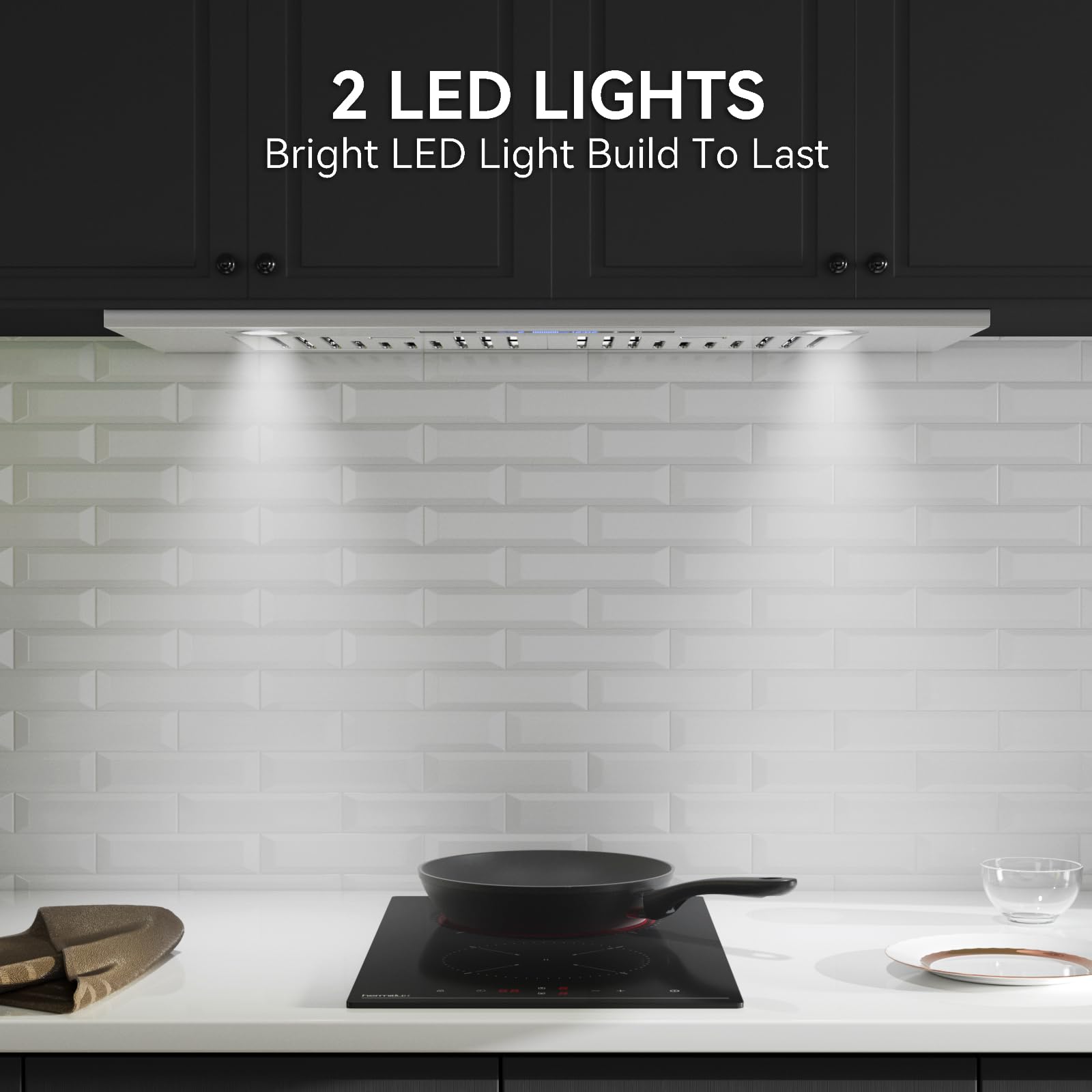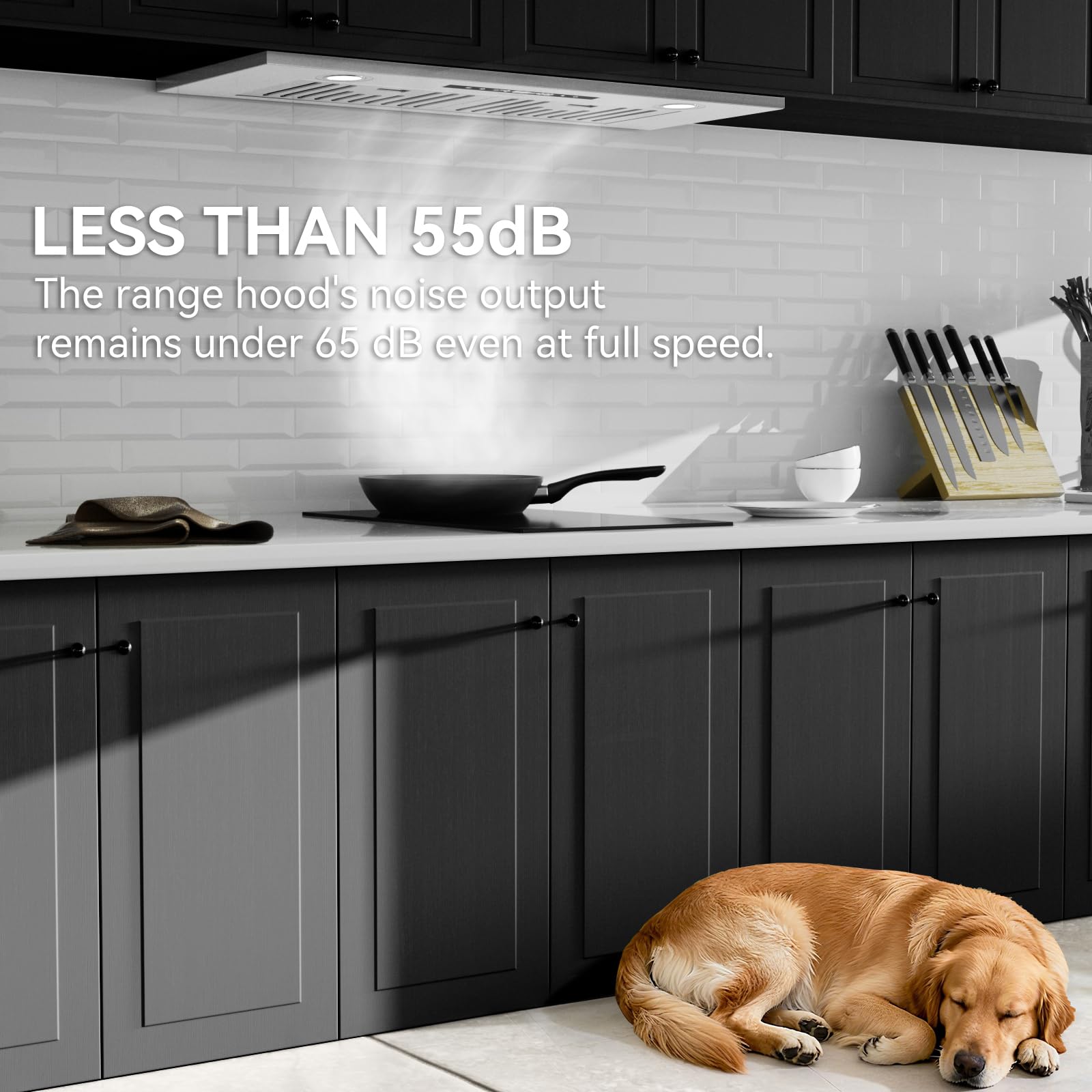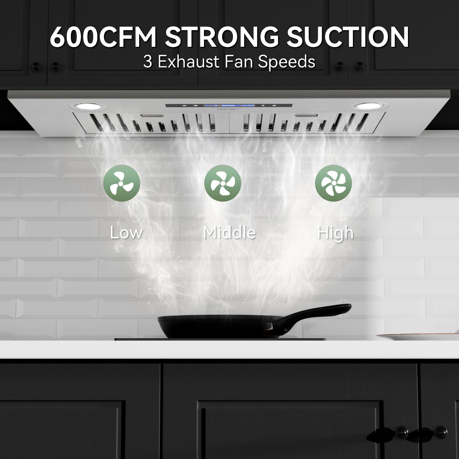 【Powerful 600 CFM for Open-Concept Kitchens & Stir-Frying】Tackle heavy frying smoke and stubborn odors with 600 CFM of suction power,keeps your open kitchen air fresh.Operating at a quiet 55 dB—as gentle as a whisper—it lets you converse freely while cooking.