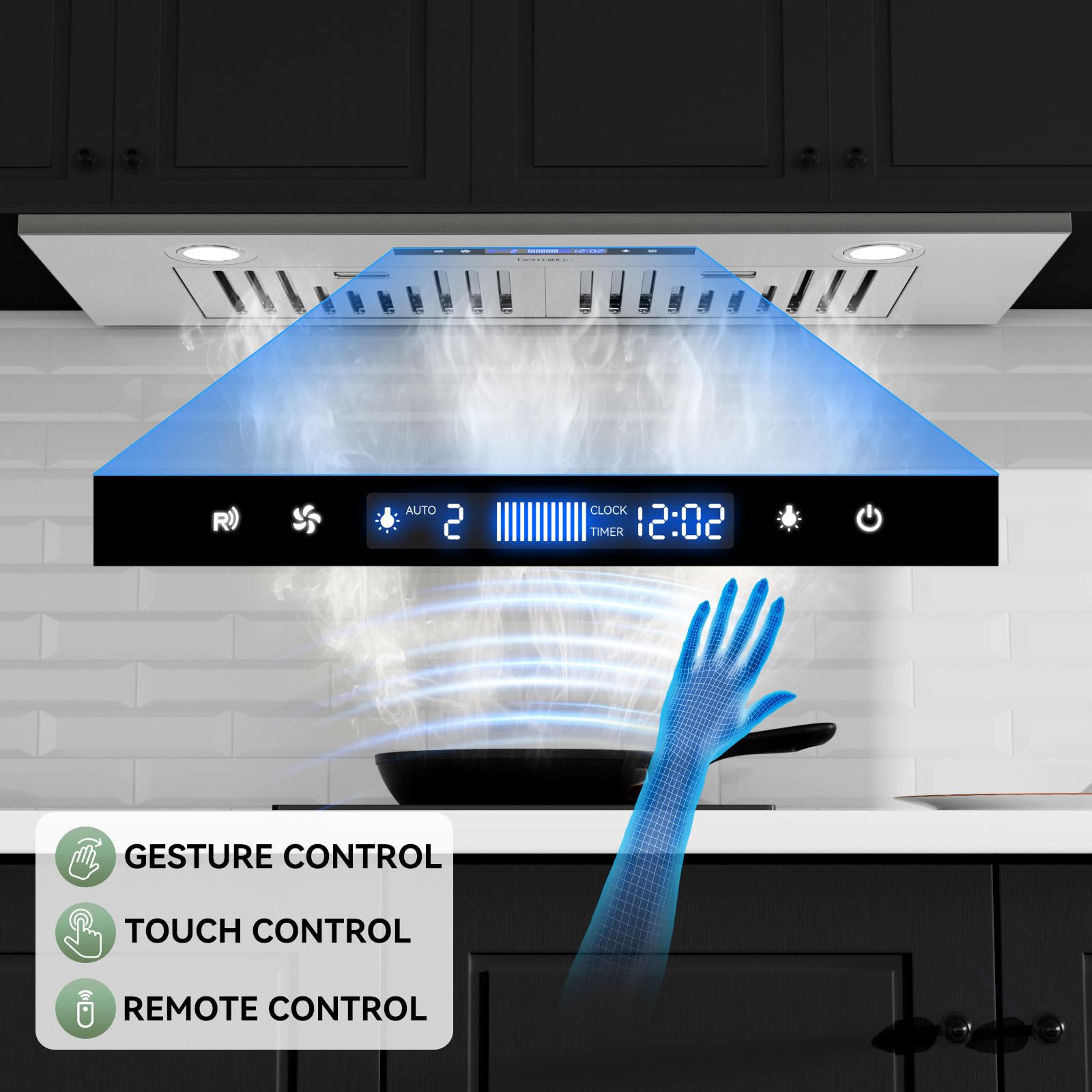 【Effortless & Smart Control】Designed for those moments when your hands are covered in oil or ingredients. Hermitlux Range Hood innovative 3-Speed Gesture Sensing lets you adjust the fan without a touch.Paired with a sleek touch panel, it offers both futuristic convenience and precise control, making it the centerpiece of a modern, hygienic kitchen.