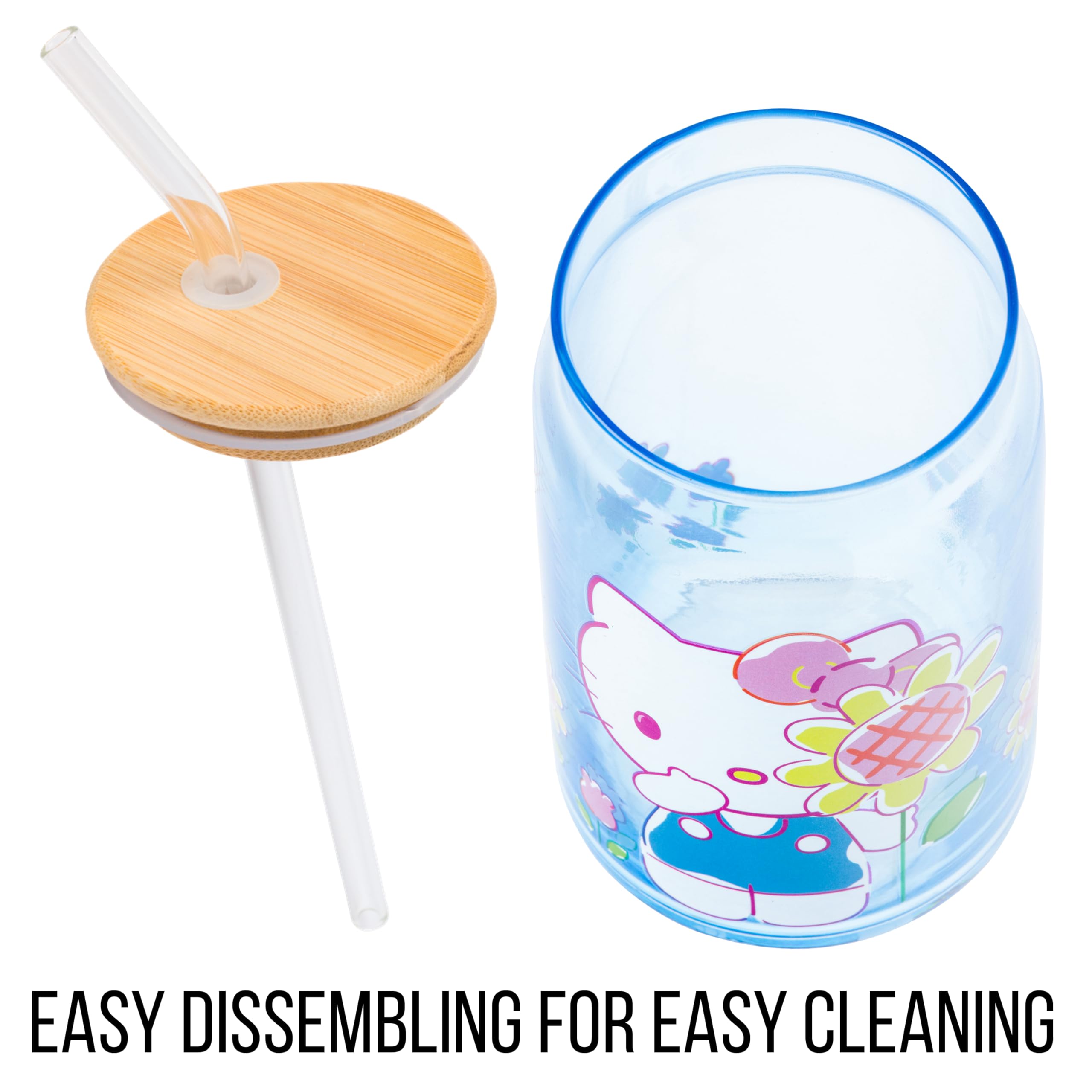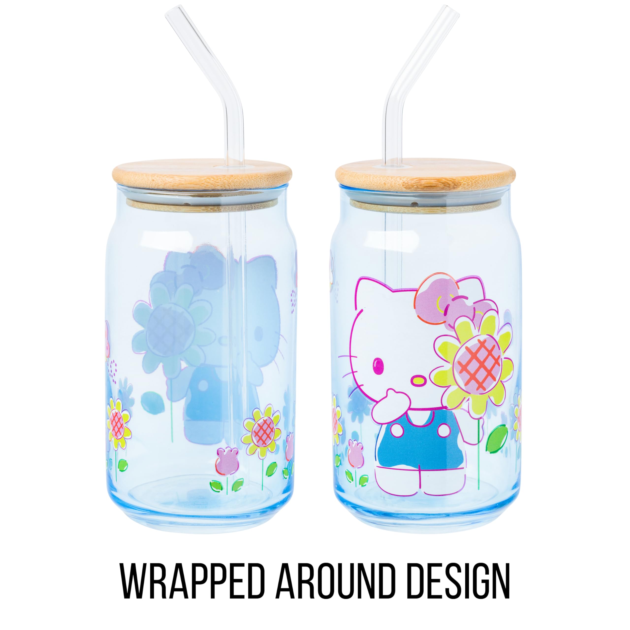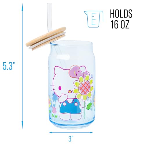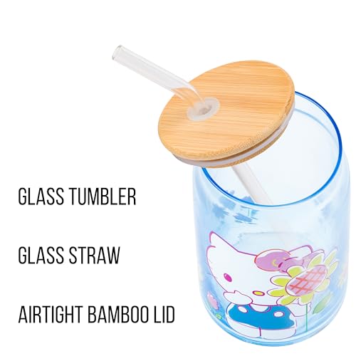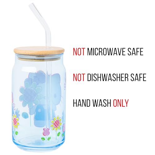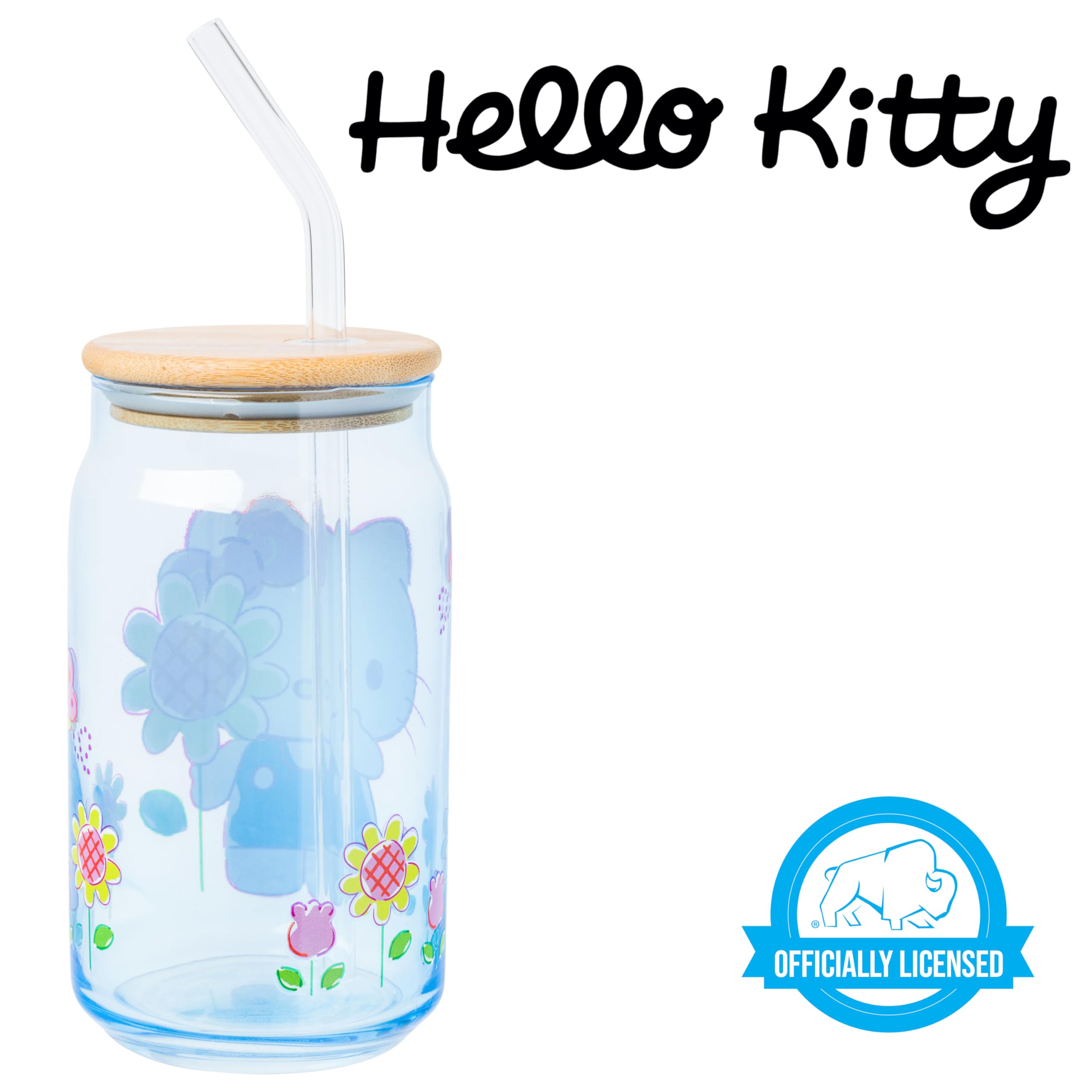 Enjoy your favorite beverages in this Hello Kitty glass tumbler! Themed tumbler features Hello Kitty surrounded by flowers. On the tumbler, the adorable character is pictured in the cutest blue dress holding a flower. Glass tumbler is complete with a bamboo lid and reusable glass straw, promoting eco-conscious living. This 16 ounce tumbler is perfect for enjoying any beverage. Complete with a secure bamboo lid and reusable glass straw, this is the perfect cup to bring on your daily adventures. HAND WASH ONLY. NOT microwave safe. Looking for a gift? This kawaii glass tumbler makes a great gift for Hello Kitty fans of all ages. Great for holidays, birthdays, and housewarmings. Take a dive into the fictional world with Silver Buffalo! Silver Buffalo provides fans with official merchandise from their favorite characters. Working alongside licensors and brands, we create unique and imaginative products which are designed with great care and detail. Silver Buffalo aims to connect fans to their favorite cartoon characters, superheroes, movies, tv-series, and more. Celebrate your fandom!