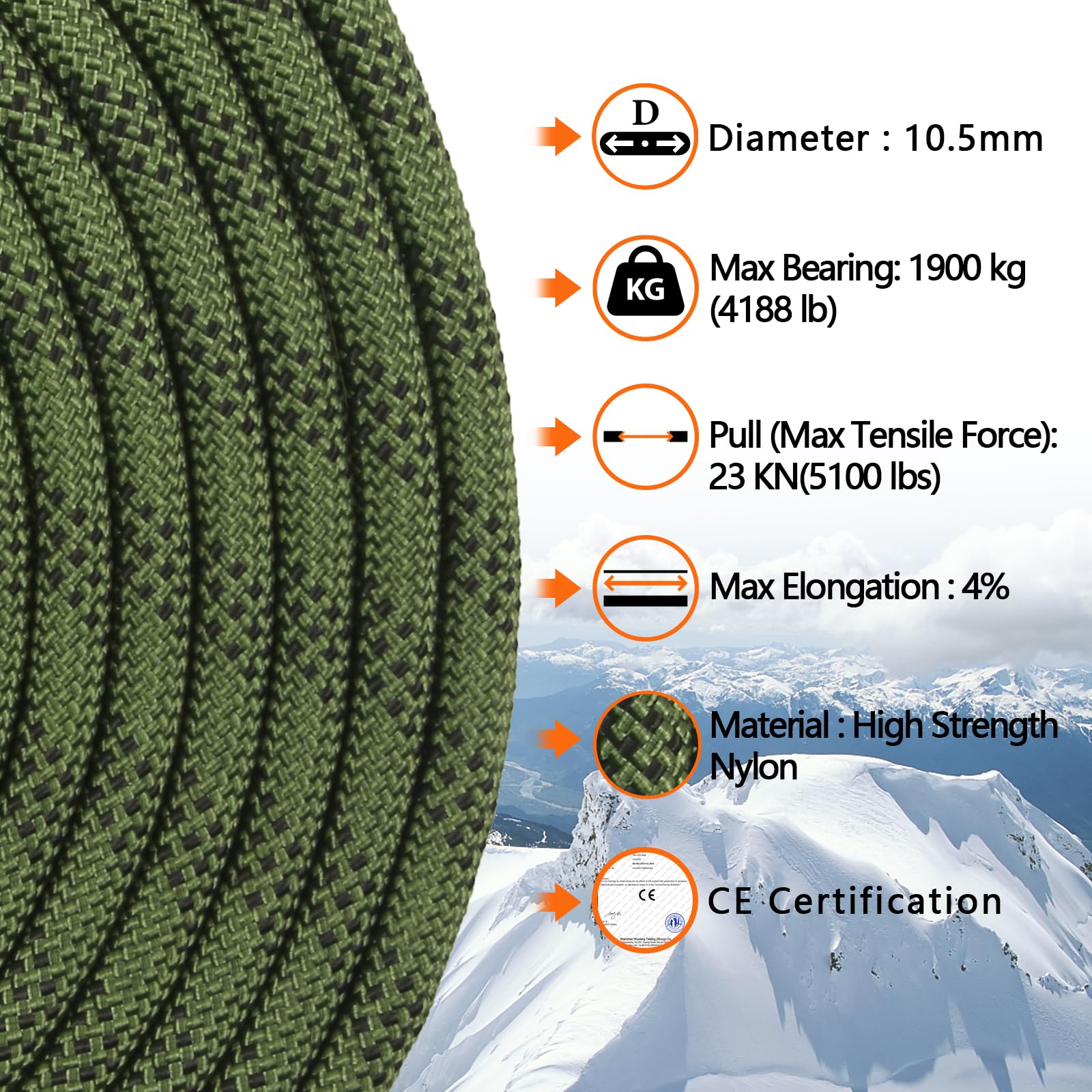 Wide Application: This Static Climbing Rope is a good helper for outdoor mountaineering, tree climbing, escaping, hiking, camping, hammock, swing,fishing. etc. Note: This climbing rope is marked as a static rope. If you need a Dynamic Rope with ductility and shock absorption, please choose carefully.