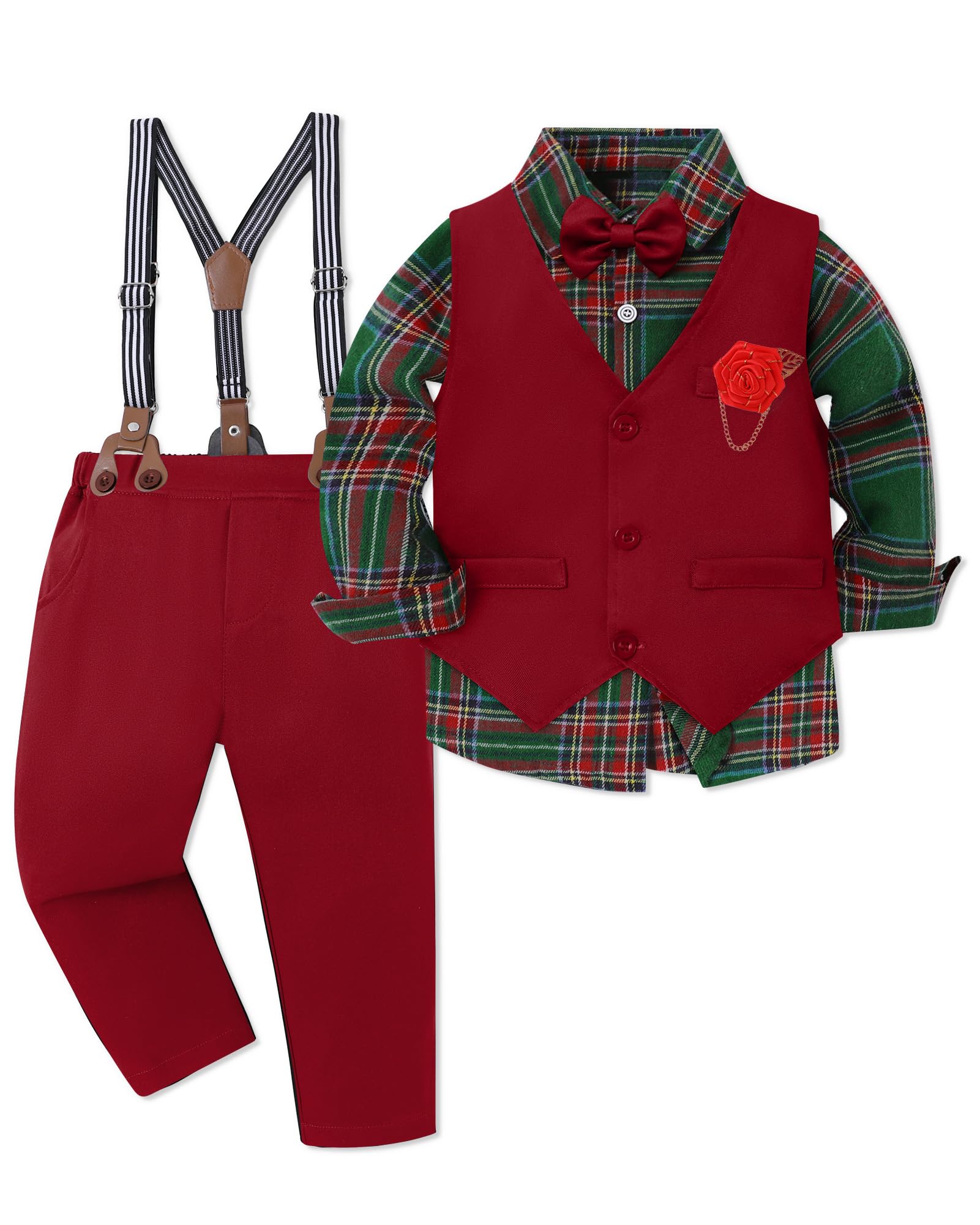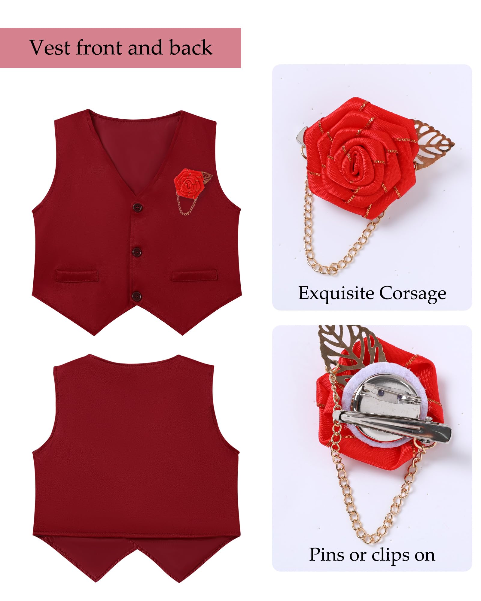 6-Pieces Formal Suit Set: This toddler suit including 1PC long sleeve dress shirt+ 1PC vest + 1PC suspender pants + 1PC detachable bow tie + 1PC elegant boutonniere.