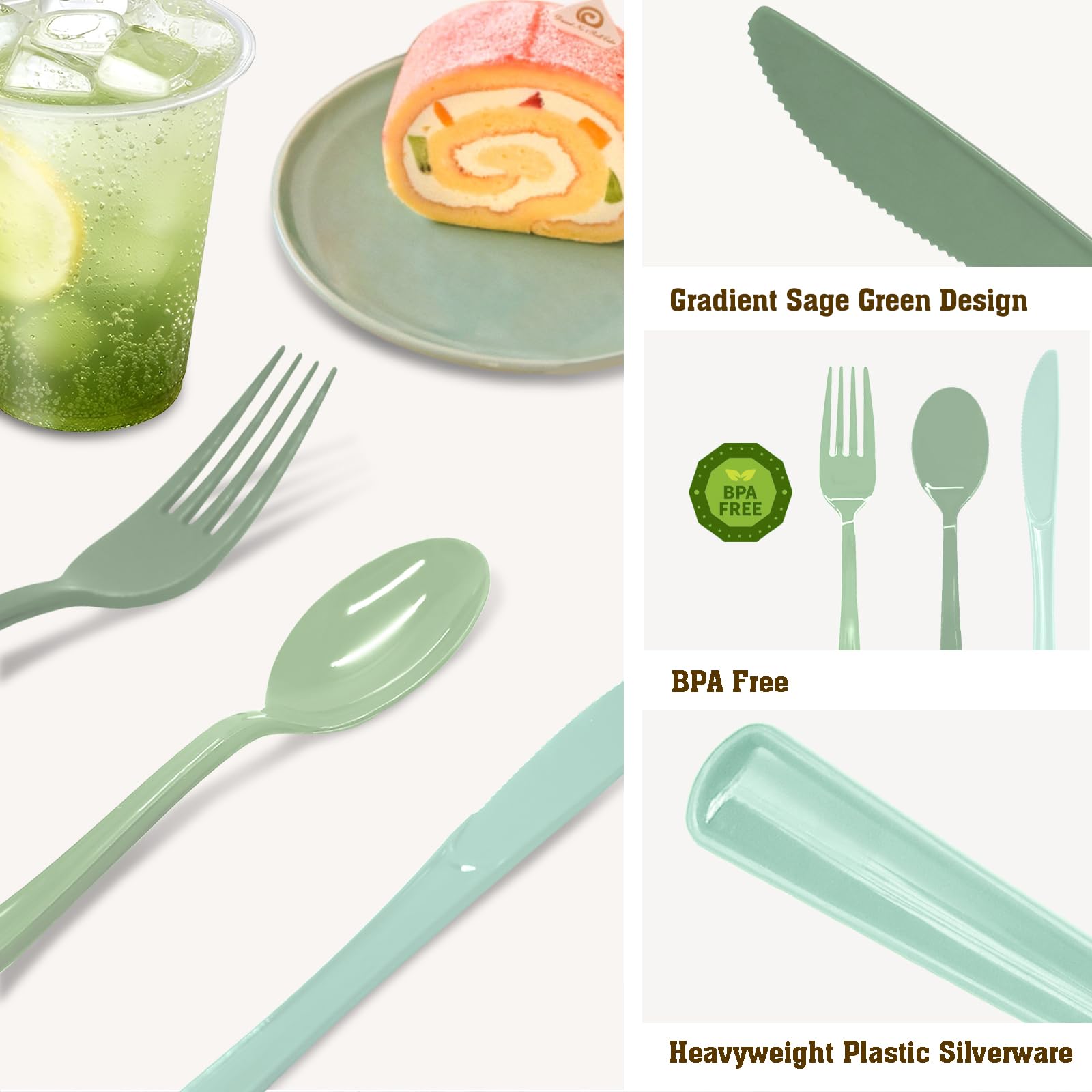 【Gradient Color Aesthetics】: This sage green plastic forks features a gradient design that transitions from light to dark shades, adding artistic flair and vibrancy to mealtime. Whether for everyday dining or special occasions like parties, it becomes a standout piece on the table, elevating the dining experience with visual appeal.