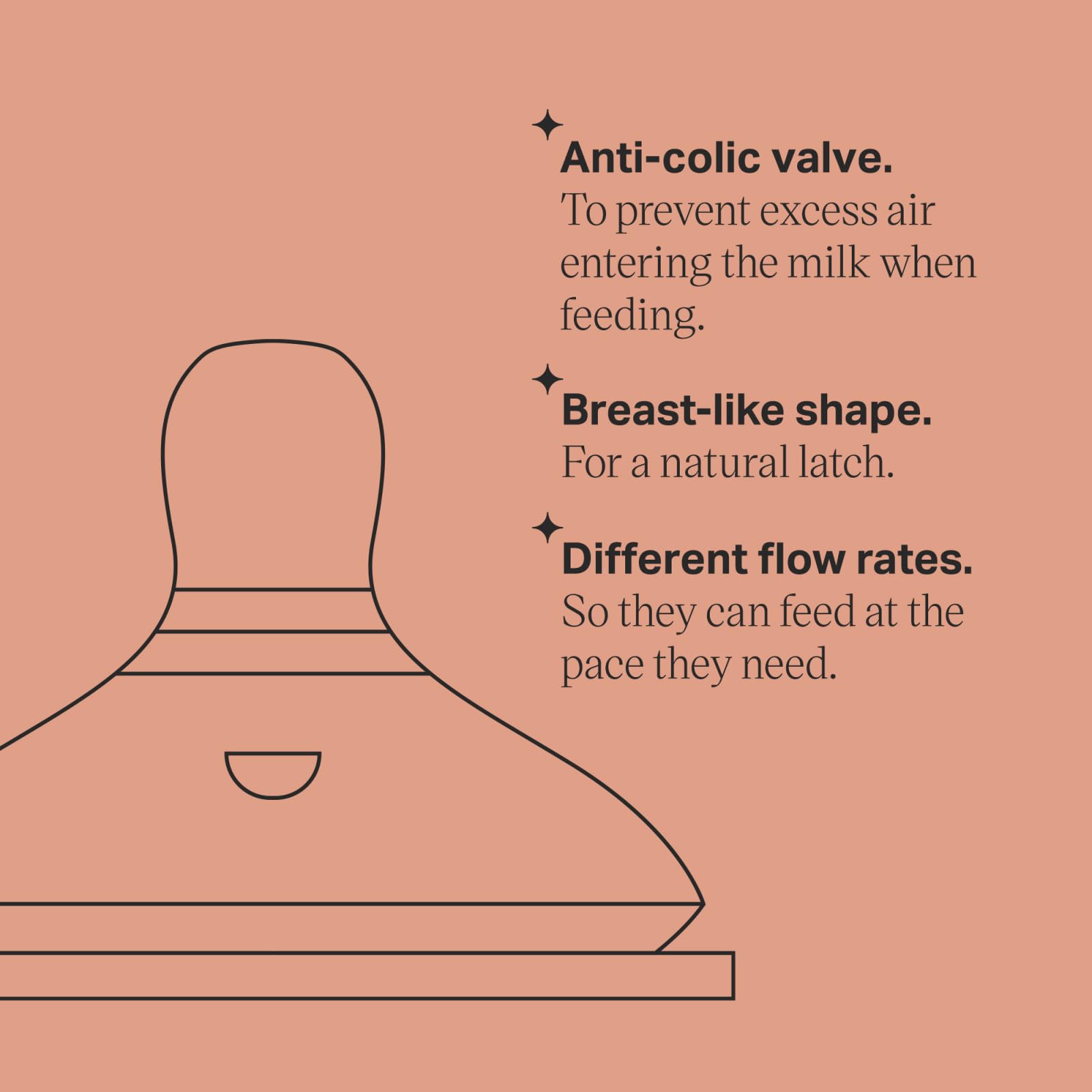 Natural Latch: Our bottle nipples are shaped to encourage a natural latch, reducing air intake and preventing nipple confusion when switching between breast, bottle and back again