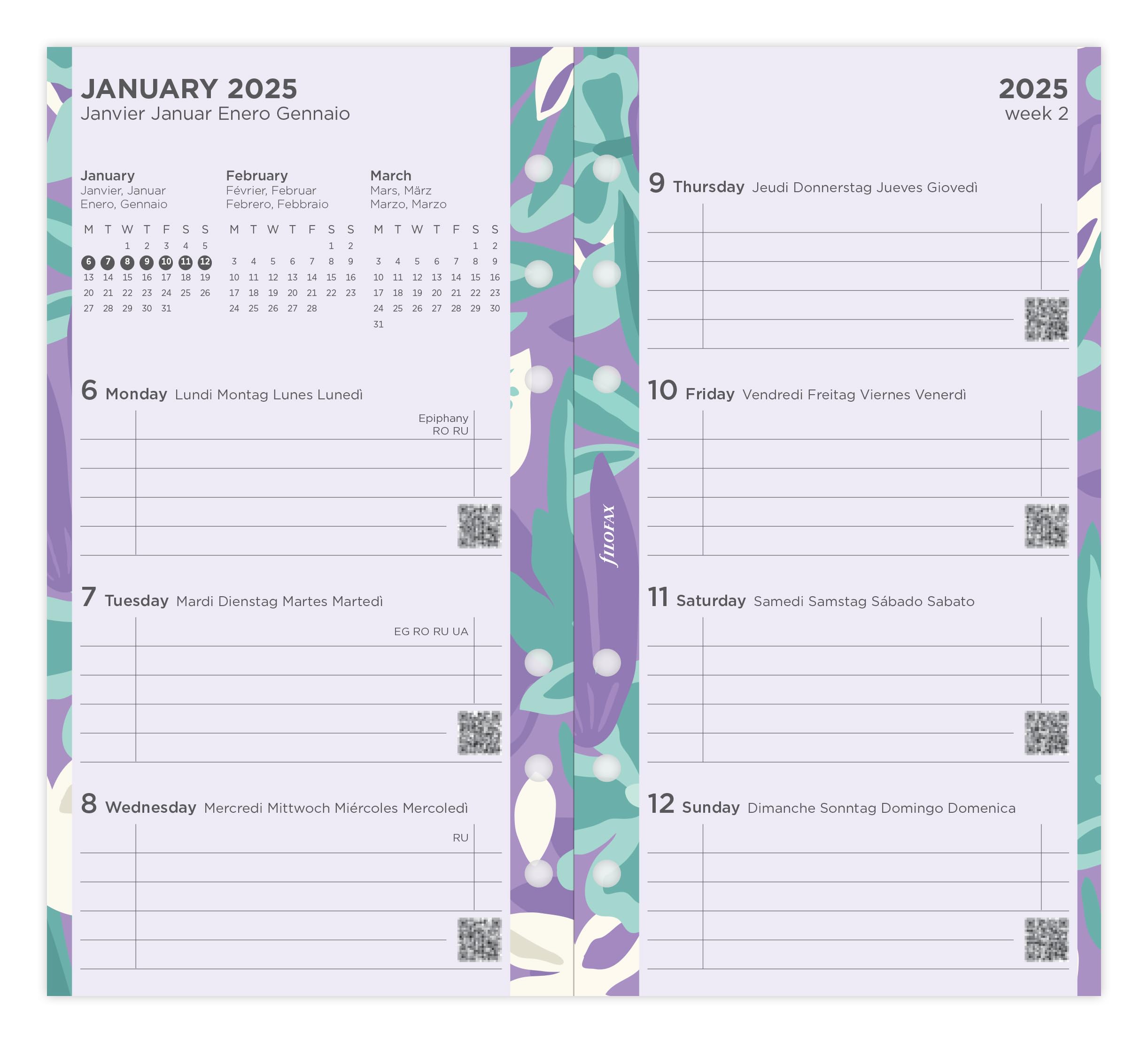 This Filofax Personal 2025 diary refill features a QR code on every day which, when used together with the Filofax Reminder App, allows you to plan on paper and review on your phone. Simply download the free Filofax Reminder app and scan the QR code on the date of your choice. This will allow you to not only copy appointments from your diary onto the App, but also set up reminders. The appointments can also be synced with your phone's calendar. This innovation will allow you to always have the important contents of your diary with you. This is a 4 colour print 2025 Filofax diary refill pack with a floral design around the borders of the pages. The pack includes a week to view diary, month planners, calendars, holiday information, coordinated tabbed month dividers, To Do pages and ruled notepaper. Page size 95mm x 171mm to fit Filofax Personal size organisers.