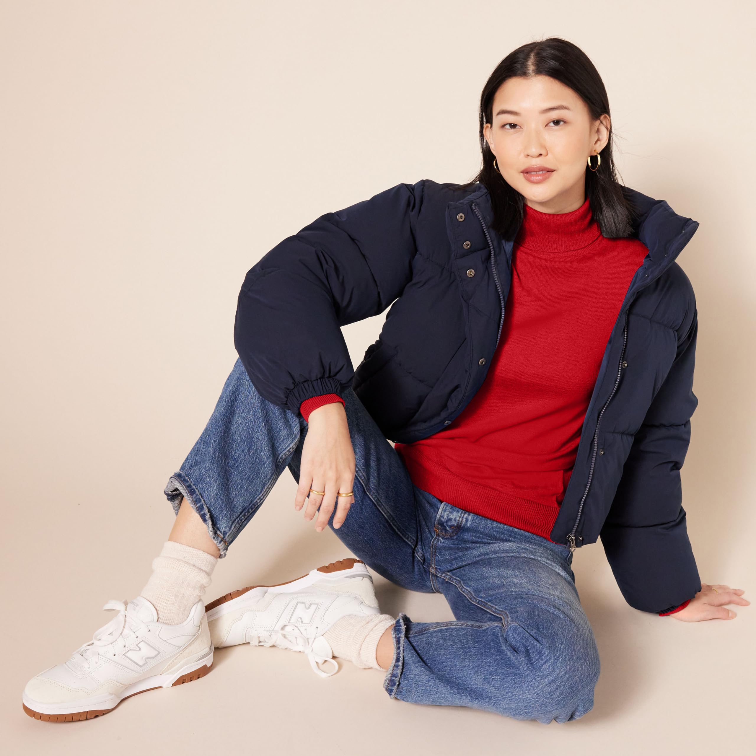 DETAILS: Features a fold-over turtleneck, rib detail at neck, cuffs, and hem.