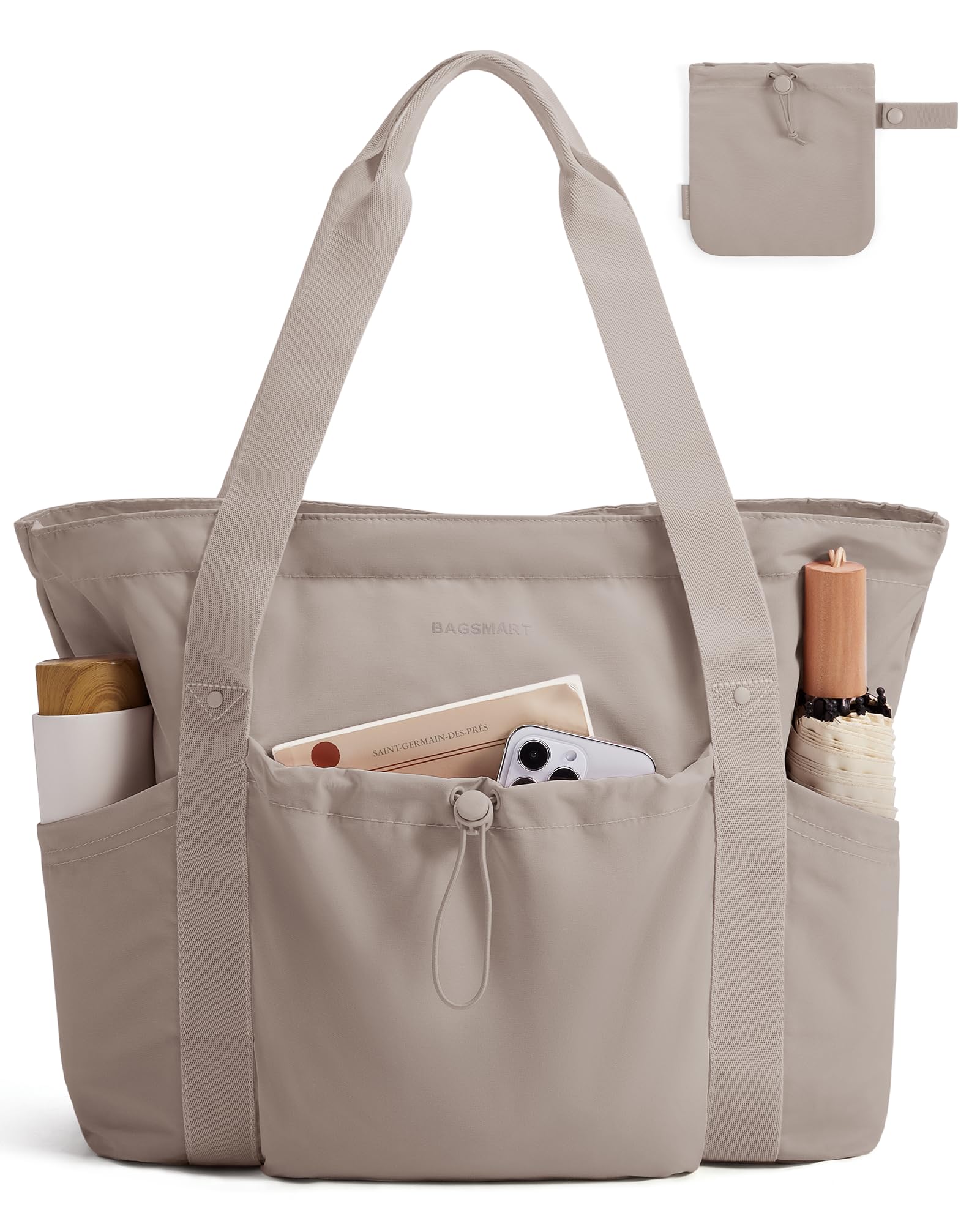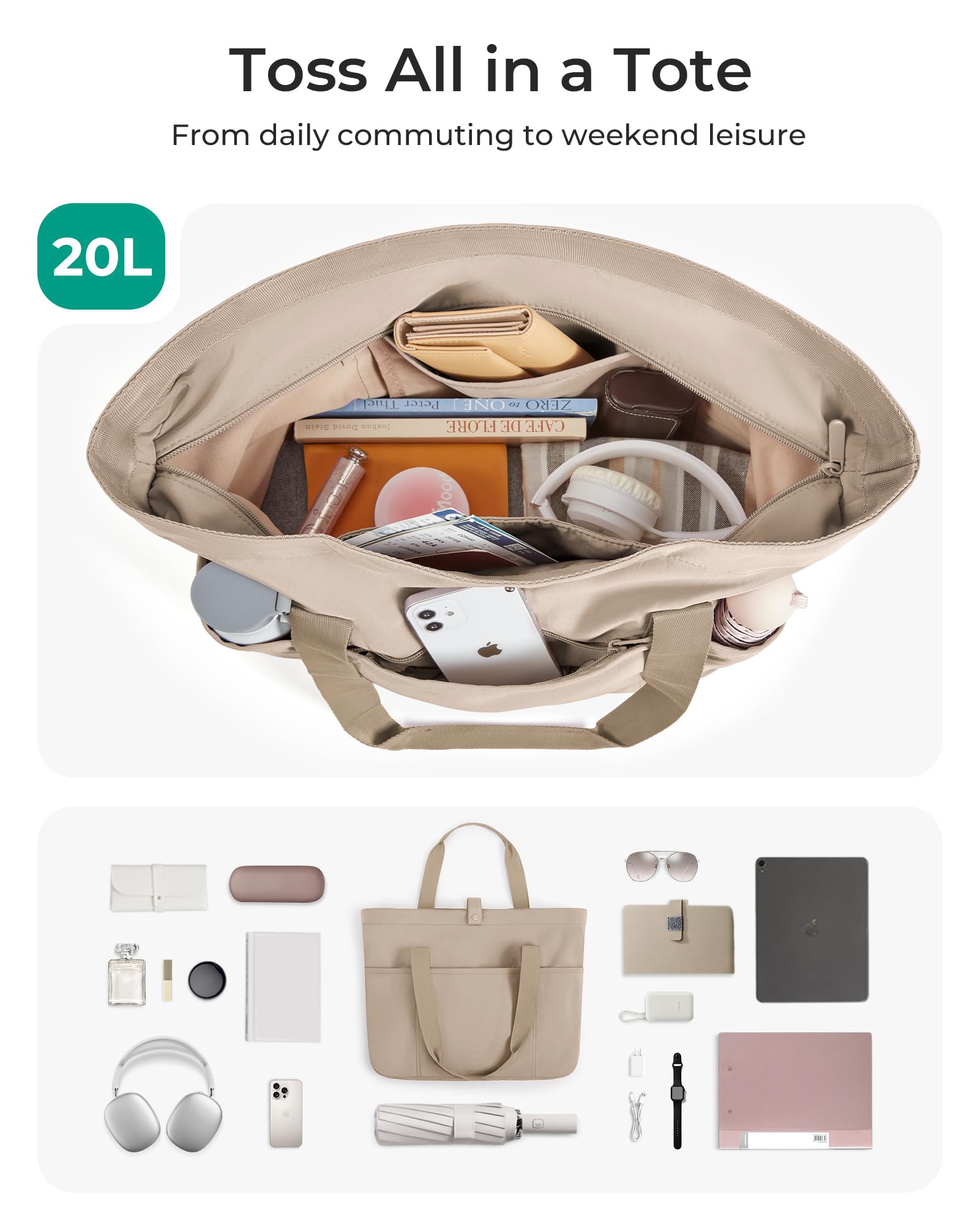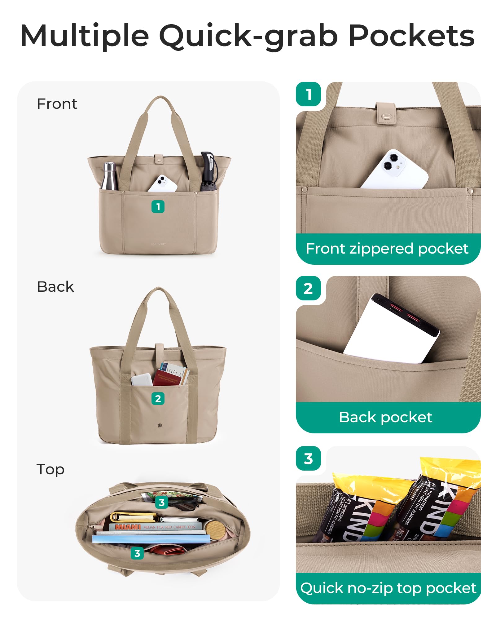 Roomy Space-Capacity 20L,The women tote bag feasures 6 separate pockets; Main zipper compartment can easily hold A4 folder, clothes, etc. 2 Outer handy pockts+ 1 front zippered pocket+1 slip pocket+ 1 back pocket allow you quick access the items you need.
