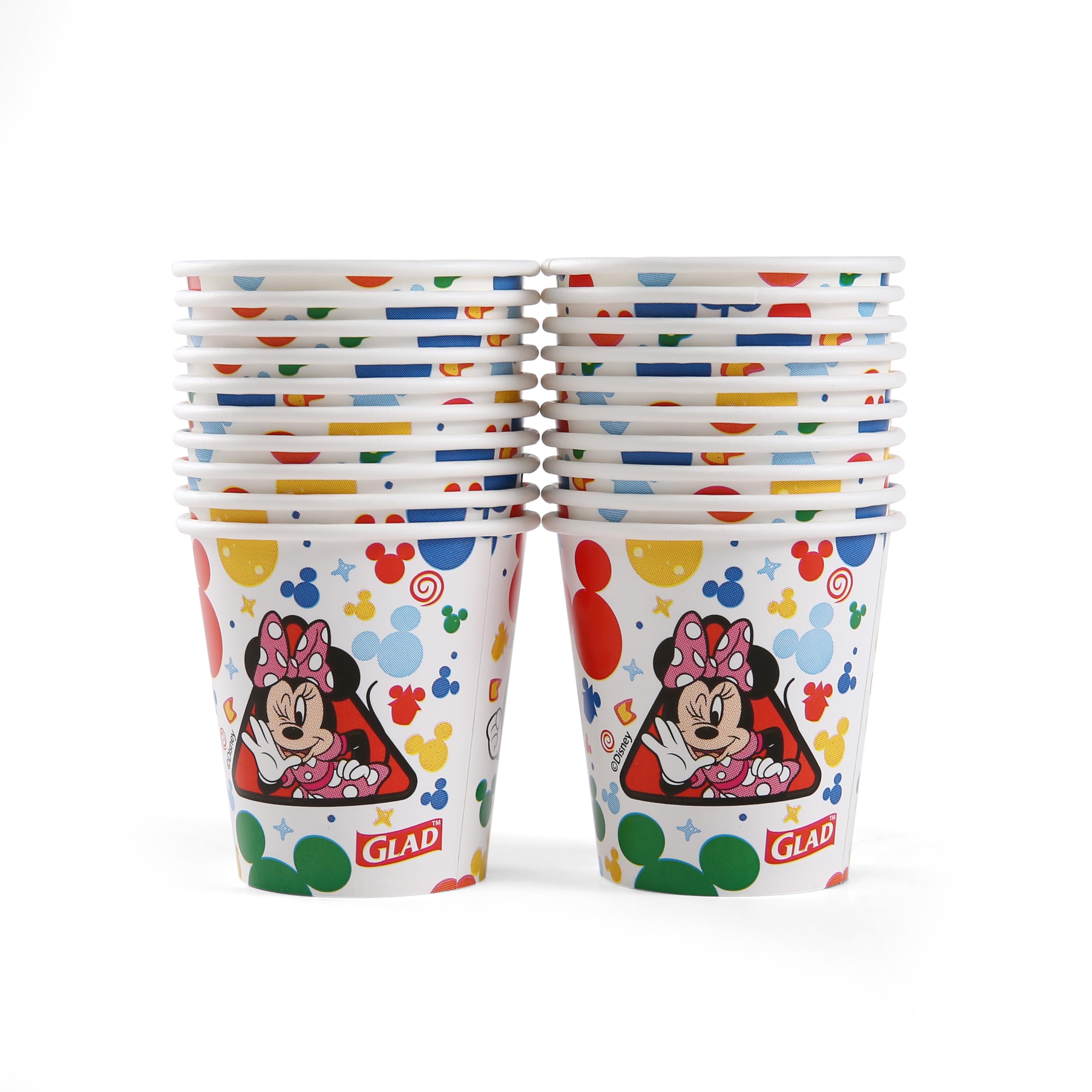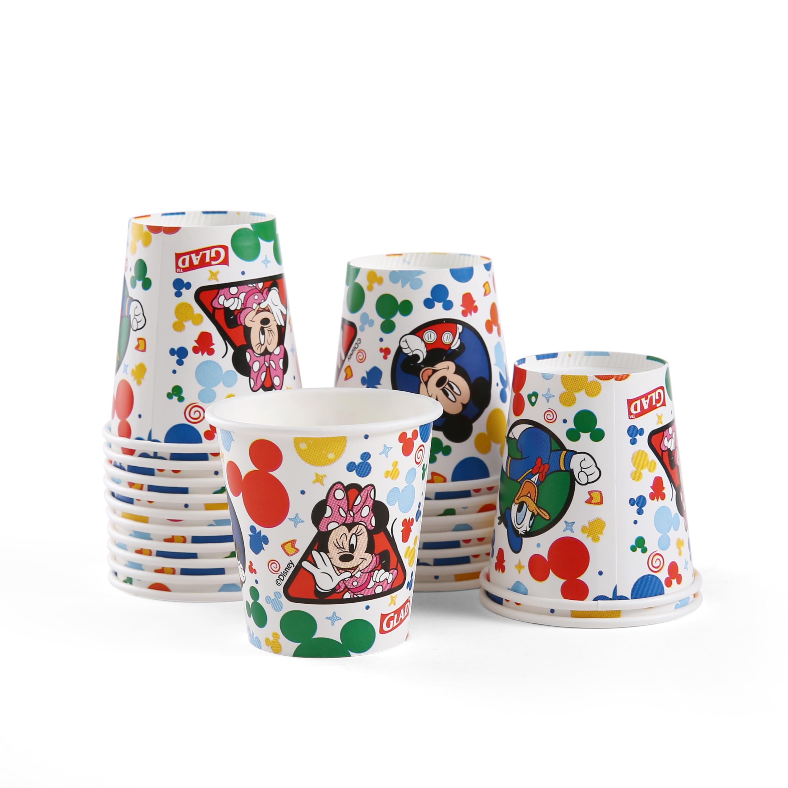 Glad for Kids believes in bringing a little fun to your everyday routine! So, when it’s time to rinse and swish, why not invite your family’s favorite characters and colors to the sink? Disney Mickey and Friends Mini Paper Bathroom Cups are the perfect kid-friendly size, measuring just 2.25 inches tall and holding 3 ounces of fluid. And because they’re from Glad for Kids, parents can trust that they are soak-proof and sturdy. This pack contains 20 mini paper cups adorned with vibrant designs of Mickey Mouse, Minnie Mouse, Donald Duck, Daisy, Goofy, and Pluto, bringing a touch of fun to every rinse. These bathroom paper cups are specifically designed for rinsing the mouth after brushing teeth or using mouthwash. Made for daily use, they're disposable for effortless cleanup, ensuring a hygienic experience every time.Not just for daily use, these mouth rinse cups are also perfect for parties, or any occasion where a sprinkle of fun is desired.Make oral hygiene fun and captivating for your child with Disney Mickey and Friends Mouth Rinse Cups. Whether for daily use or special occasions, these mini paper cups add charm and convenience to every rinse.