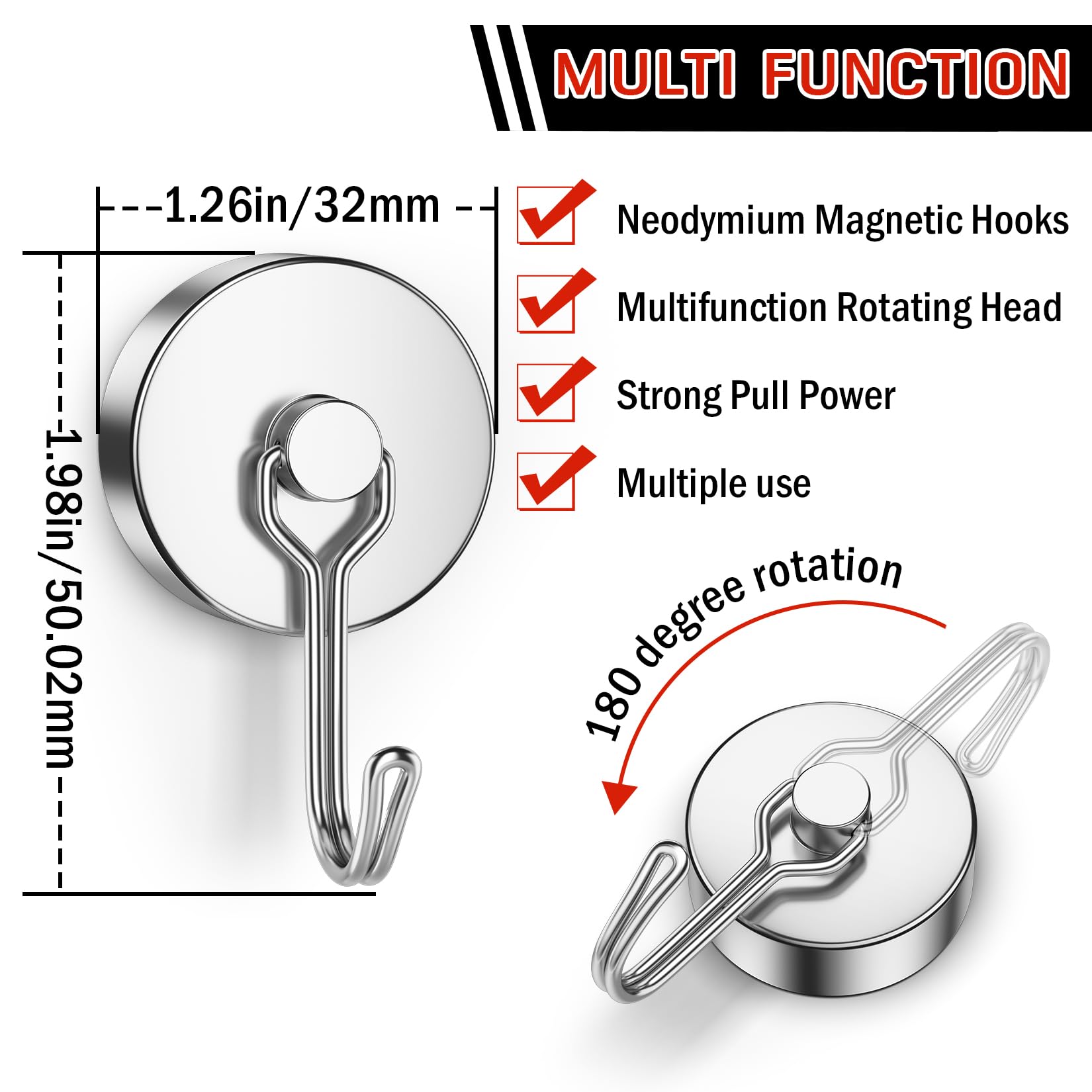 Strong Magnetic Pull: Each Swivel Swing Magnetic hook delivers up to 30lbs+ of vertical holding force under ideal conditions. Please note: when used horizontally, the magnetic strength may decrease by approximately two-thirds. For best results, attach to flat, smooth, and clean metal surfaces to ensure maximum grip.