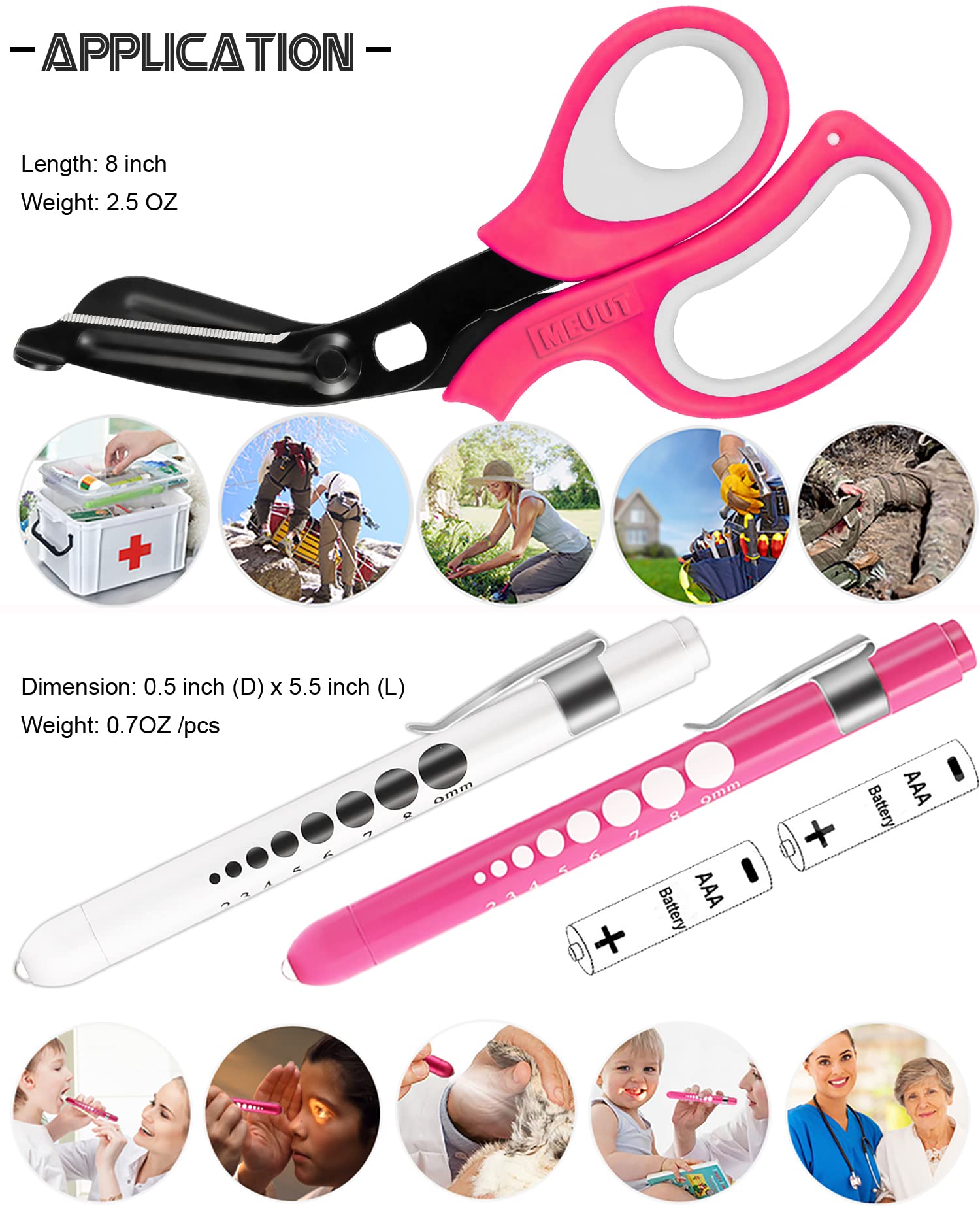 【EASY TO USE】: The compacted trauma shear designed with connected hole to take. Penlights designed with push-button on/off switches and pocket clip. Keep them within reach at all times with you!