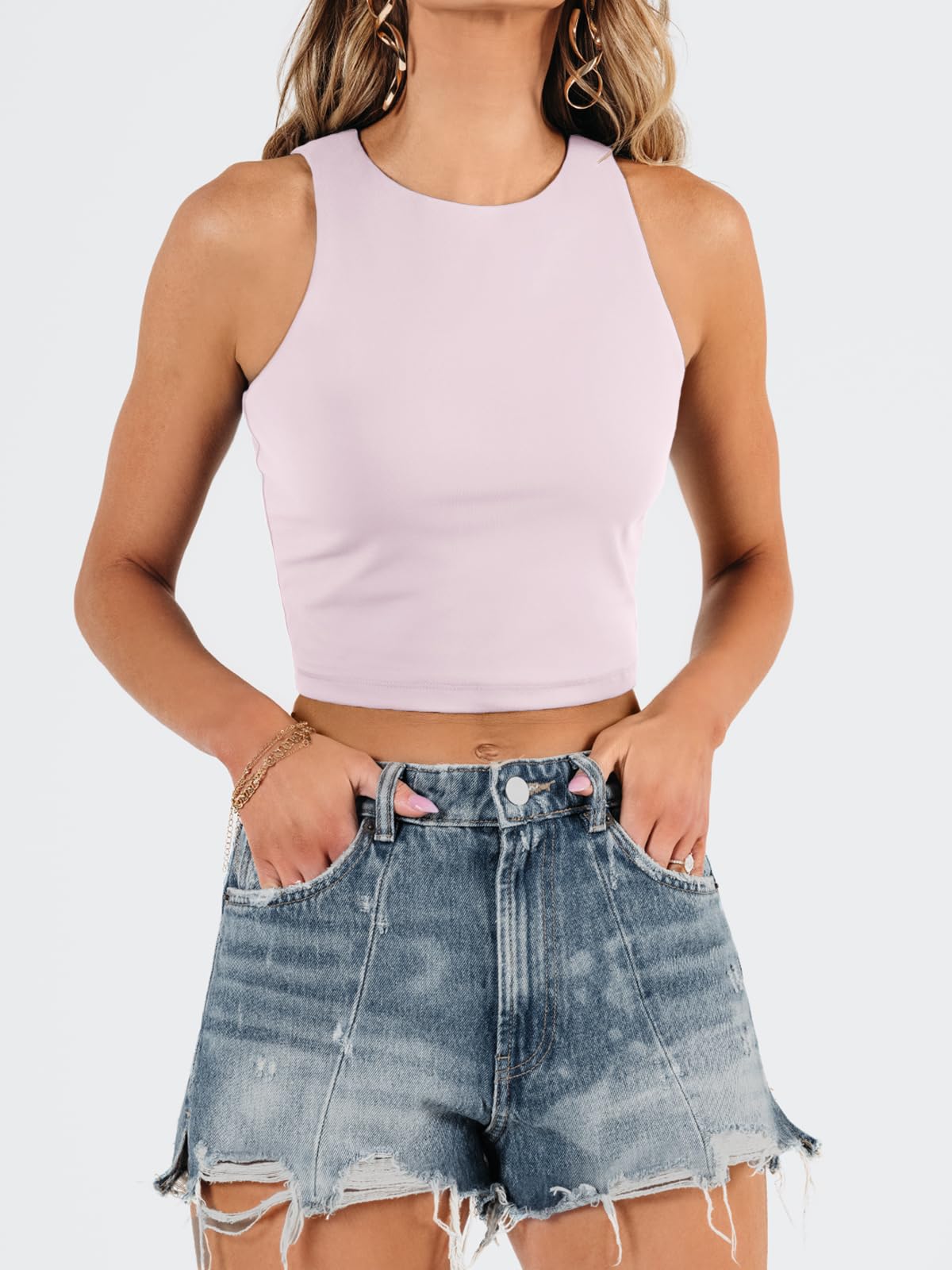 Fashion Design: Double layer of this crop top can wear without bra,and the material also good for work out sports,high neck design and crop top style,basic,fitted,casual style,crew neck ,sleeveless, slim fit