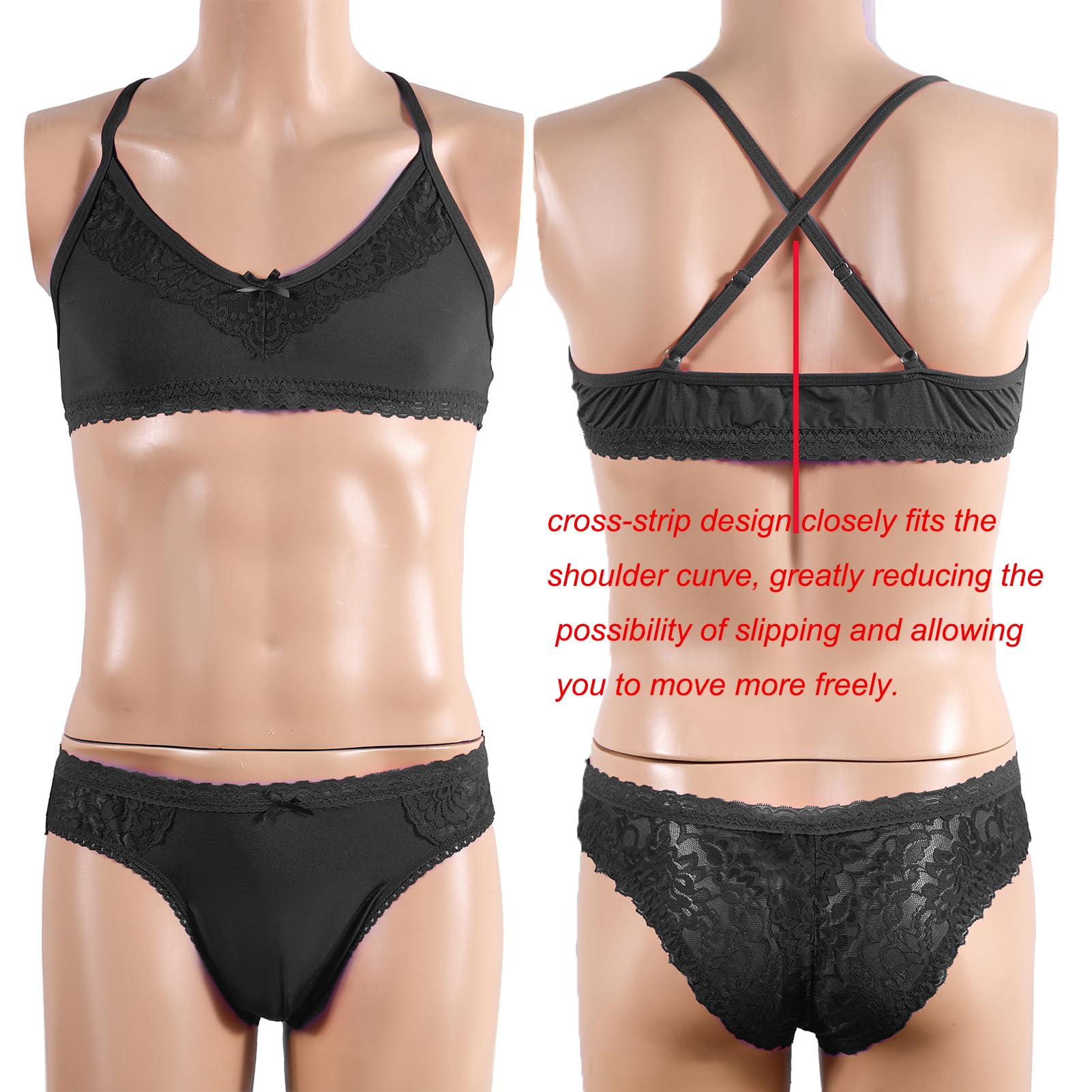Bra materical is 90% Nylon, 10% Spandex,very soft, comfortable and breathable ,and underwear matericai is lace ,it is vey sexy .fit perfectly your body and the strap around the neck holds everything in the proper spot. Cross band design straps are not easy to slip.