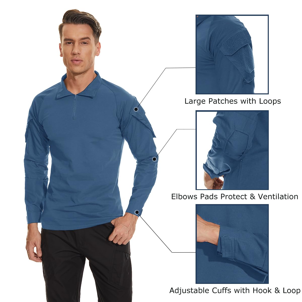 【Adjustable Personalized Designs】: This tactical shirt features multiple personalized and adjustable designs, including a 1/4 smooth zip and windproof stand collar. Also, the hook & loop cuffs improve the range of motion. Additionally, there are large patches on both arms for personalized patches, and there is a designated area for inserting elbow pads (not included) to provide extra protection and ventilation.