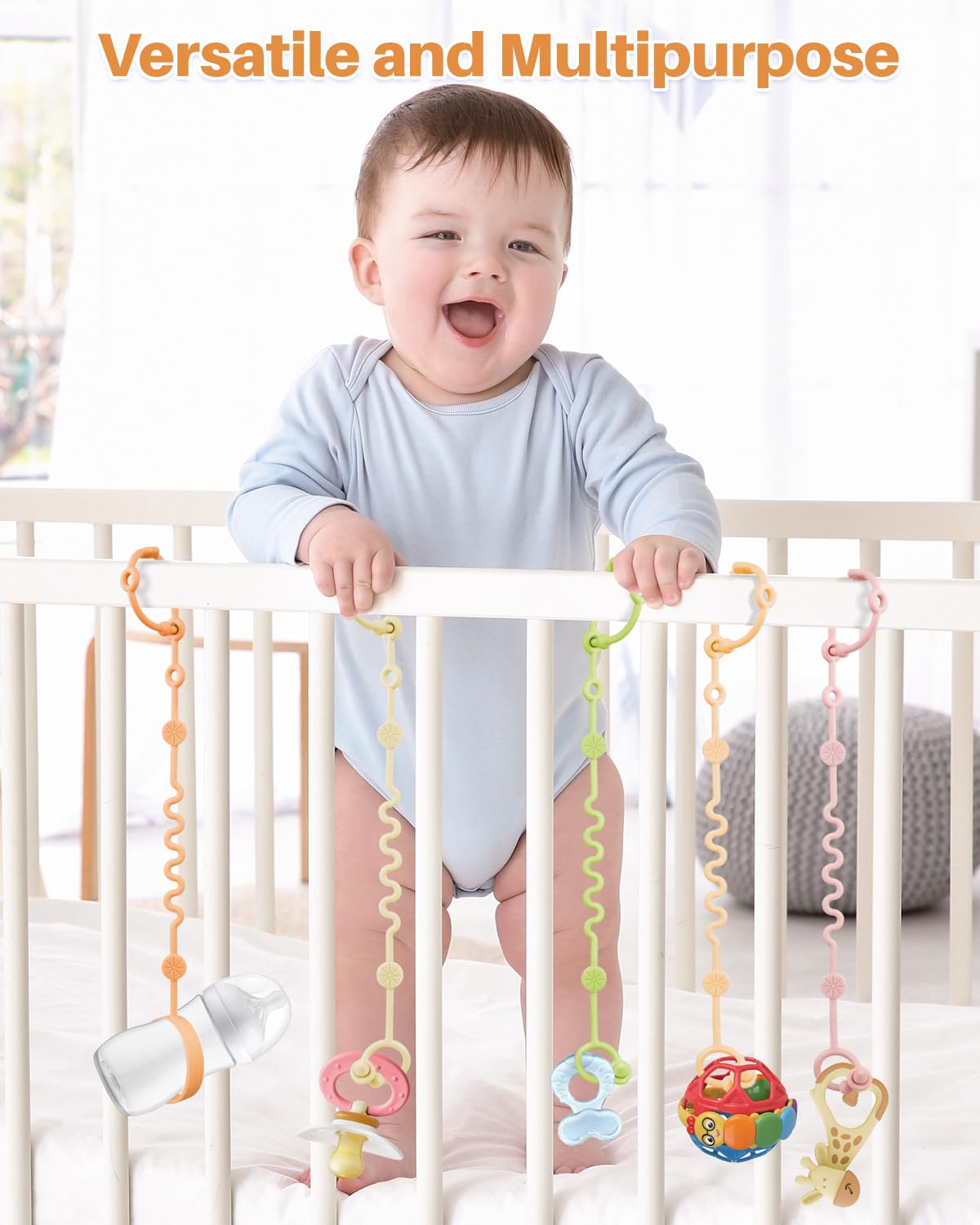 Versatility at Its Best: baby travel essential can be used for strollers, baby high chairs, pacifier clips, teethers, car seat toys, baby sucking toys, sippy cups, and baby cribs. They can be taken out to play at any time, whether the baby is eating, crying, bathing, or traveling. Say goodbye to dropping and searching for misplaced baby essentials.