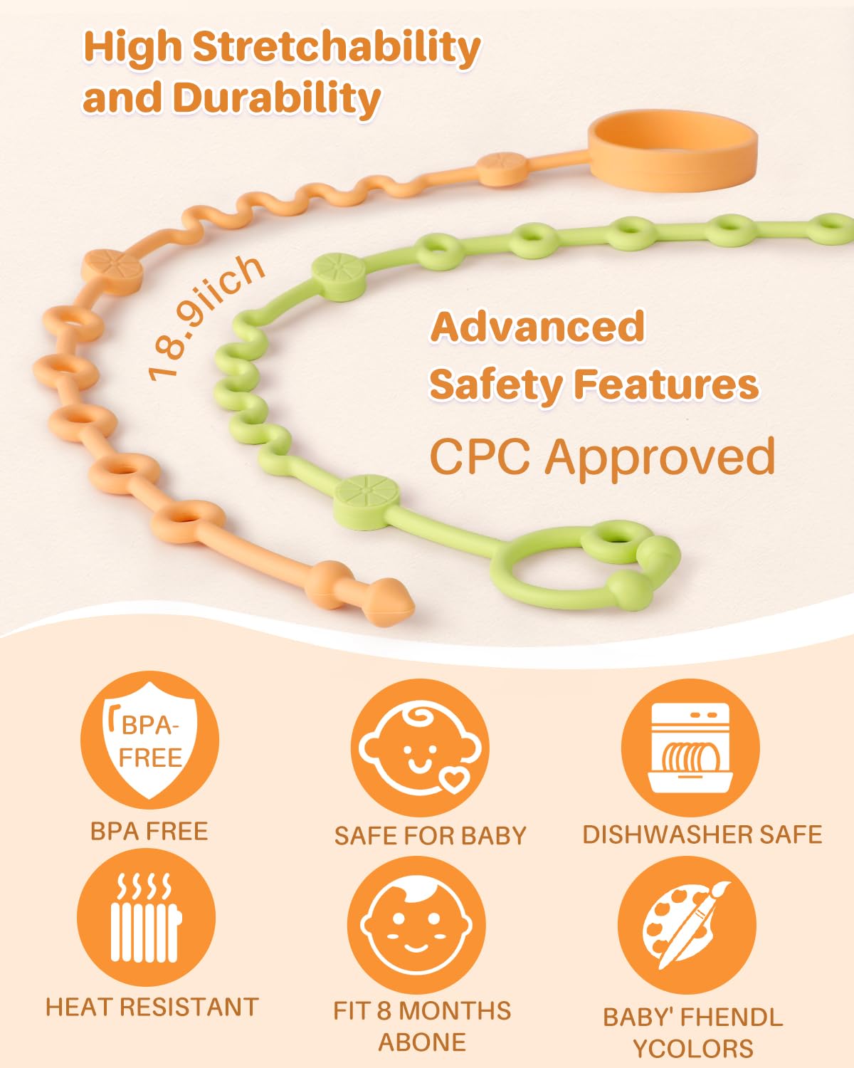 Advanced Safety Toy Straps for Baby - Our baby toy strap is made of food-grade silicone, certified to pass a 15-pound tensile strength test. It is BPA-free, lead-free, phthalate-free, tasteless, and non-toxic. The set includes 4pcs fixed stroller accessories Leashes and 1pc bottle toy belt that you can choose from at will.