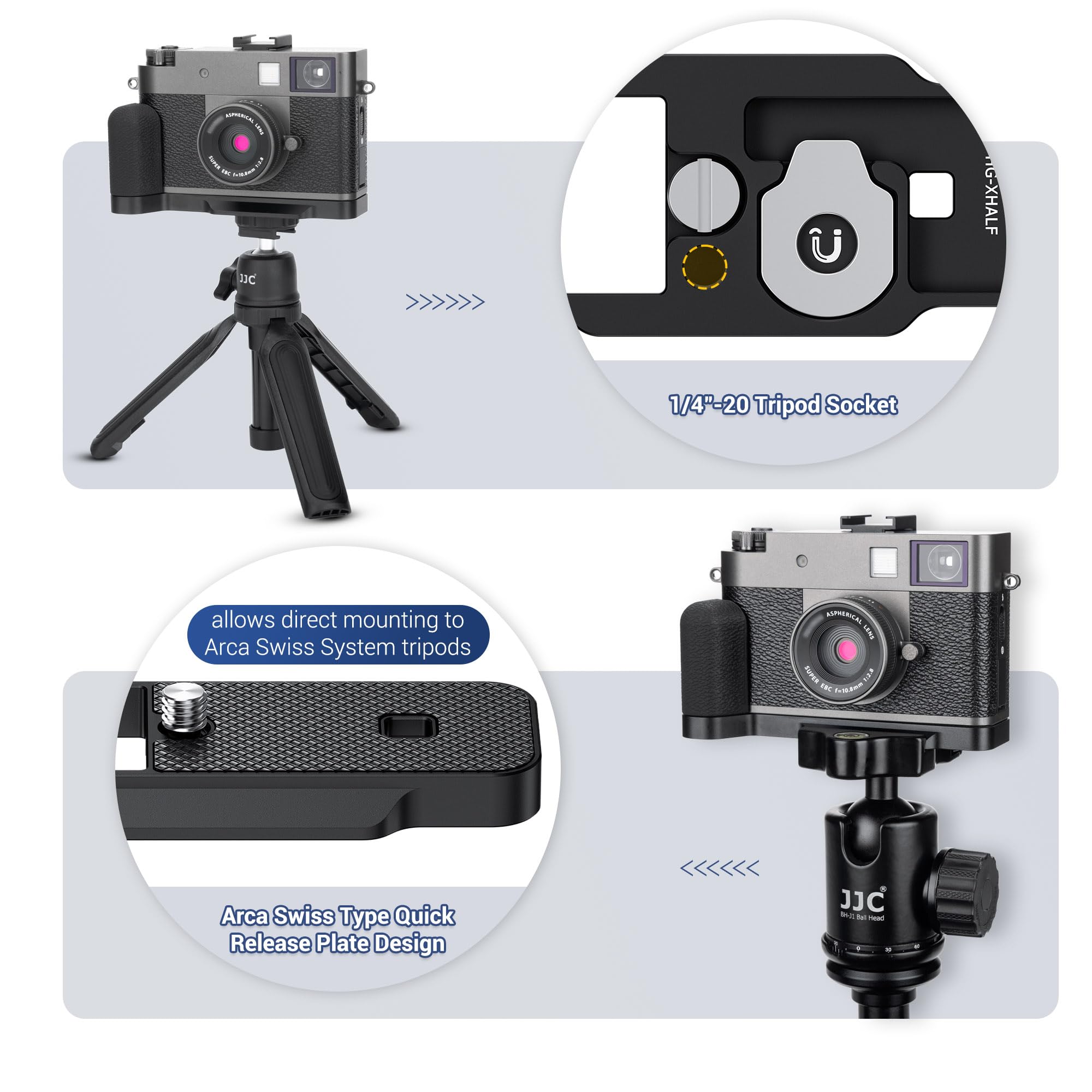 Quick Device Switching: This X Half hand grip adopts an Arca-Type quick release plate design and you can slide this grip with the camera onto an Arca-Type ball head directly. The bottom of the l shape handgrip also has a 1/4"-20 screw hole for mounting the camera to other tripods or devices.