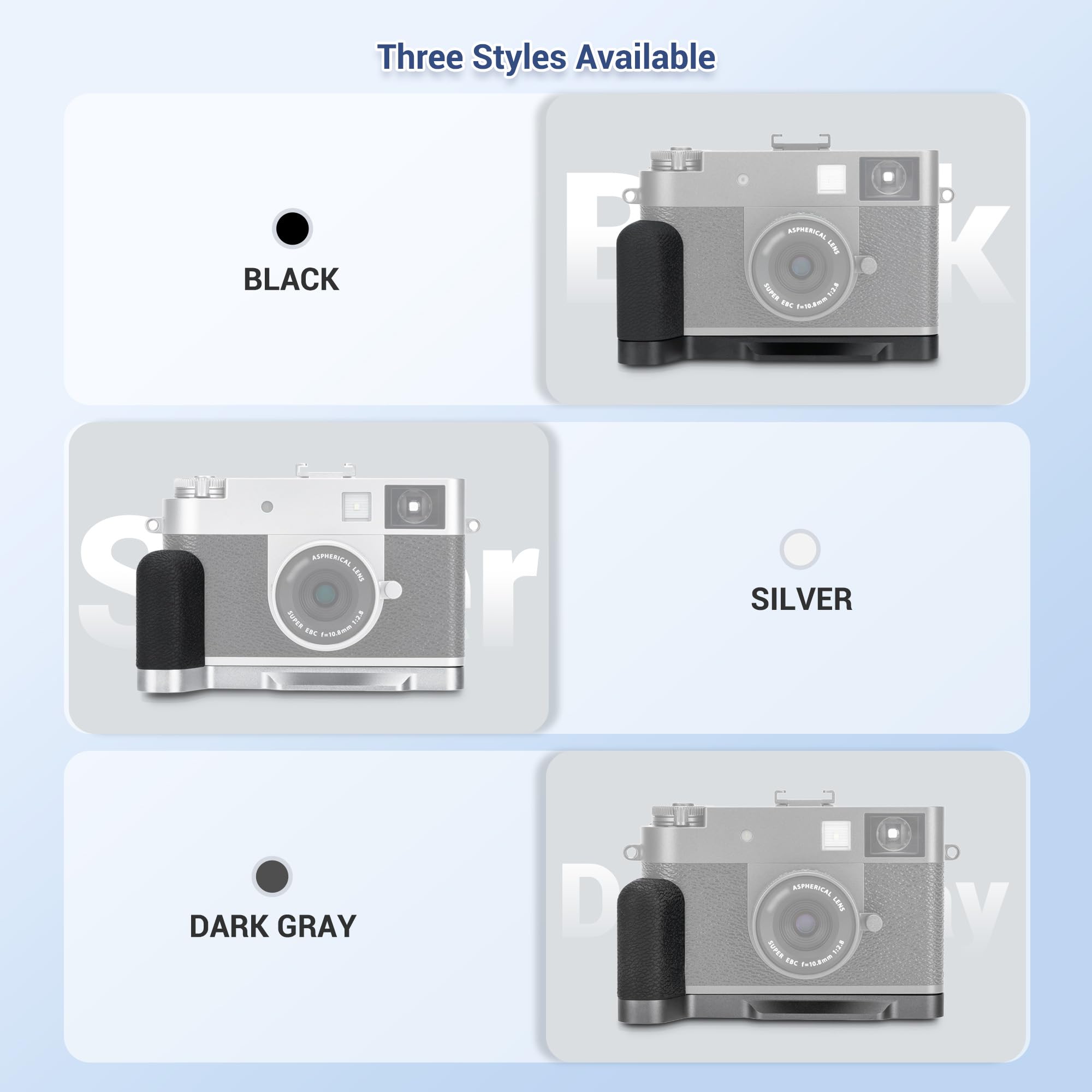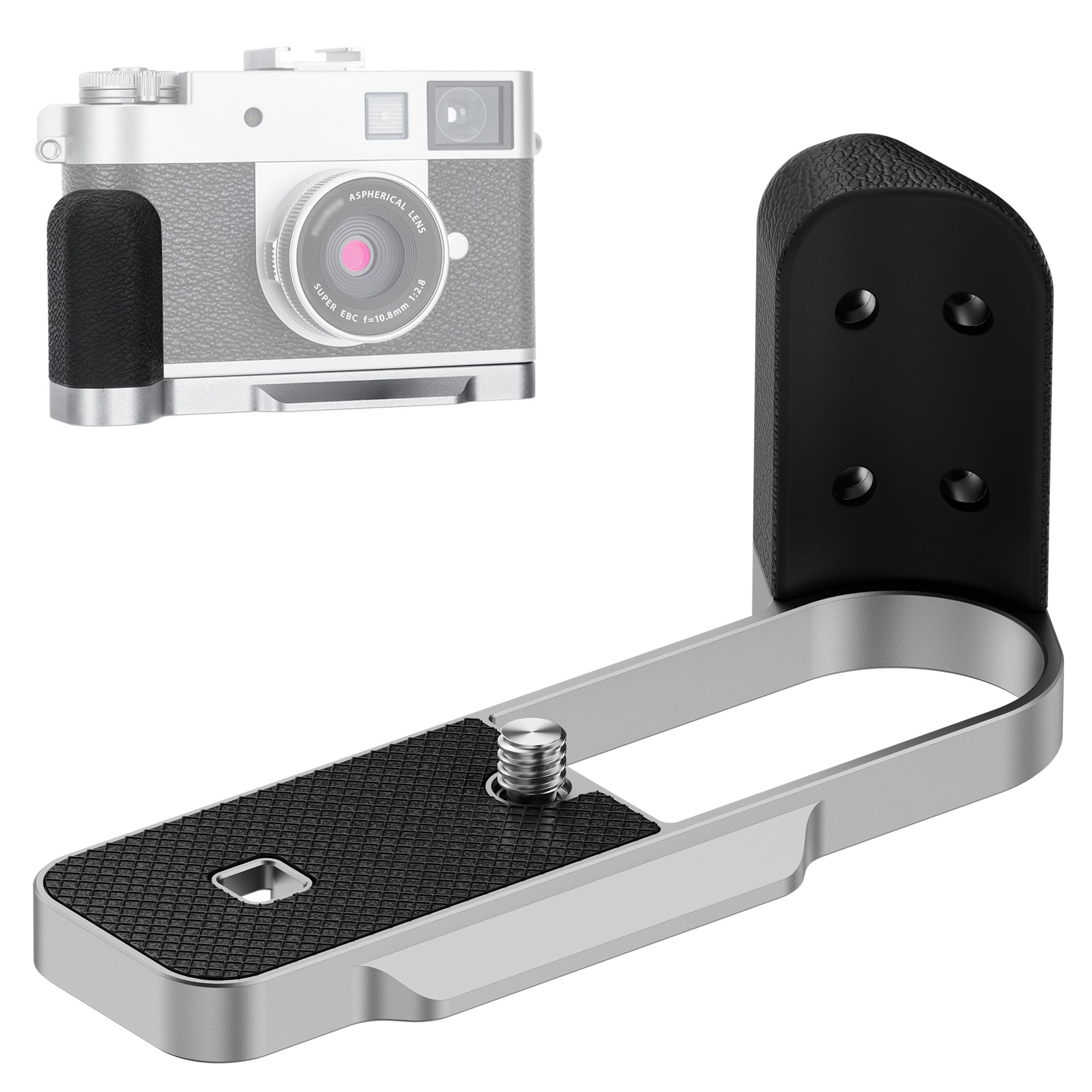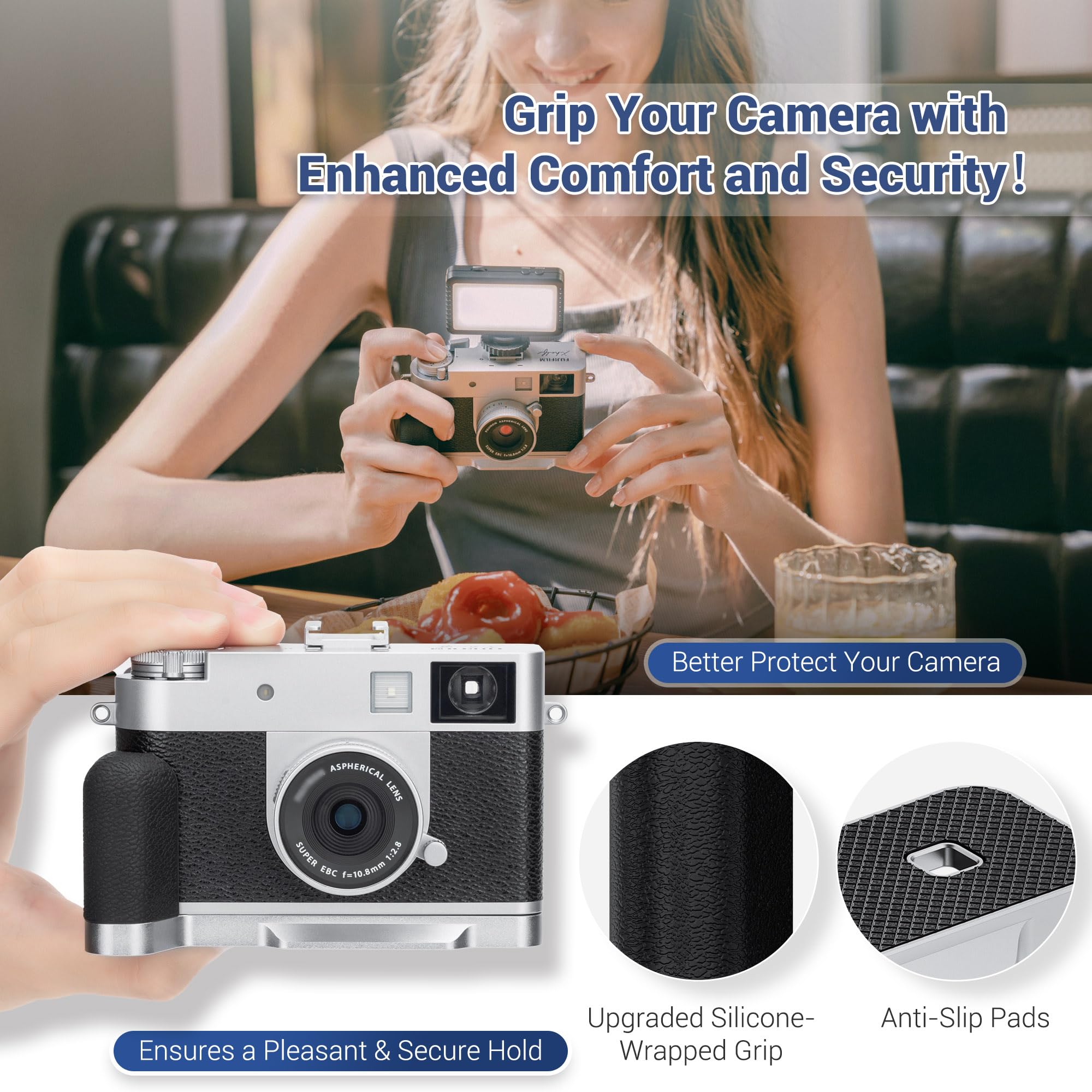 Safe & Comfortable: Made of aluminium alloy, it is sturdy and durable. The soft silicone on the surface of the grip is not only non-slip but also comfortable. There is also a silicone pad at the bottom of the handle, which can increase friction and reduce the risk of camera dropping, providing a stable and secure X Half handgrip.