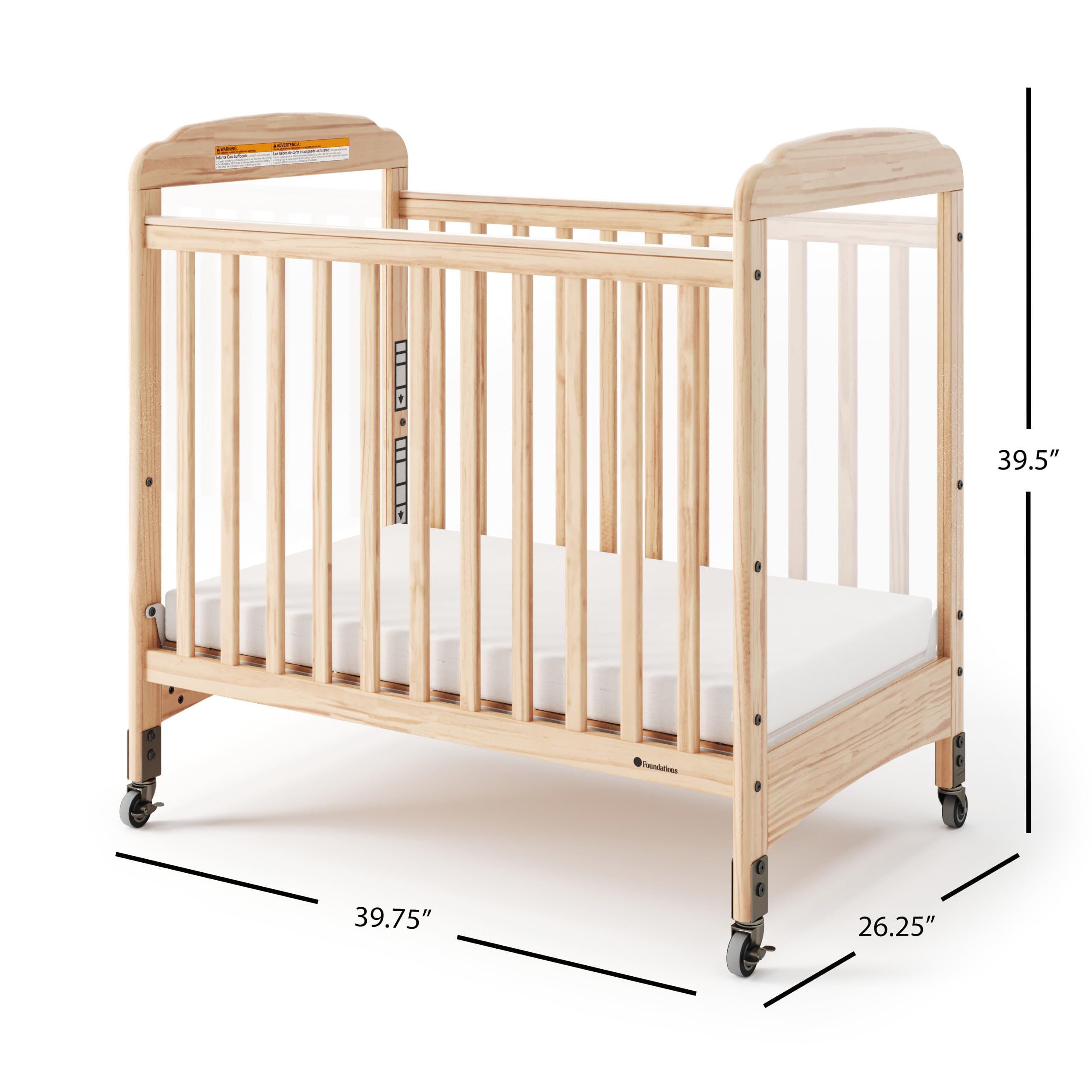 Compact Wood Crib: Durable, fixed-side compact crib design is perfect for childcare centers. Assembled dimensions: 39.75” L x 26.25” W x 42.1” H, with a weight of 50 pounds.