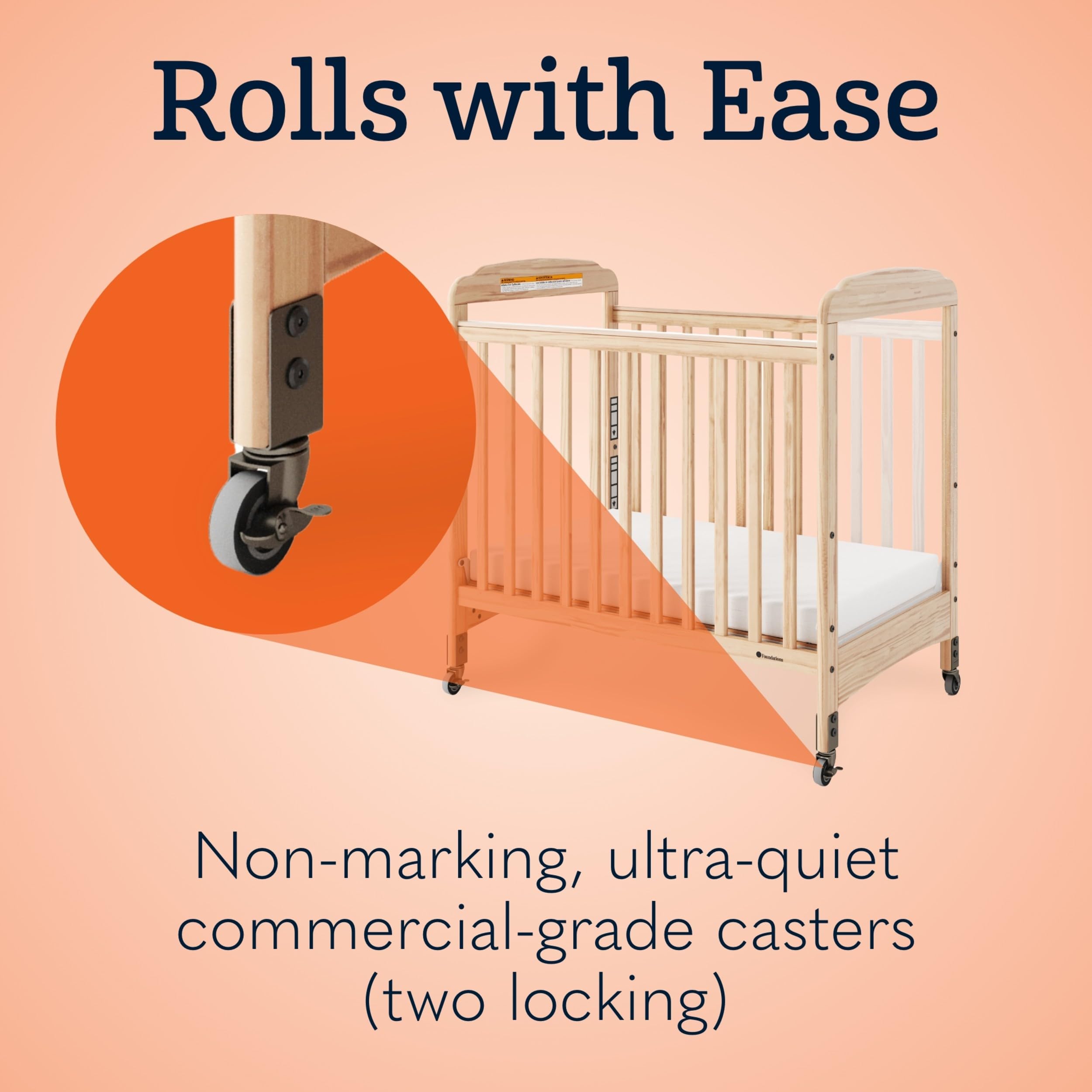 Commercial-Grade Casters: Features four 2” non-marking ultra-quiet casters, two of which lock for when the crib is in place.
