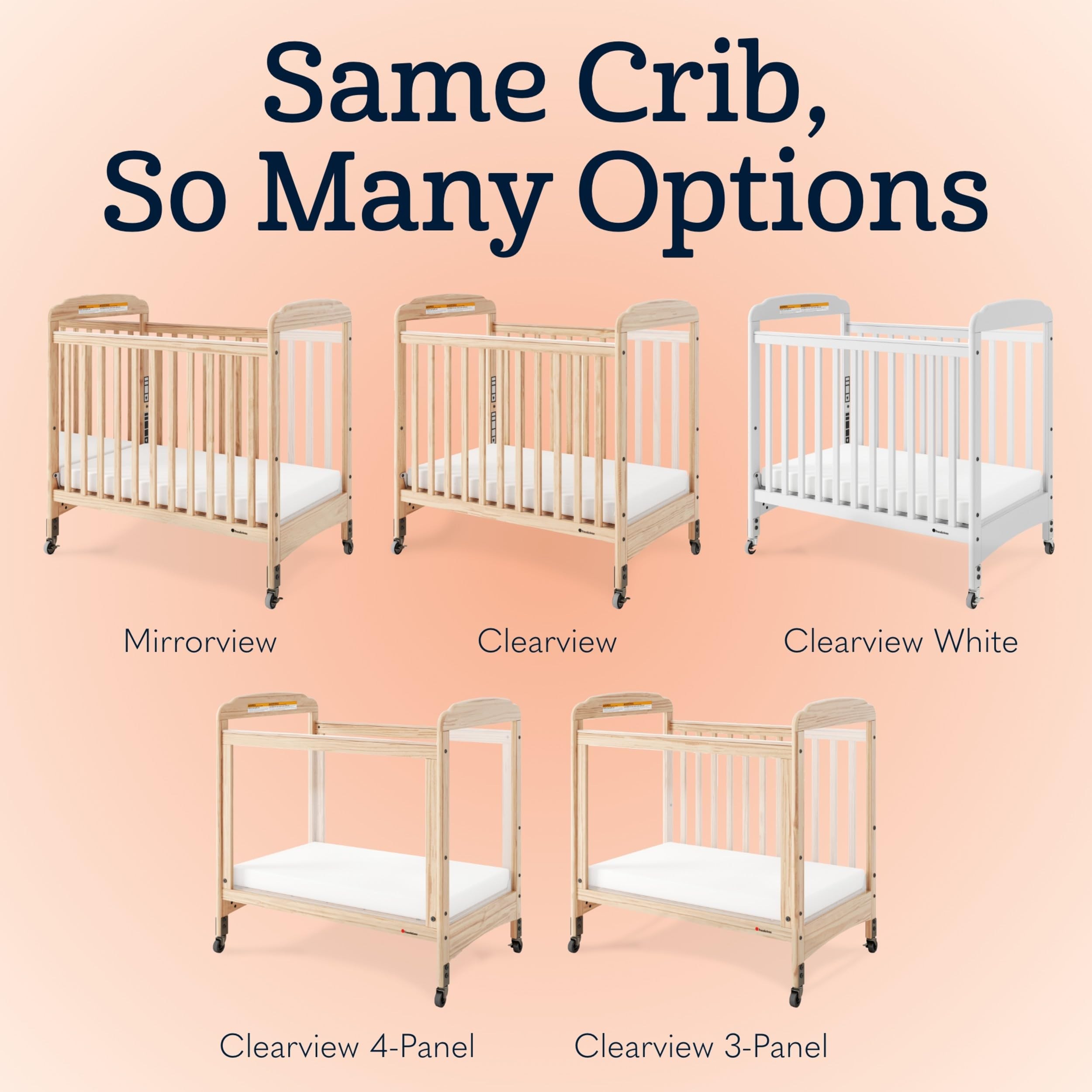 Clearview End Panels: Two Clearview end panels help maximize visibility of the infant while they are in the crib and allow caregivers to maximize room space when cribs are arranged end-to-end in a daycare.