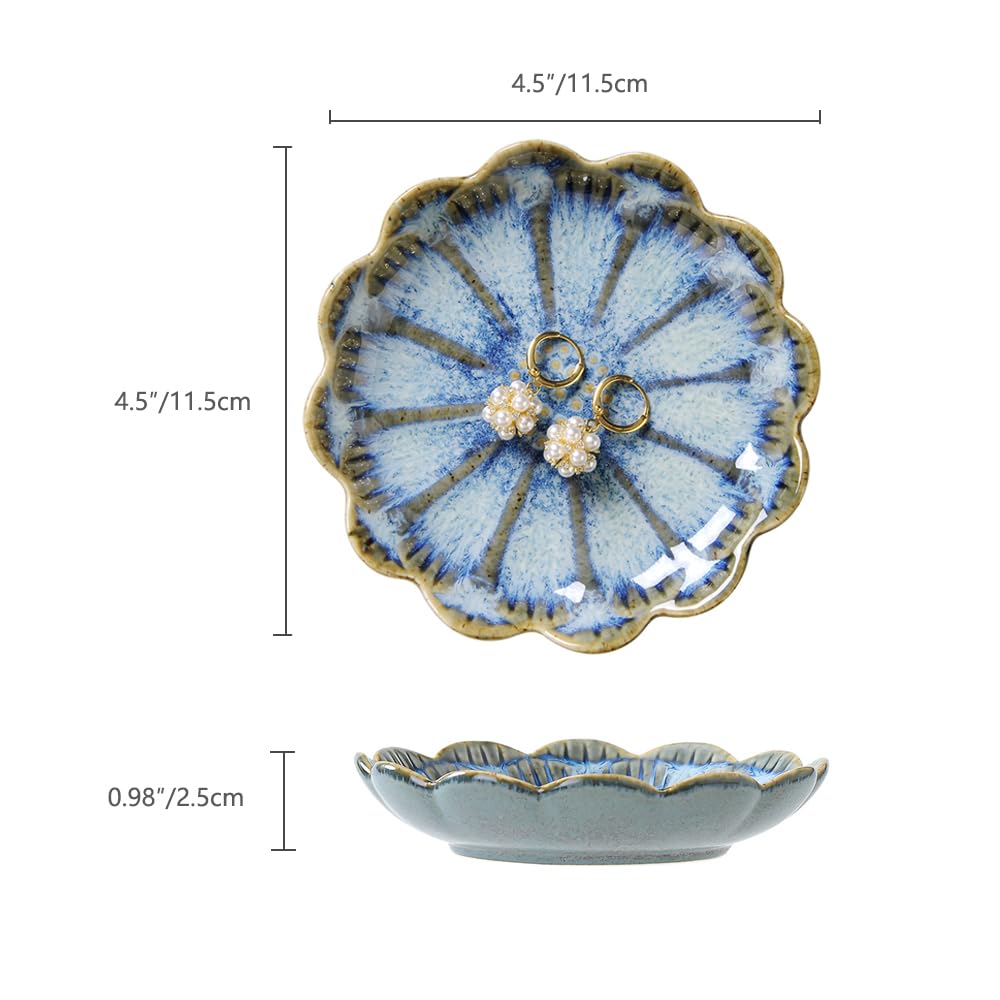All Jewelries Are NOT Included. Jewelry Bowl Dimensions: 4.3″×4.3″×0.8″ Material: High Quality Ceramic Color: Retro Blue; Weight: About 152g Shape: Lotus; Technology: Kiln process.