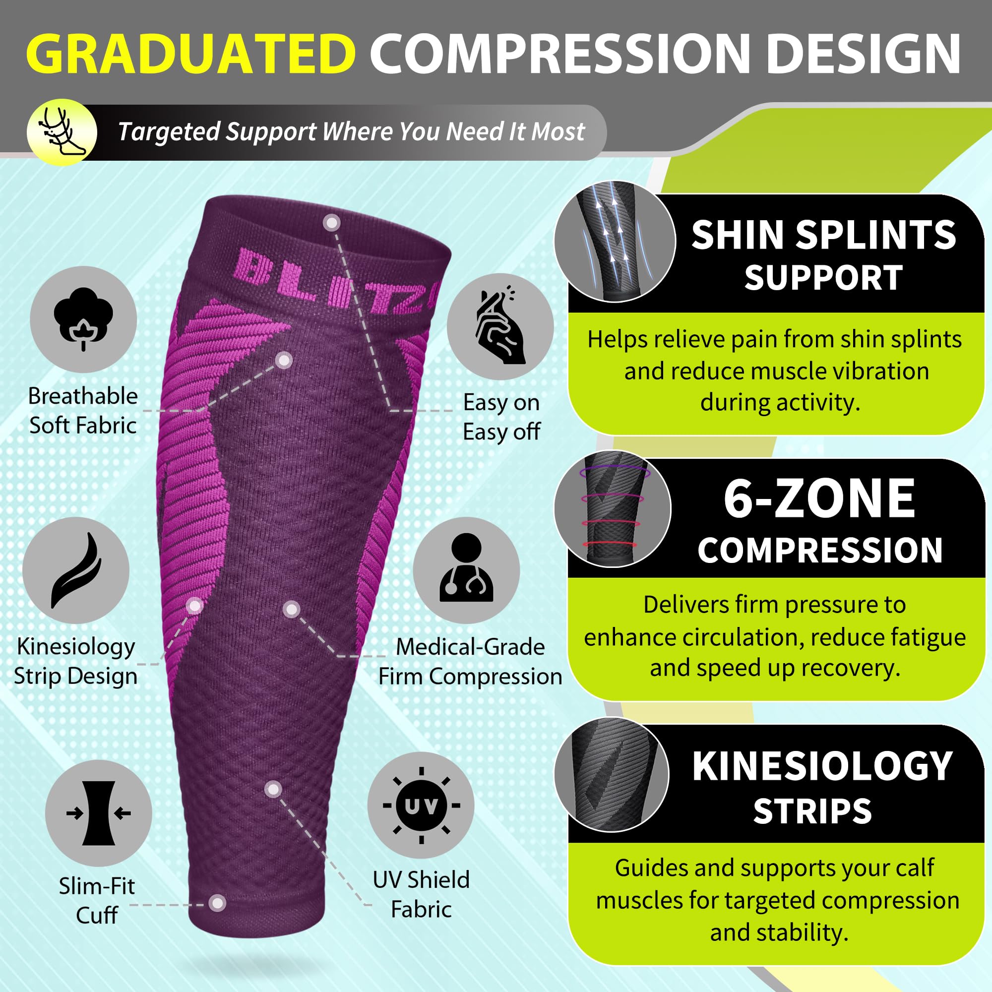 Effective Compression for Swelling & Varicose Veins Relief: The BLITZU Calf Compression Sleeves feature graduated compression to improve blood circulation, reduce swelling, and alleviate discomfort caused by varicose veins and pregnancy-related leg swelling, making them perfect for nursing mothers and individuals with circulation issues.