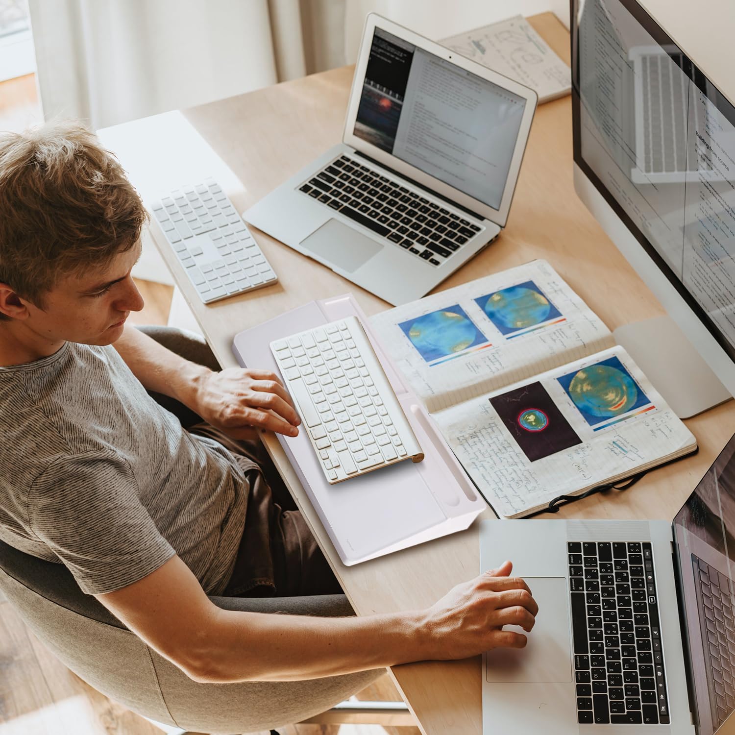 PERFECT DESIGN: Maximize your work area. The desktop whiteboard is designed to sit perfectly between a keyboard and monitor and is slope angled for comfortable reading and writing, or typing when you are using it as a keyboard stand.