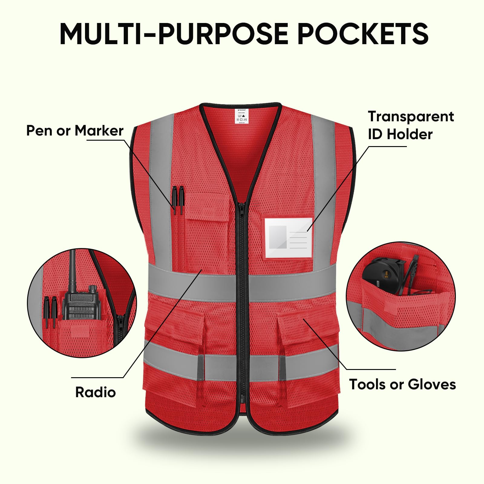 [MULTI-PURPOSE POCKETS] This high visibility vest has functional pockets built-in including a Transparent ID pocket, pen holder, radio pocket, and the 2 large pockets that can hold your tools and gloves.